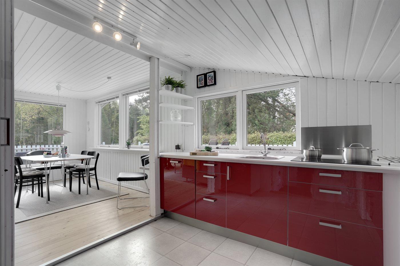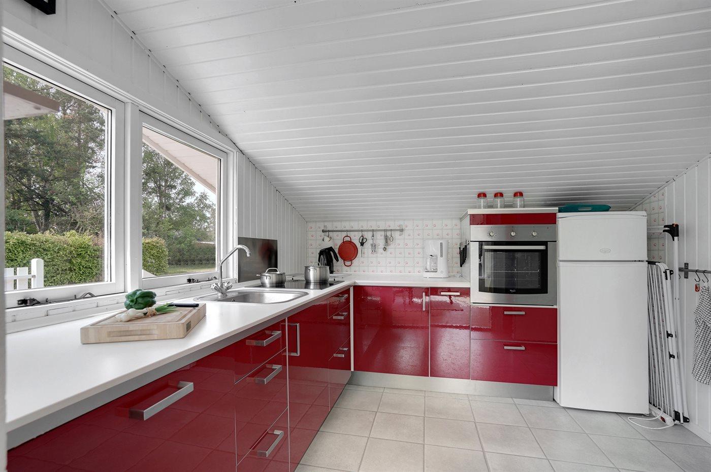Køkkenet er udstyret med 1 køleskab. Der er 4 keramiske kogeplader, varmluftovn, mikrobølgeovn samt opvaskemaskine.