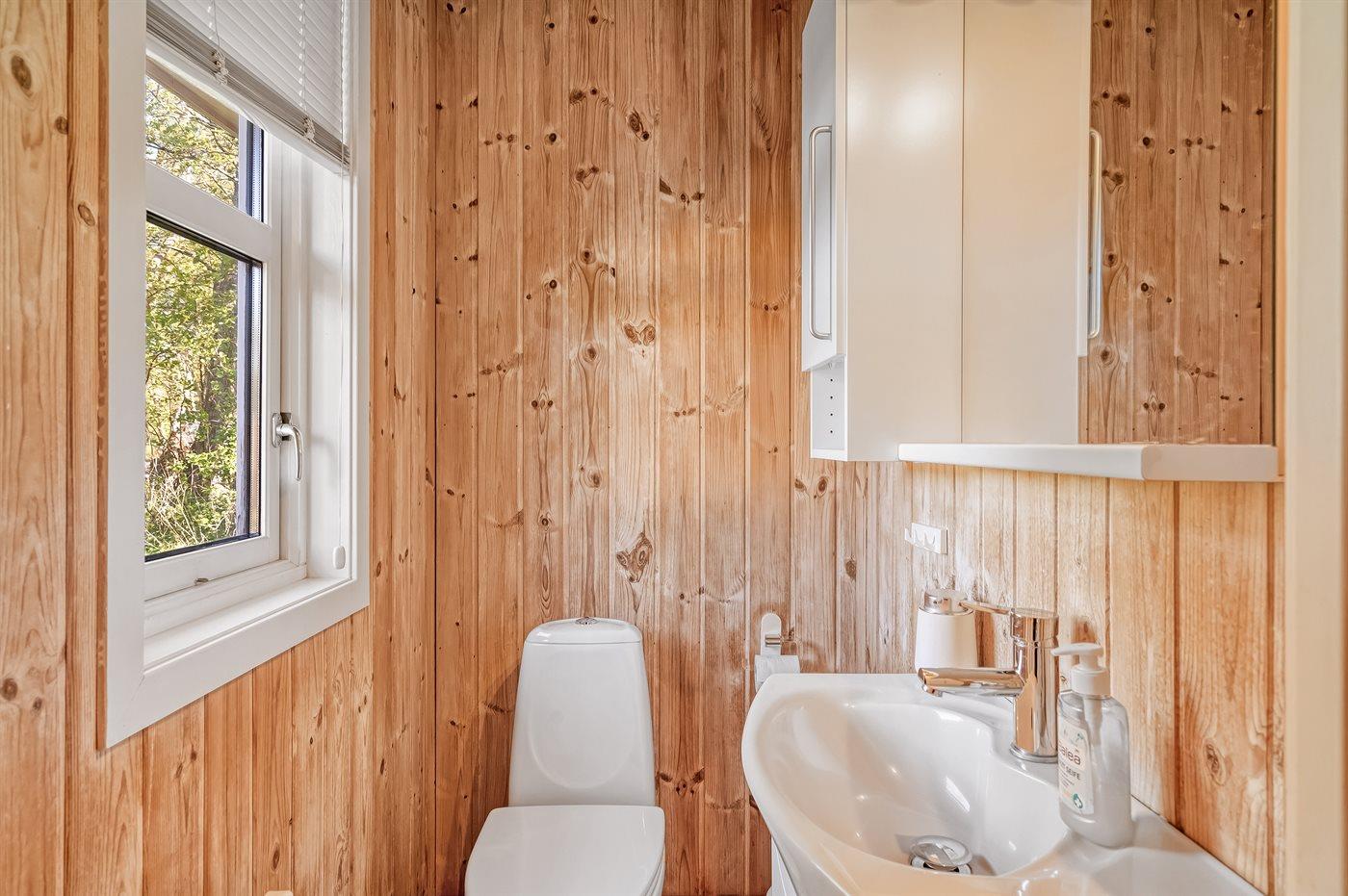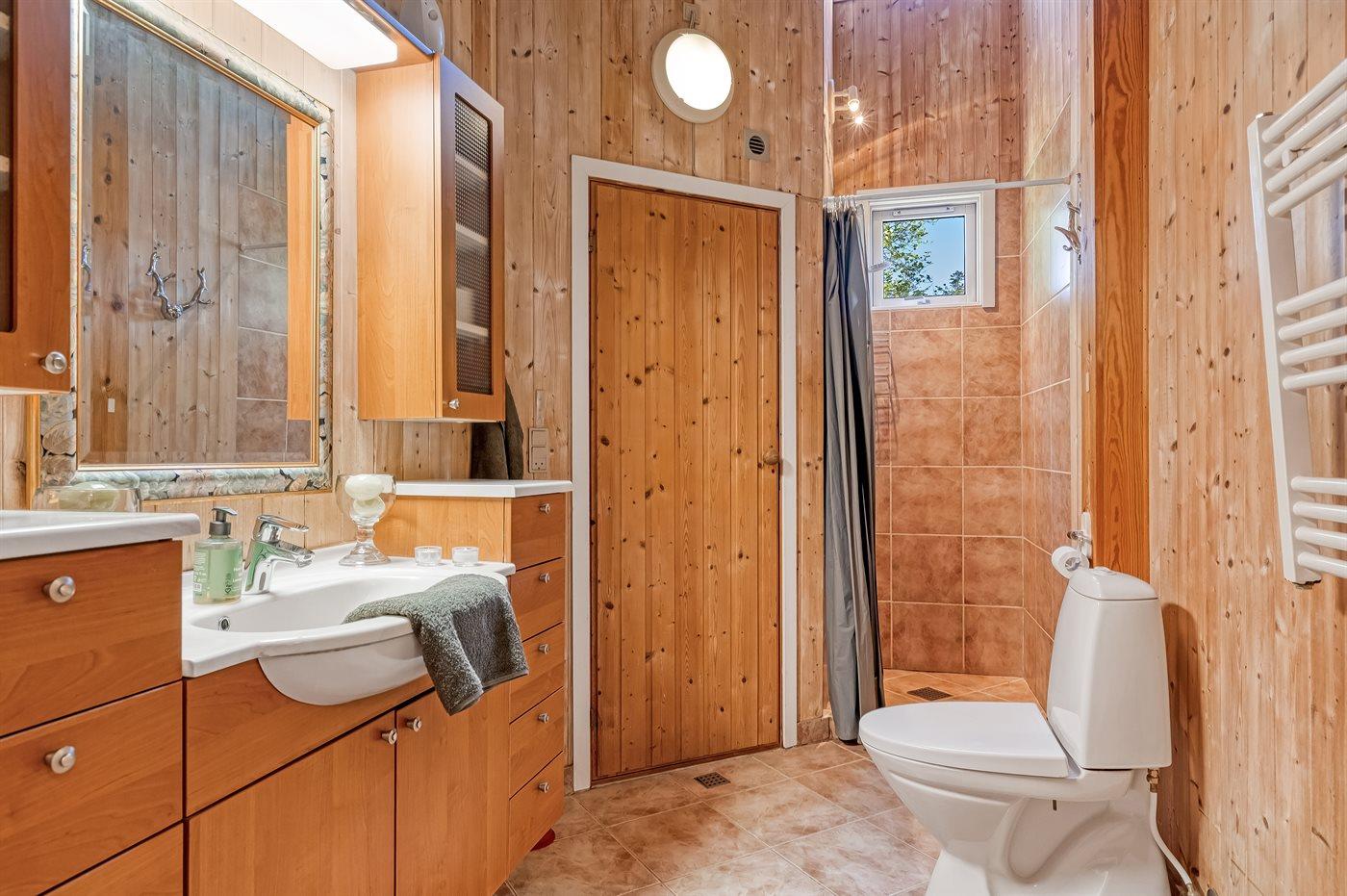 Der findes et badeværelse med bruseniche, adgang til sauna, toilet og gulvvarme samt et gæstetoilet.