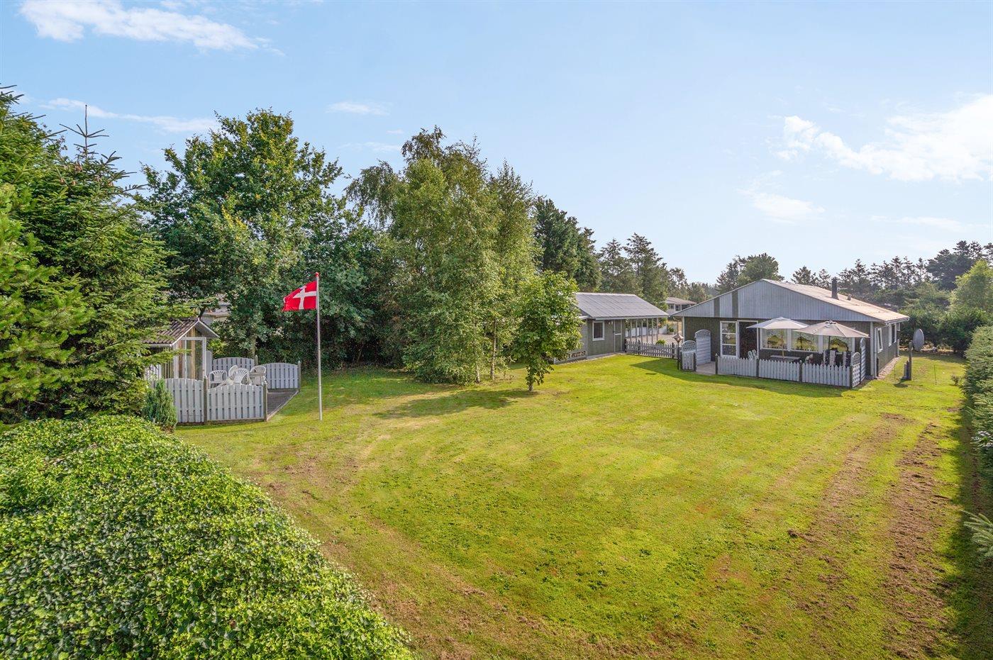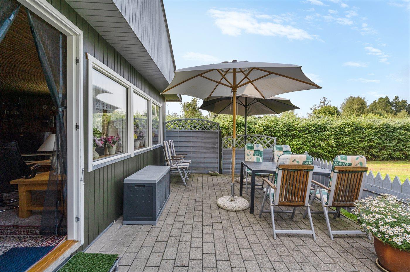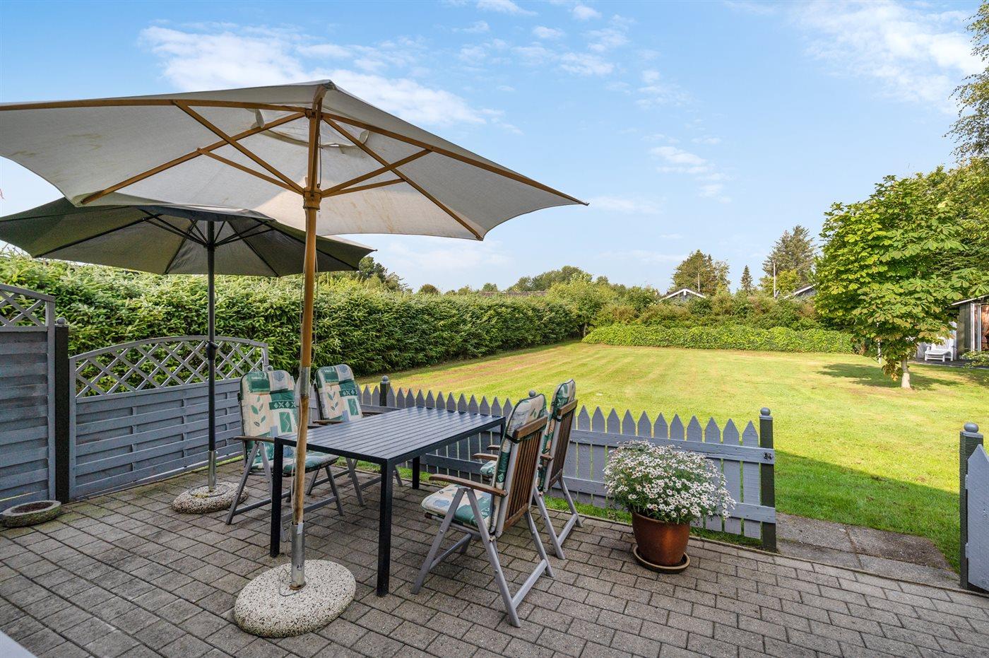 Til huset hører en skøn have med dejlige terrasser, hvor man til fulde kan nyde de skønne sommeraftener med f.eks. at tilberede et lækkert måltid mad på grillen, alt imens børnene leger på den store græsplæne.