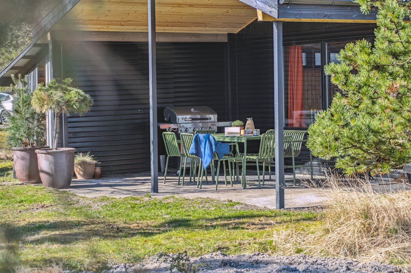Ferieboligen er beliggende på en 1206 m² stor havegrund. Der er 200 m til havet. Der er 6100 m til fjorden. Nærmeste forretning er beliggende i en afstand af 1800 m. Der er en golfbane i en afstand af 5600 m. Desuden er der 21 m² overdækket terrasse. Bålsted. Grill til rådighed. Parkering ved ferieboligen.