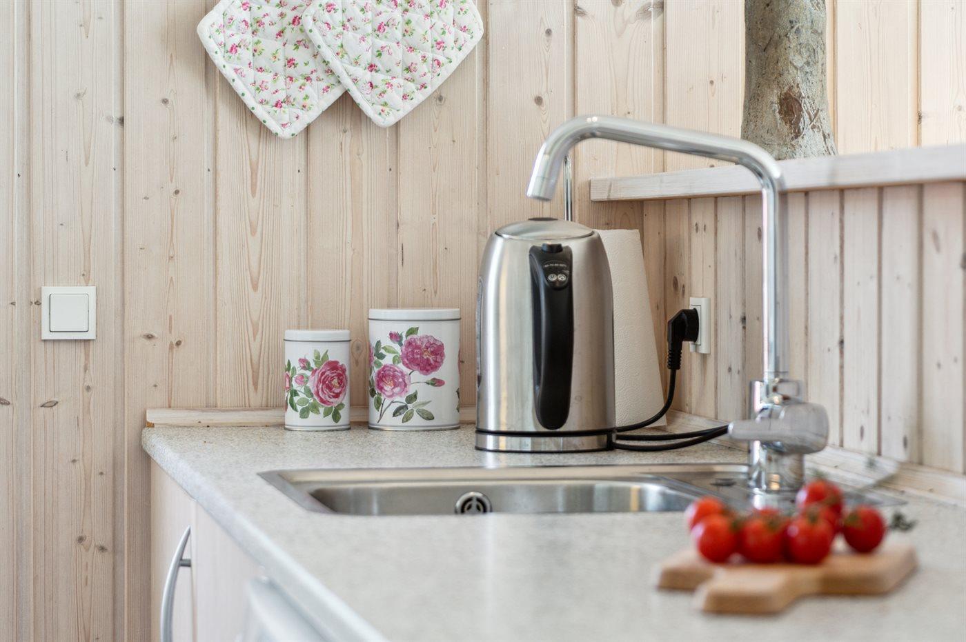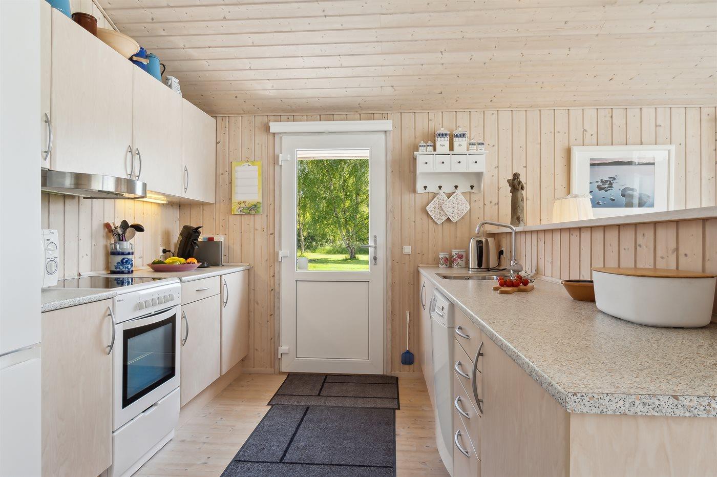 Køkkenet er udstyret med 1 køleskab. Der er 4 keramiske kogeplader, varmluftovn, mikrobølgeovn samt opvaskemaskine.