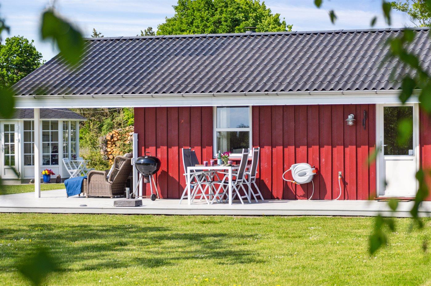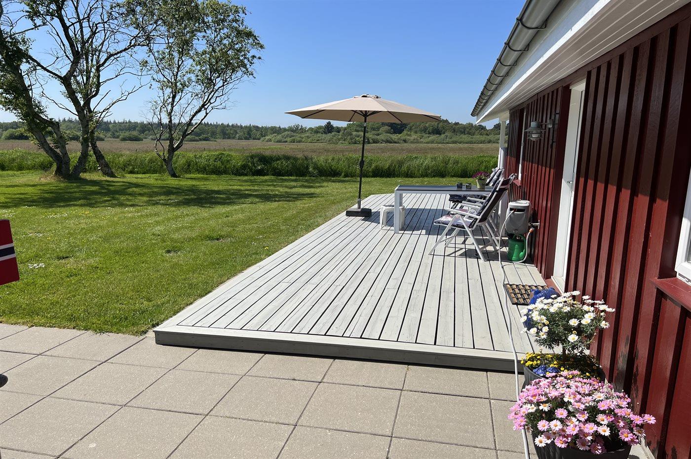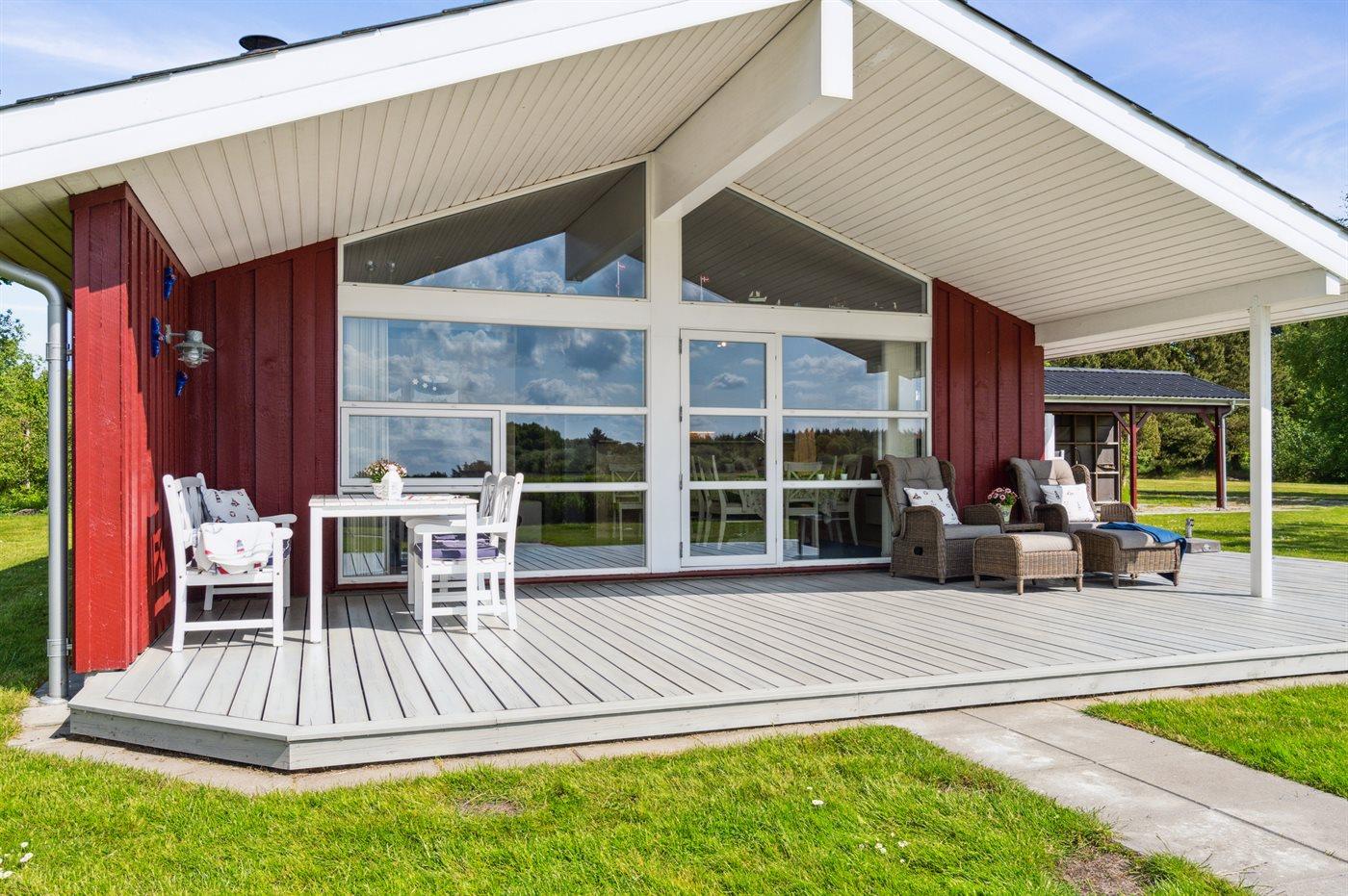 Dette særdeles velholdte og flotte sommerhus er beliggende ganske enestående med en fantastisk udsigt udover skov og marker - det er ganske enkelt svært at finde bedre. Sommerhuset ligger helt ugeneret på en stor grund i disse meget rolige og smukke omgivelser. Udsigten er virkelig fangende, og man kan sidde på den store terrasse i timevis og nyde udsigten. Den skønne udsigt omkranser nærmest sommerhuset og er lige så unik inde fra selve sommerhuset. Terrassen har også en overdækket del, som kan forlænge de skønne sommeraftener.