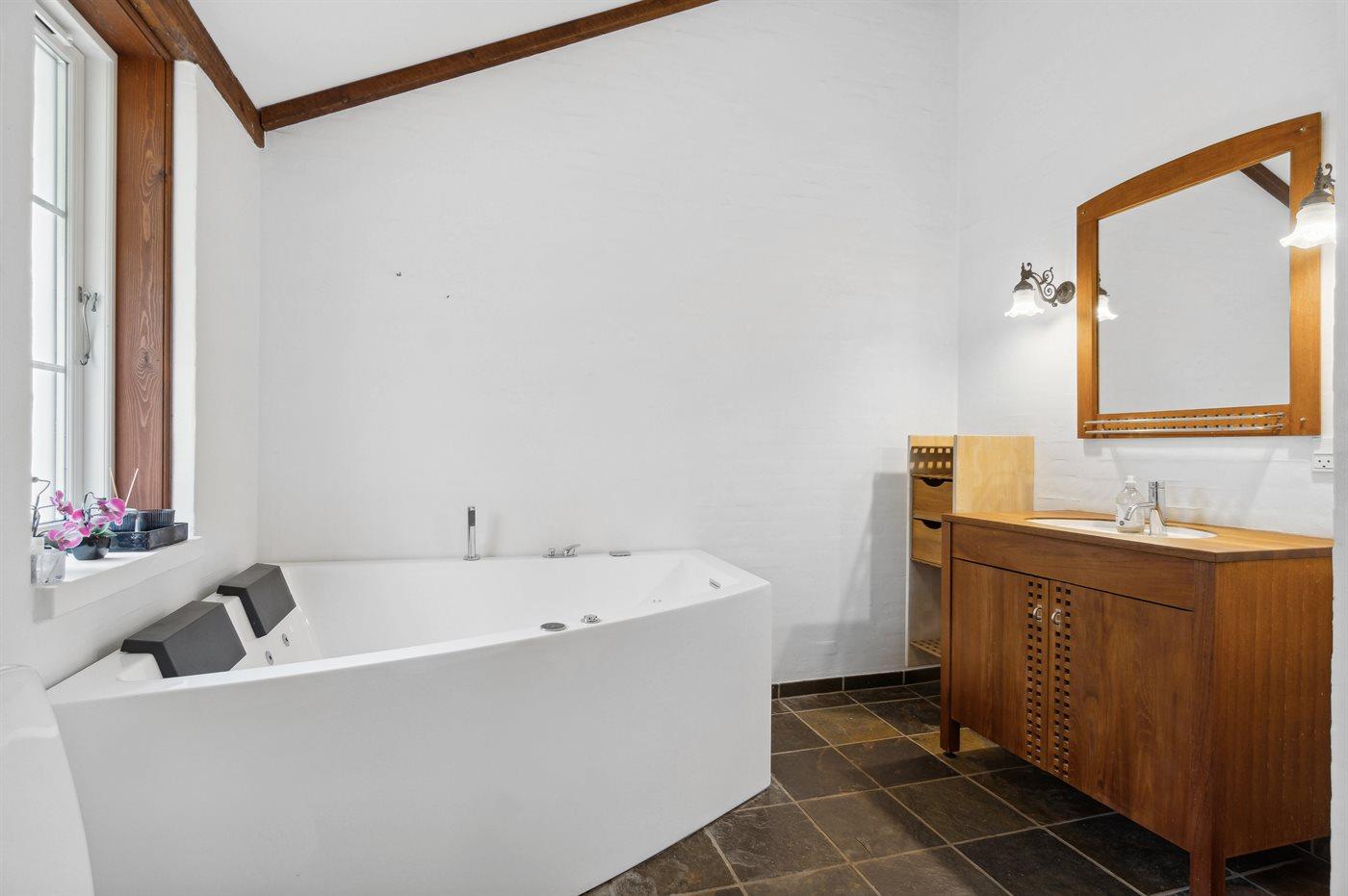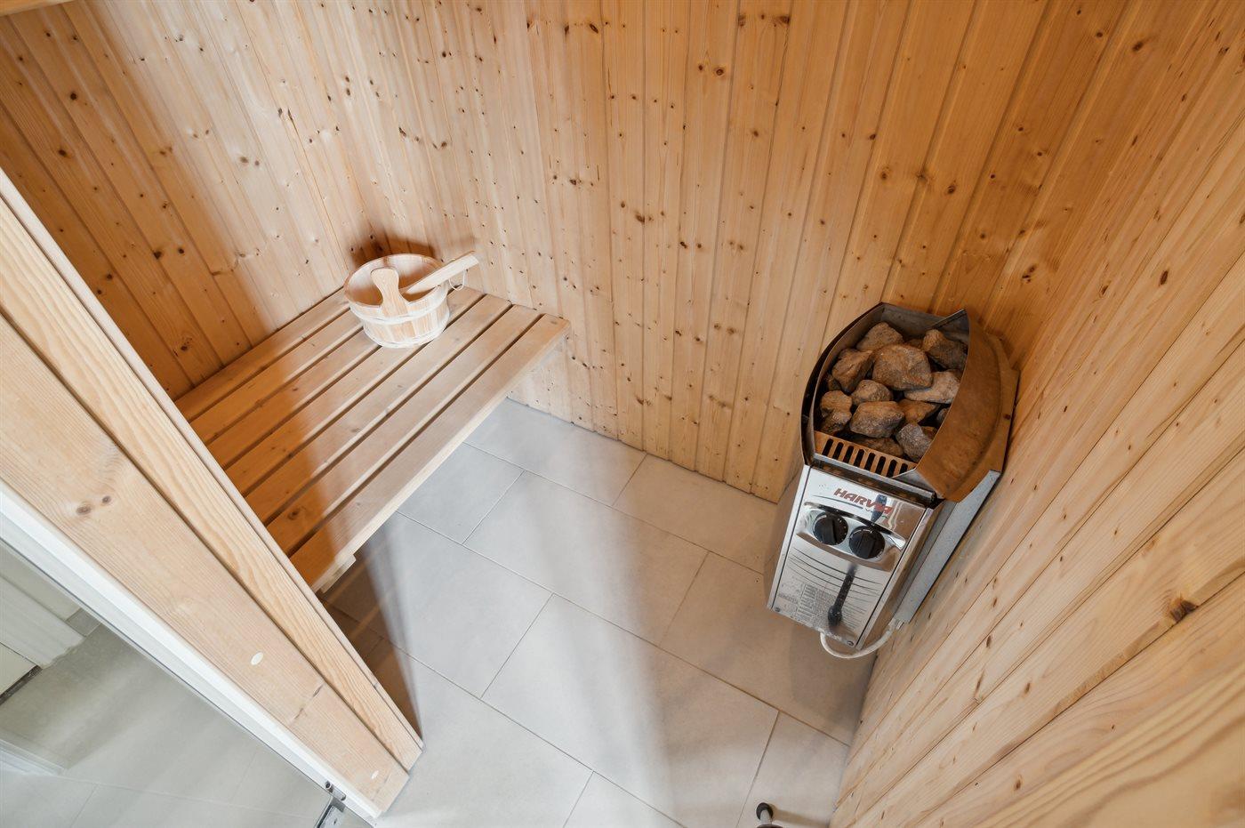 Der er 2 badeværelser med bruseniche og 2 toiletter. Der er gulvvarme på 2 badeværelser. I saunaen er der mulighed for afslapning.