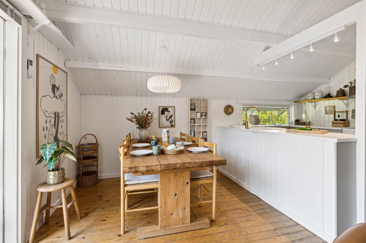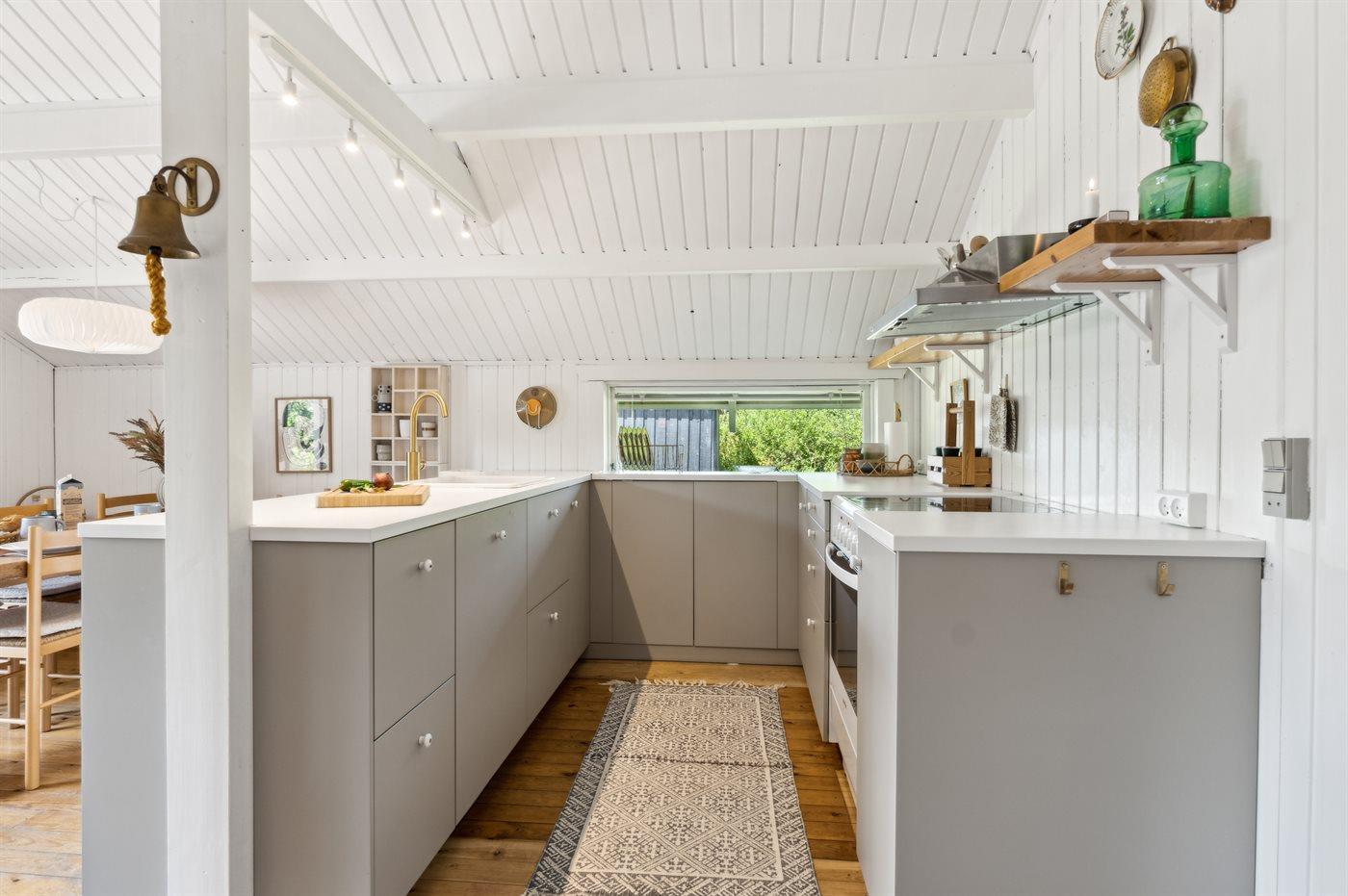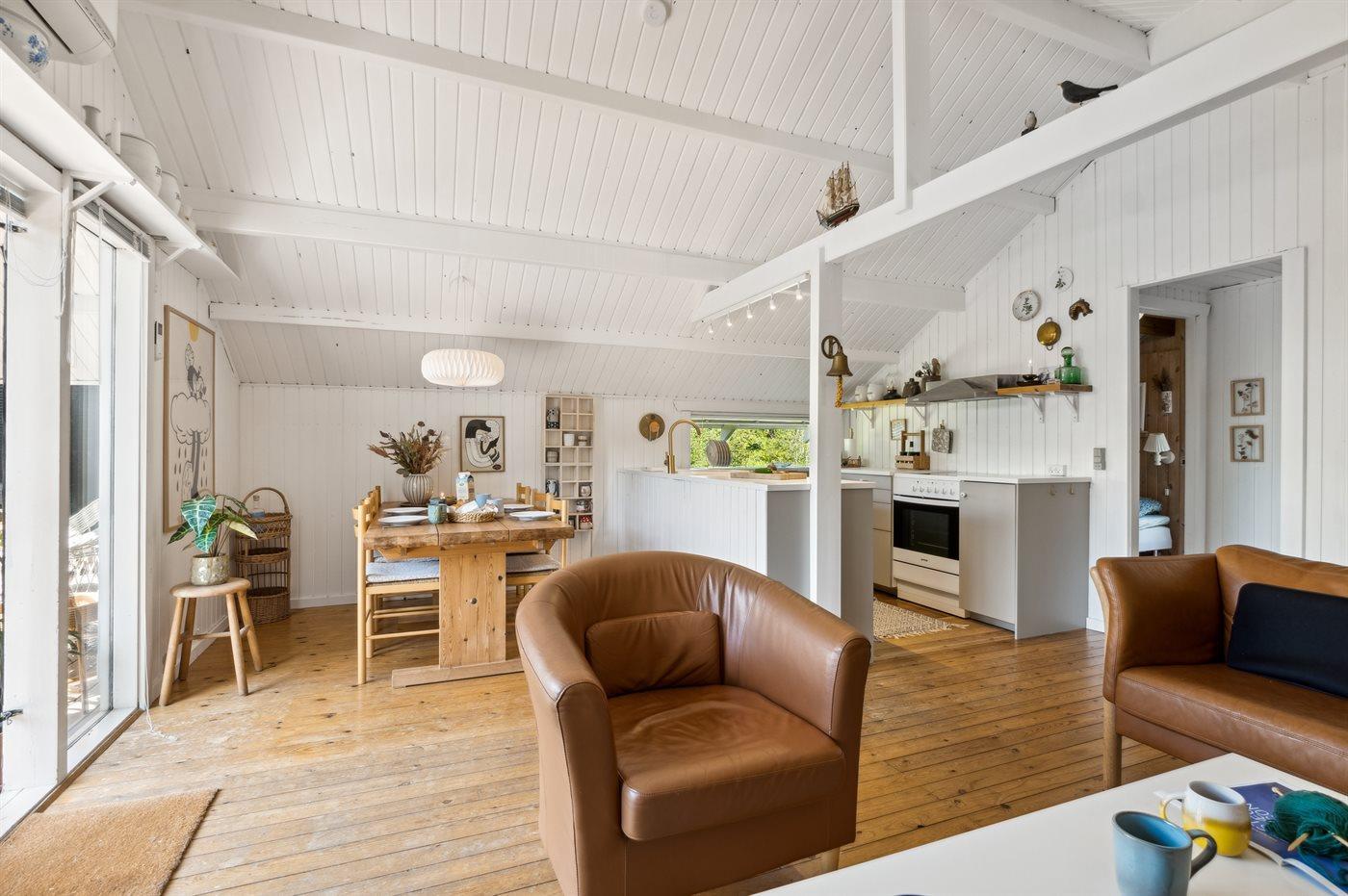 Indvendig fremstår sommerhuset i rigtig fin stand og har gennemgået en stor modernisering i 2023, men med respekt for husets oprindelige detaljer - dette giver en god og hyggelig atmosfære. Husets hjerte er det dejlige nye køkken fra 2023 og stue i ét med godt lysindfald og direkte adgang til den skønne terrasse. Sommerhuset er rigtig godt indrettet, og her er god plads til f.eks. en familie med 2-3 børn eller to par - mulighederne er mange i dette skønne sommerhus.