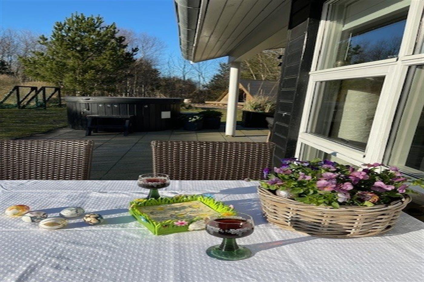 Ferieboligen er beliggende på en 1050 m² stor havegrund. Der er 1900 m til havet. Nærmeste forretning er beliggende i en afstand af 1600 m. Til ferieboligen hører åbent terrasseareal. Desuden er der overdækket terrasse. Sandkasse. Fodboldmål. Bålsted. Shelter. Grill til rådighed. Parkering ved ferieboligen.