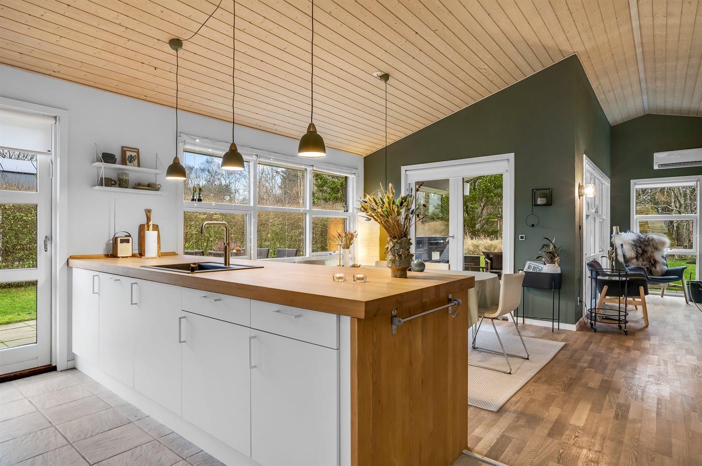 Køkkenet er udstyret med 1 køleskab. Der er 4 keramiske kogeplader, varmluftovn, mikrobølgeovn samt opvaskemaskine.