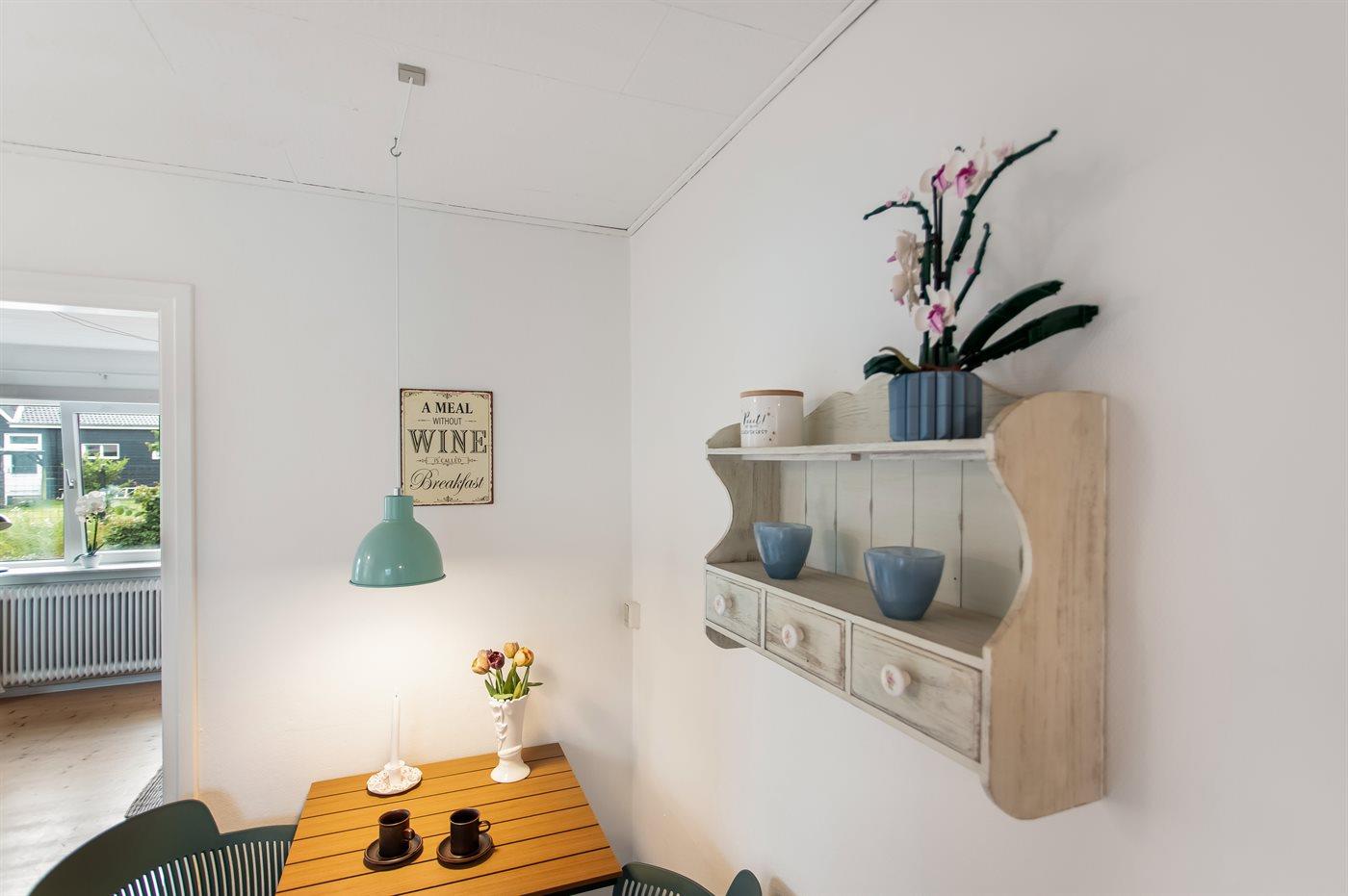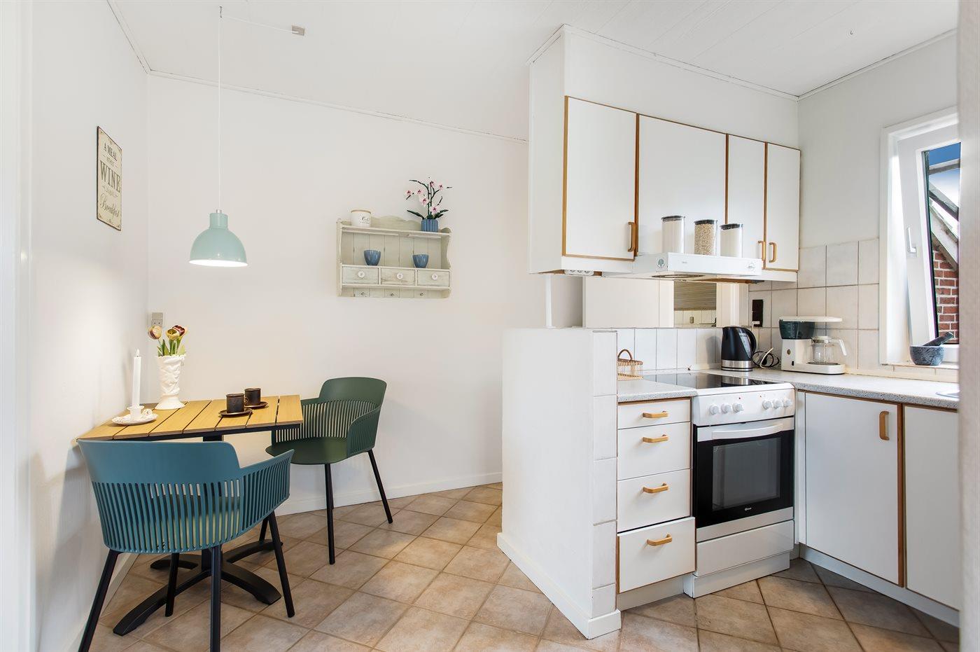 Køkkenet er udstyret med 1 køleskab. Der er 4 keramiske kogeplader, varmluftovn samt opvaskemaskine.