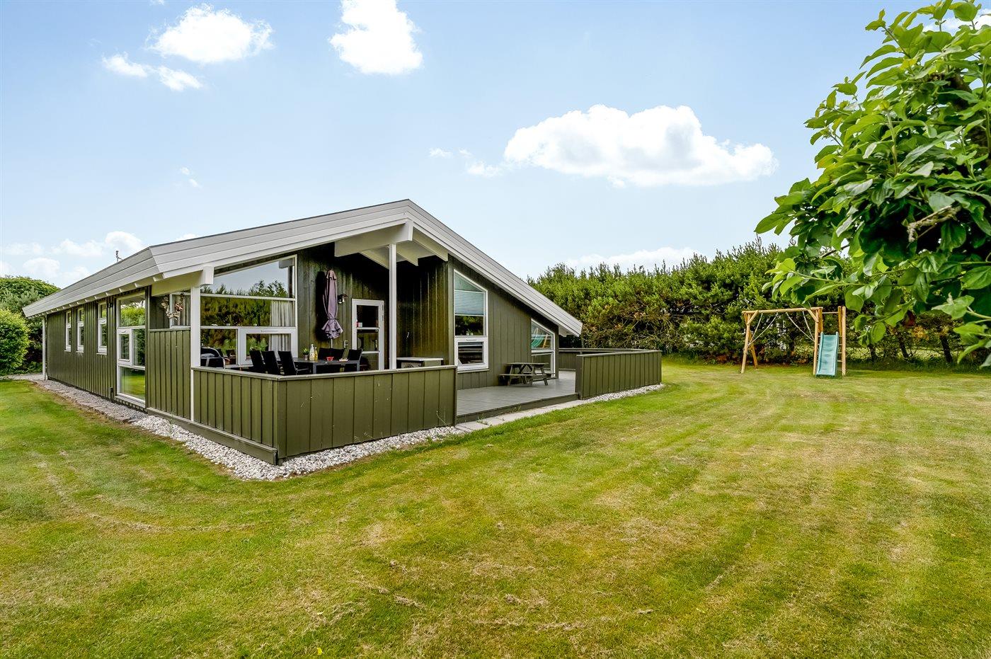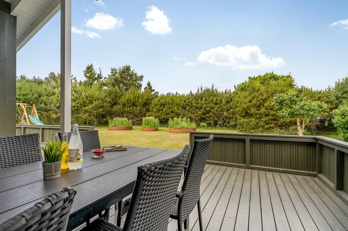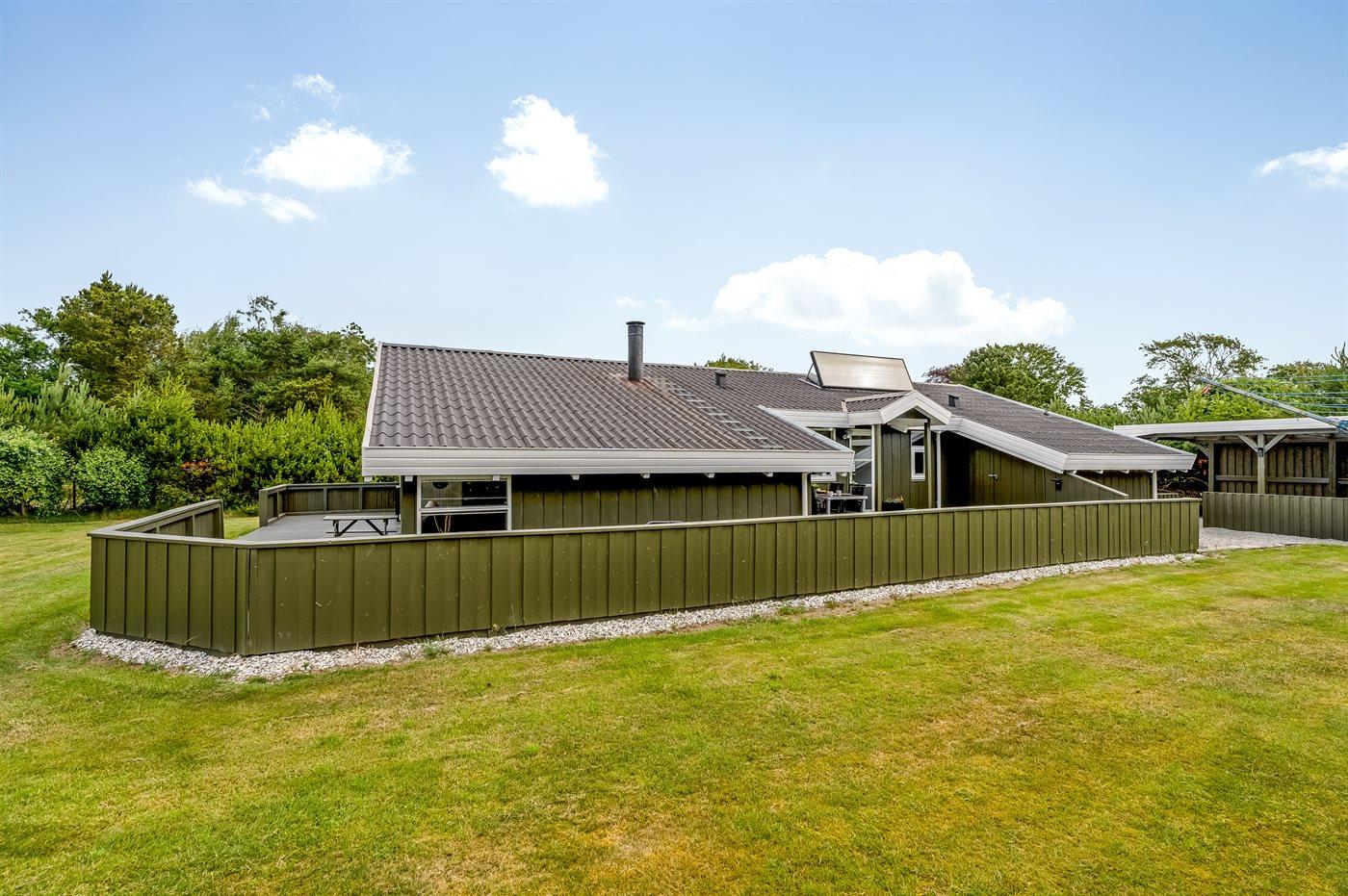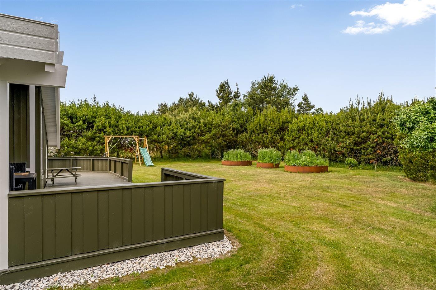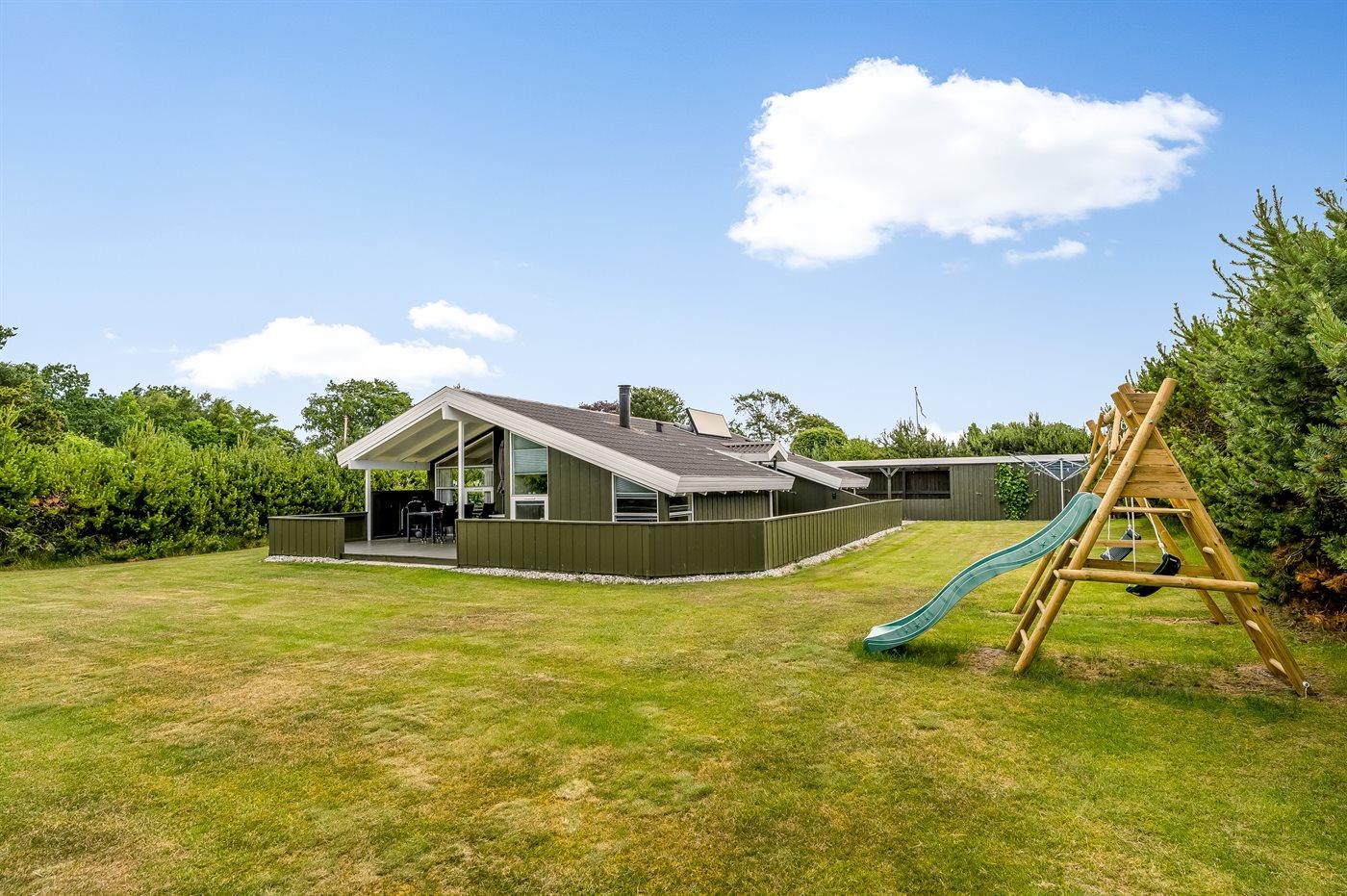 Ferieboligen er beliggende på en 1252 m² stor havegrund. Der er 200 m til havet. Der er 7300 m til fjorden. Nærmeste forretning er beliggende i en afstand af 600 m. Der er en golfbane i en afstand af 5400 m. Til ferieboligen hører åbent terrasseareal. Desuden er der overdækket terrasse. Gynge. Rutchebane. Grill til rådighed. Parkering ved ferieboligen.