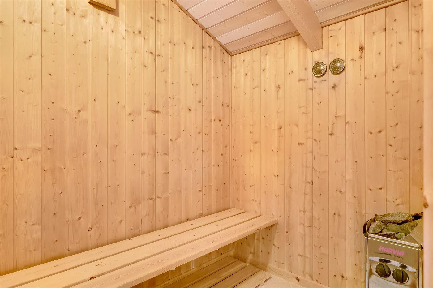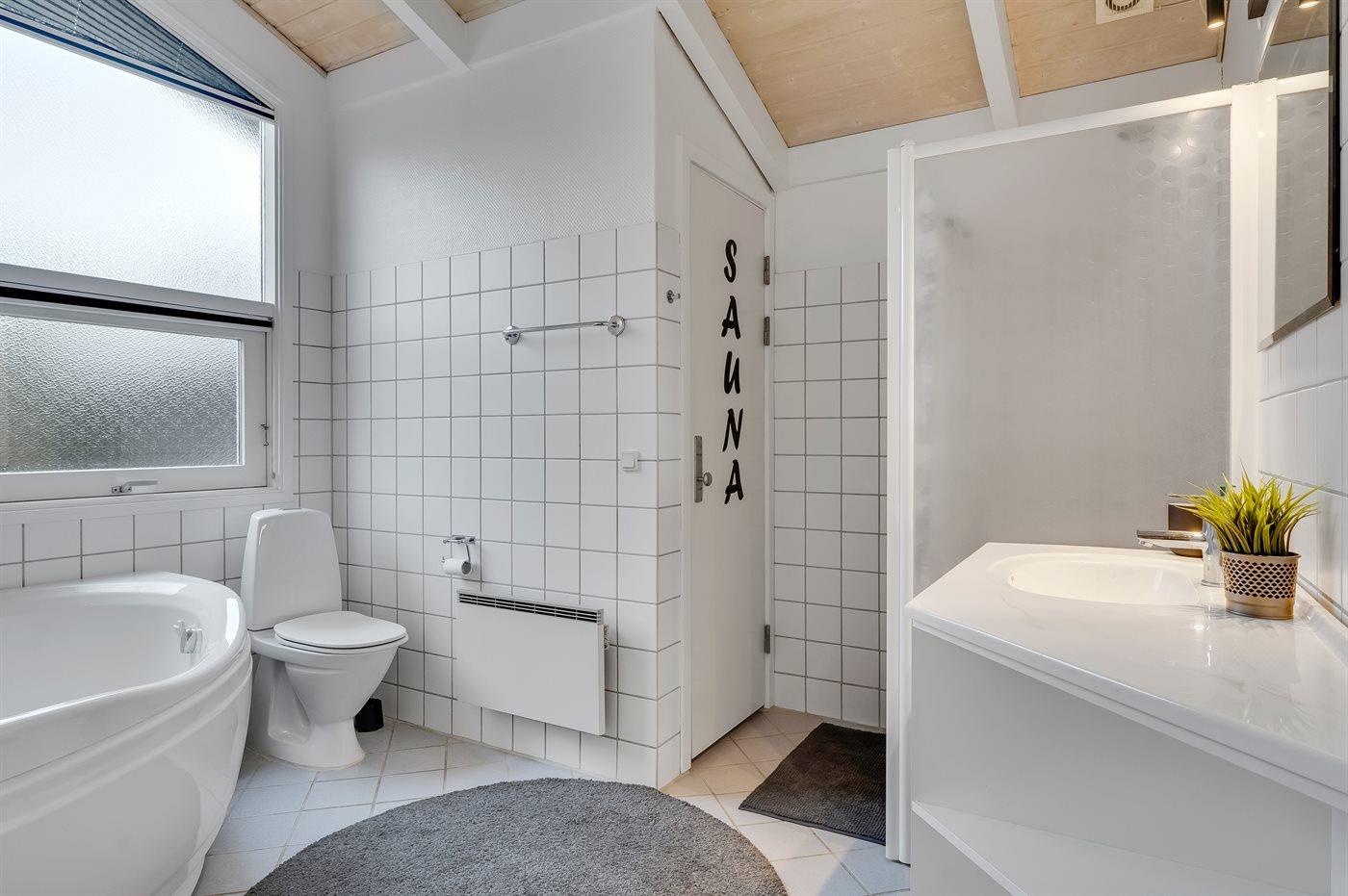 Der er 2 badeværelser med bruseniche og 2 toiletter. Der er gulvvarme på 2 badeværelser. I saunaen er der mulighed for afslapning.