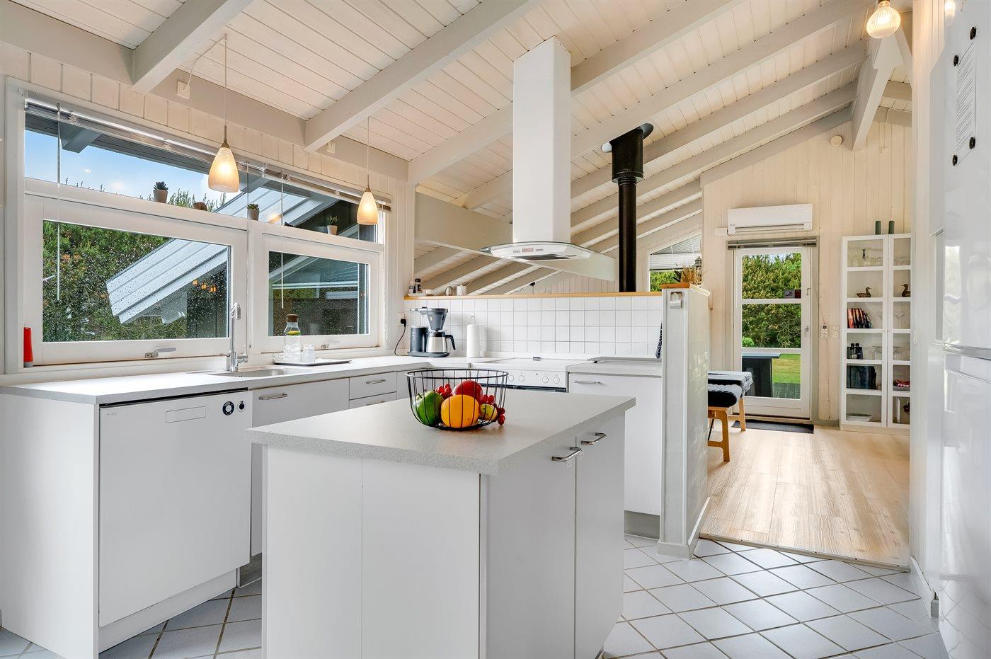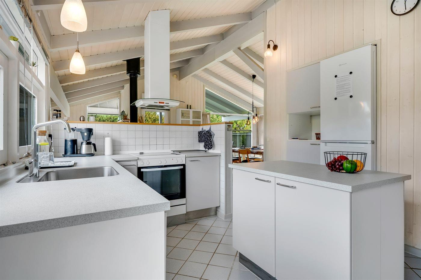 Køkkenet er udstyret med 1 køleskab. Der er 4 keramiske kogeplader, varmluftovn, mikrobølgeovn samt opvaskemaskine.