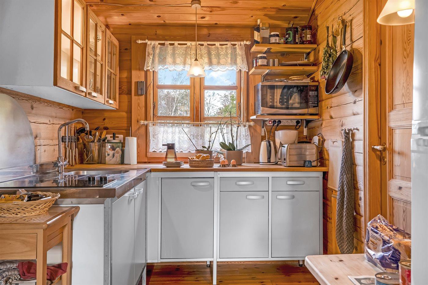 Køkkenet er udstyret med 1 køleskab. Der er 2 keramiske kogeplader, varmluftovn, Airfryer.