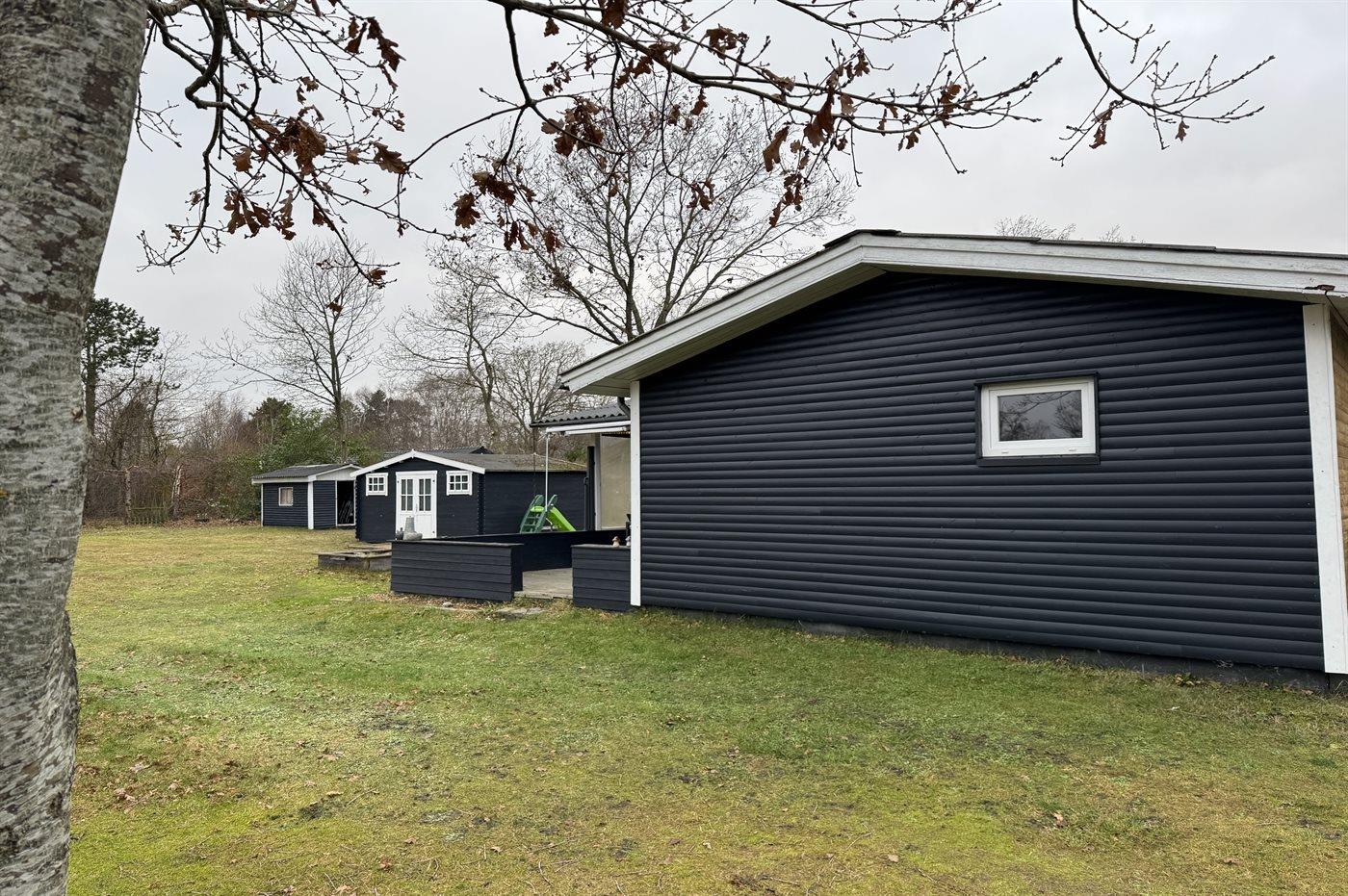 Ferieboligen er beliggende på en 1250 m² stor naturgrund. Grunden er indhegnet. Der er 1500 m til havet. Der er 7500 m til fjorden. Nærmeste forretning er beliggende i en afstand af 890 m. Der er en golfbane i en afstand af 6400 m. Til ferieboligen hører åbent terrasseareal. Desuden er der overdækket terrasse. Gynge. Trampolin. Grill til rådighed. Parkering ved ferieboligen.