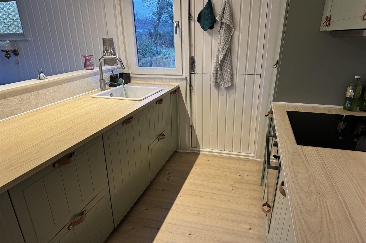 Køkkenet er udstyret med 1 køleskab. Der er 4 keramiske kogeplader, varmluftovn samt opvaskemaskine.