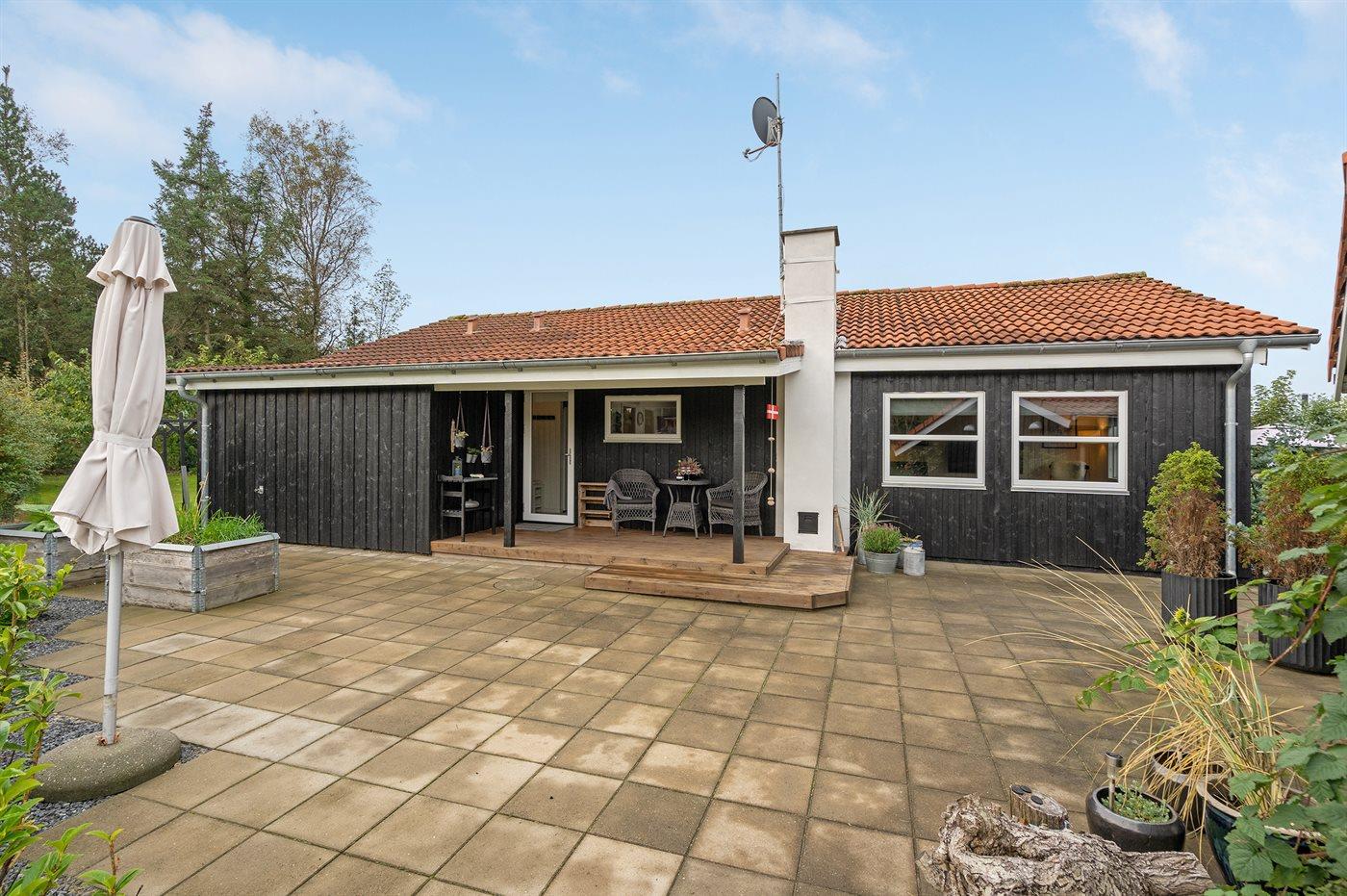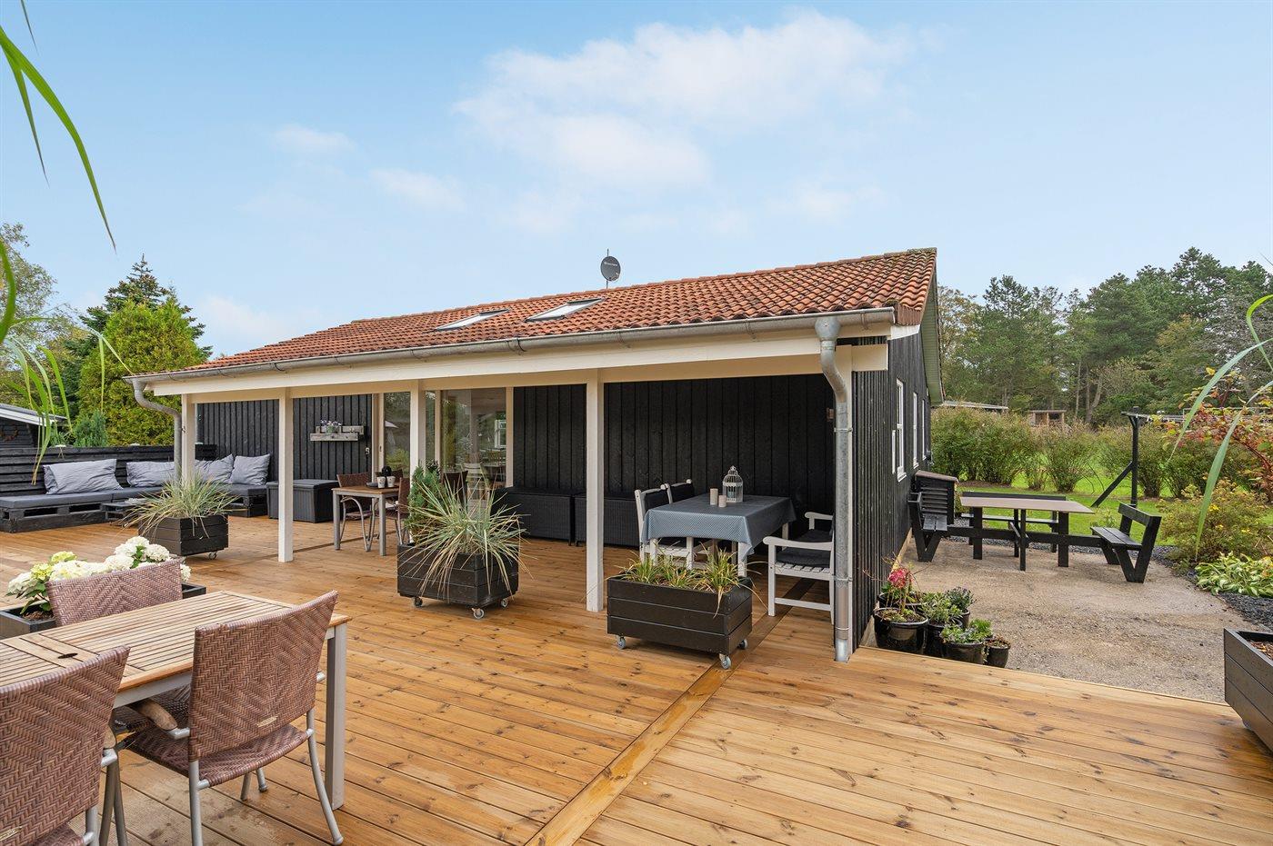 Ferieboligen er beliggende på en 1380 m² stor havegrund. Grunden er indhegnet. Der er 400 m til havet. Nærmeste forretning er beliggende i en afstand af 2000 m. Til ferieboligen hører 105 m² terrasseareal. Desuden er der 24 m² overdækket terrasse. Gynge. Sandkasse. Legehus. Trampolin. Rutchebane. Bålsted. Grill til rådighed. Der er installeret stik til opladning af elbil. Med 11 kW ladeeffekt. Parkering ved ferieboligen.