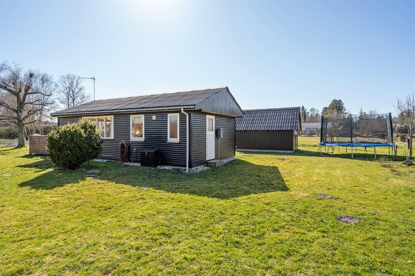 Hyggeligt sommerhus i roligt område med stor have, terrasse og aktivitetsrum, tæt på Hou og 1,5 km fra havet.