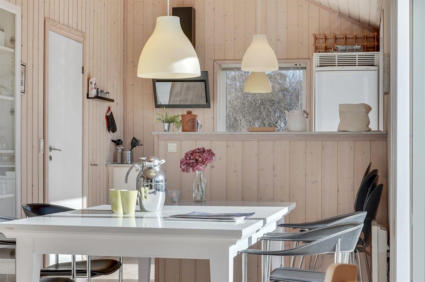 Køkkenet er udstyret med 1 køleskab. Der er 4 keramiske kogeplader, varmluftovn, mikrobølgeovn samt opvaskemaskine.
