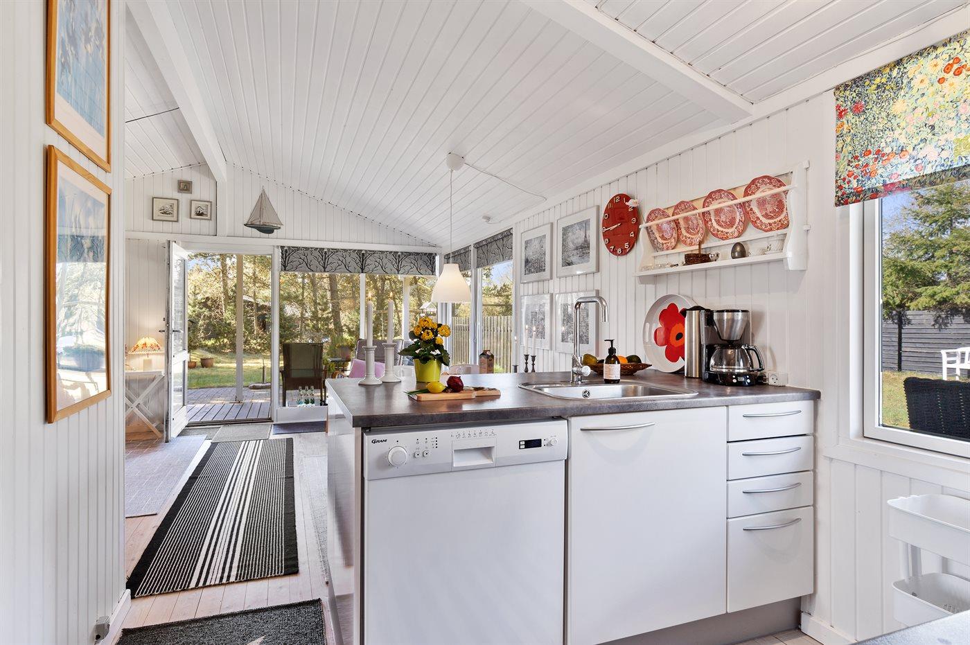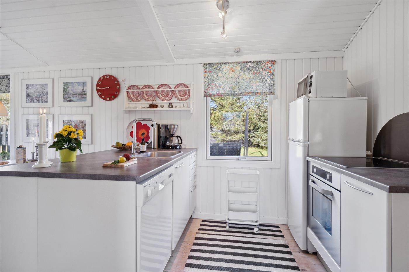 Køkkenet er udstyret med 1 køleskab. Der er 4 keramiske kogeplader, varmluftovn, mikrobølgeovn samt opvaskemaskine.