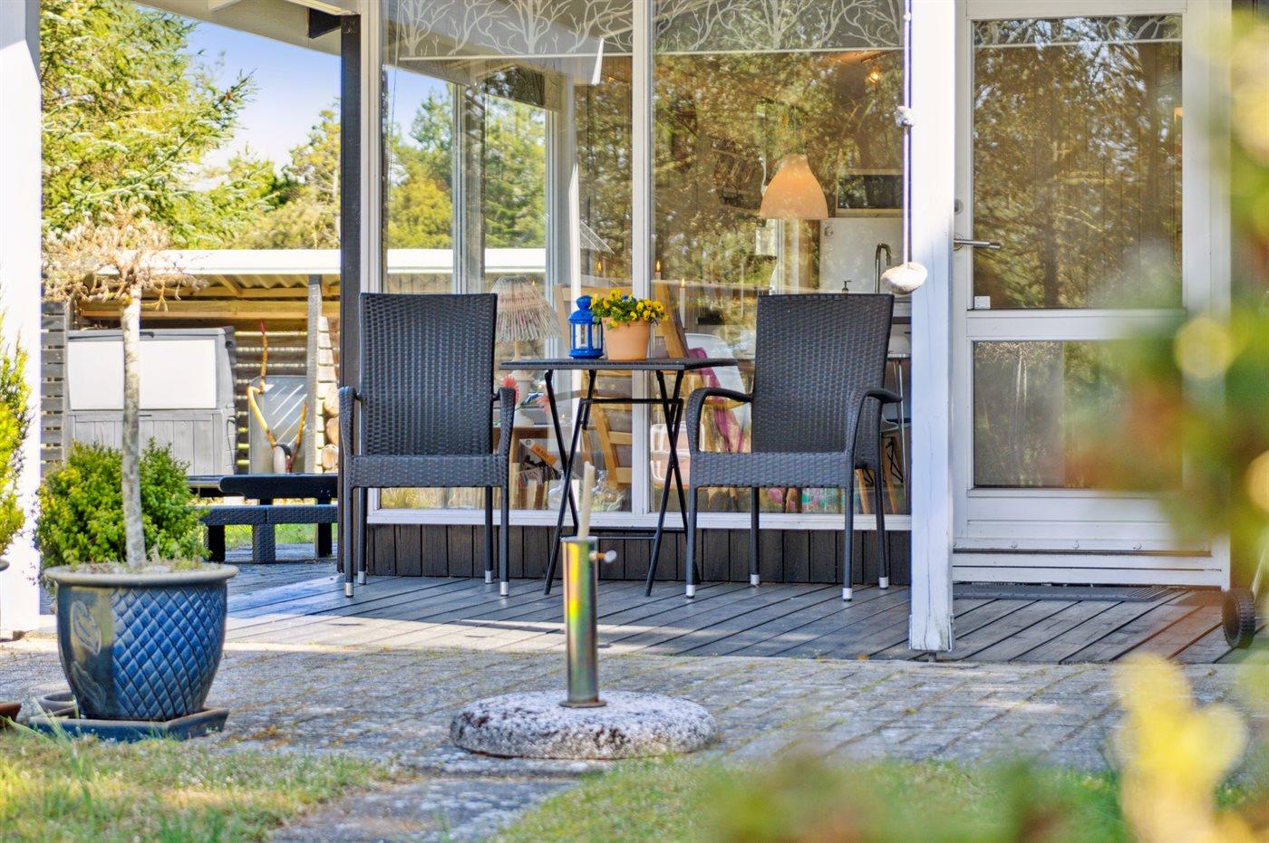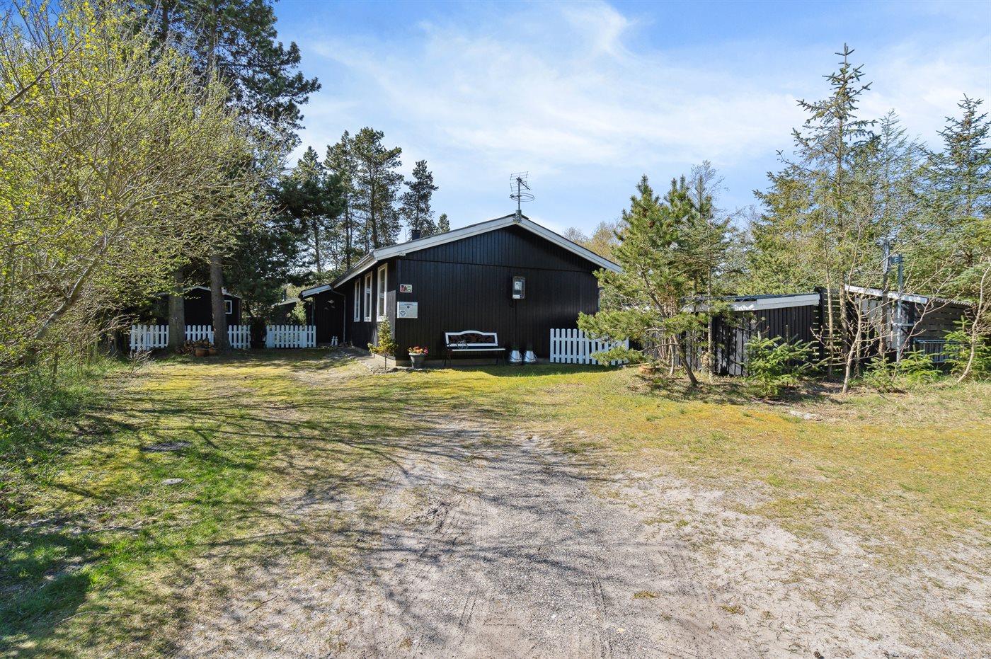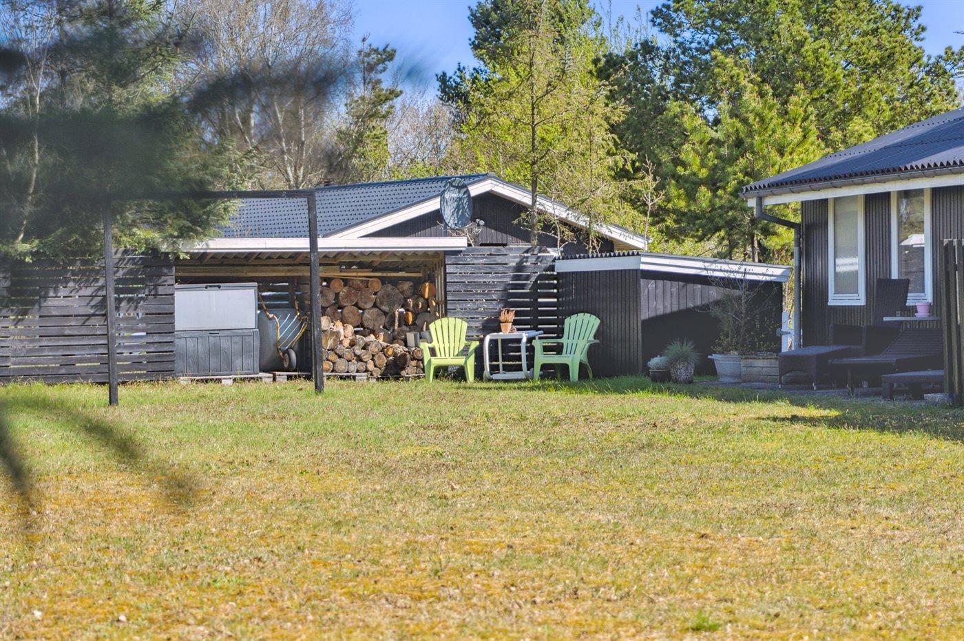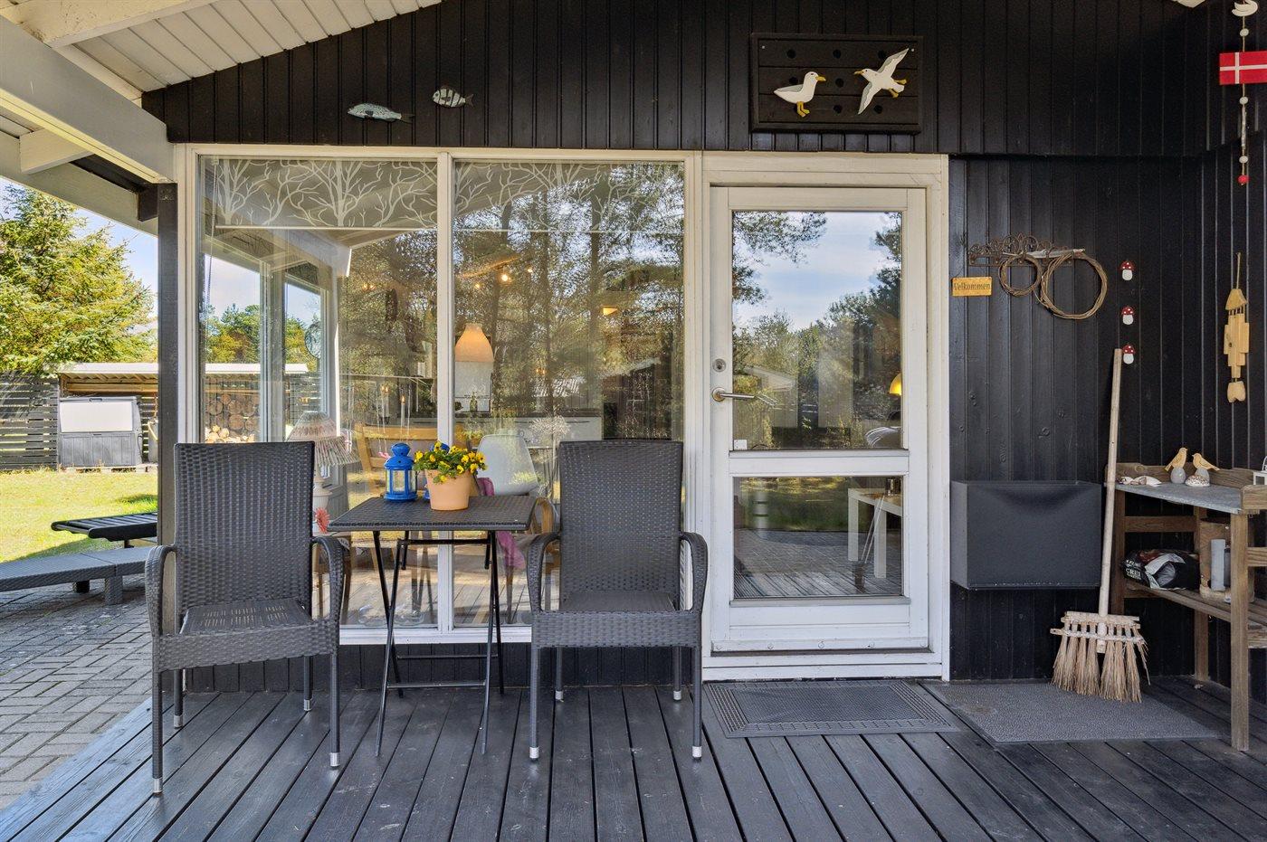 Ferieboligen er beliggende på en 1200 m² stor Grunden er indhegnet. Der er 500 m til havet. Der er 6570 m til fjorden. Nærmeste forretning er beliggende i en afstand af 900 m. Der er en golfbane i en afstand af 6080 m. Til ferieboligen hører 40 m² terrasseareal. Desuden er der 8 m² overdækket terrasse. Ligeledes er der adgang til udestue. Gynge. Sandkasse. Grill til rådighed. Parkering ved ferieboligen.