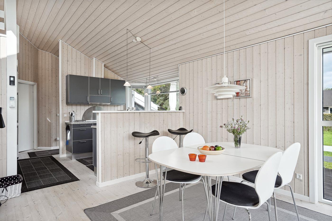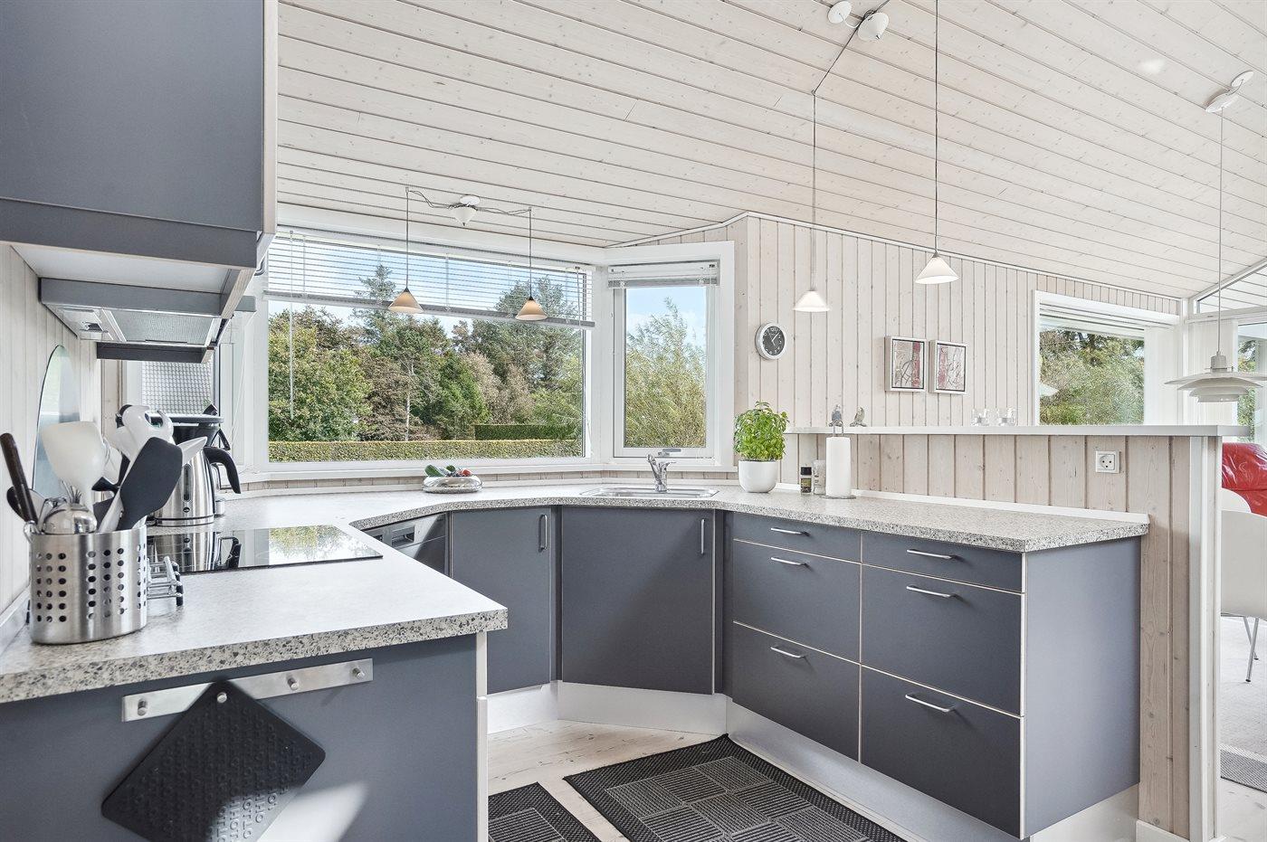Køkkenet er udstyret med 1 køleskab. Der er 4 keramiske kogeplader, varmluftovn, mikrobølgeovn samt opvaskemaskine.
