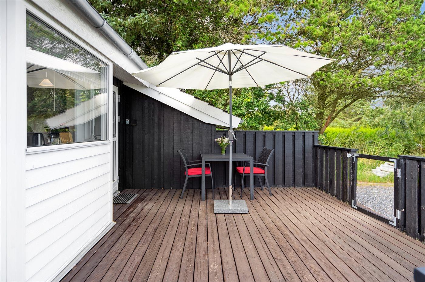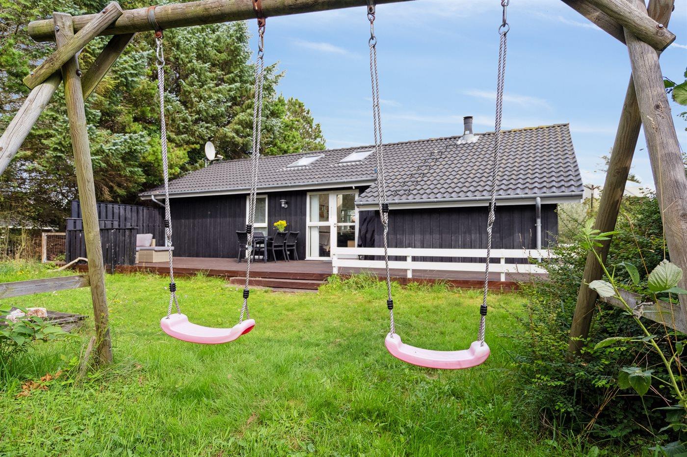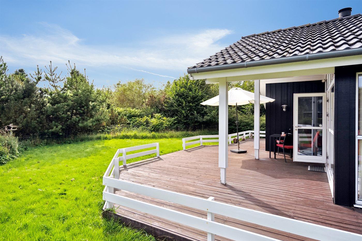 Ferieboligen er beliggende på en 1150 m² stor naturgrund. Der er 1700 m til havet. Nærmeste forretning er beliggende i en afstand af 1800 m. Der er en golfbane i en afstand af 7000 m. Til ferieboligen hører 120 m² terrasseareal. Heraf delvis omkranset terrasse med et lavt stakit mod syd og total ugeneret terrasse mod vest. Desuden er der 12 m² overdækket terrasse. Gynge. Sandkasse. Gasgrill til rådighed. Parkering ved ferieboligen. Der findes redskabsrum med parasol og liggestole samt diverse spil og legeredskaber til strandturen.