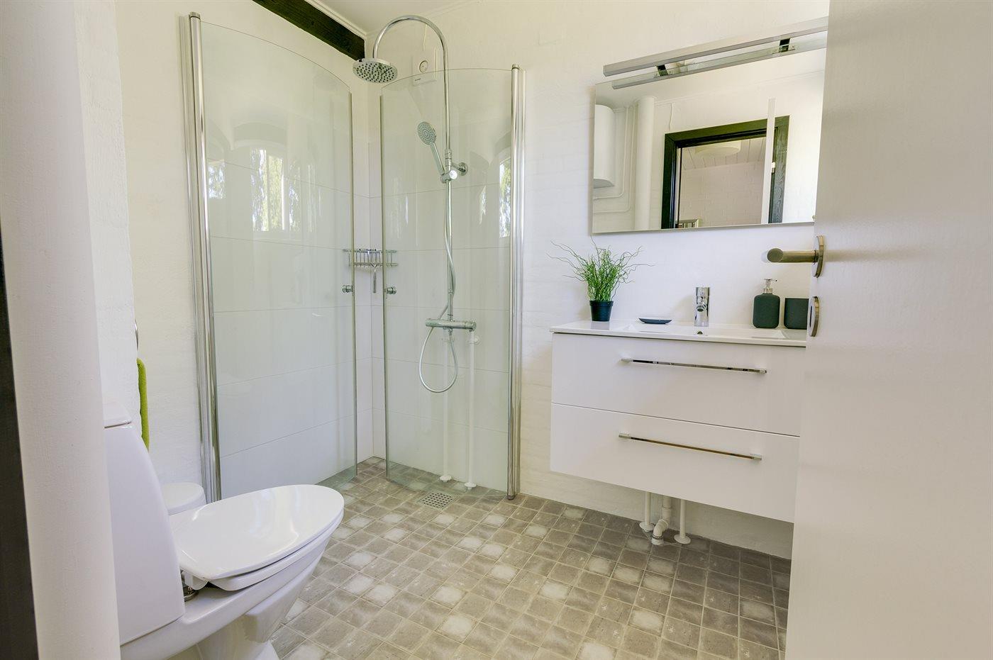 Der er 1 badeværelse med bruseniche og 2 toiletter, heraf 1 gæstetoilet. Der er gulvvarme på 1 badeværelse.