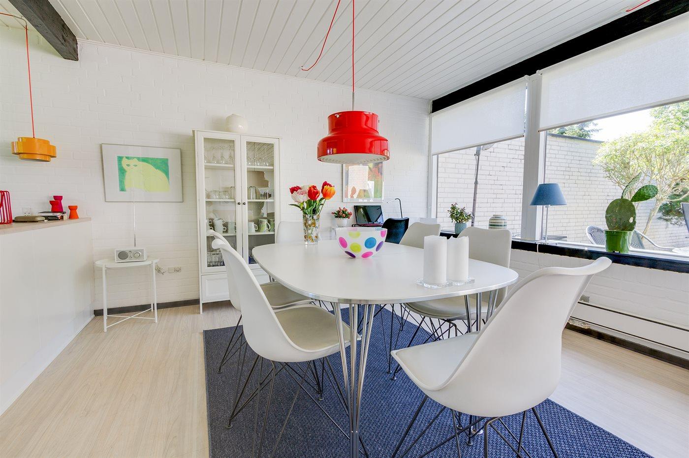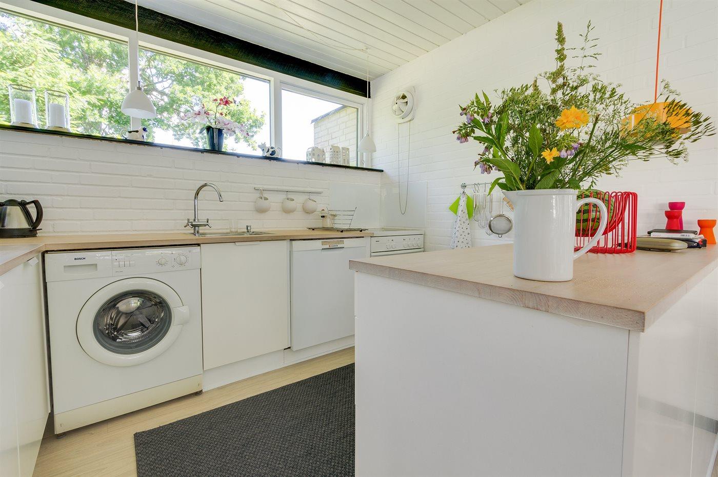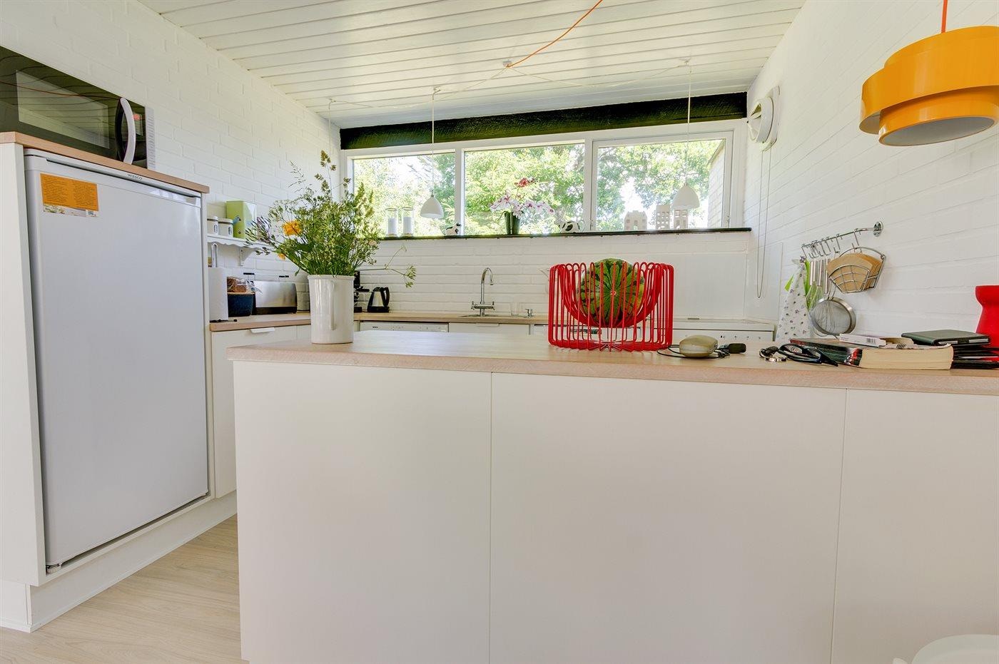 Køkkenet er udstyret med 1 køleskab. Der er 4 keramiske kogeplader, varmluftovn, mikrobølgeovn samt opvaskemaskine.