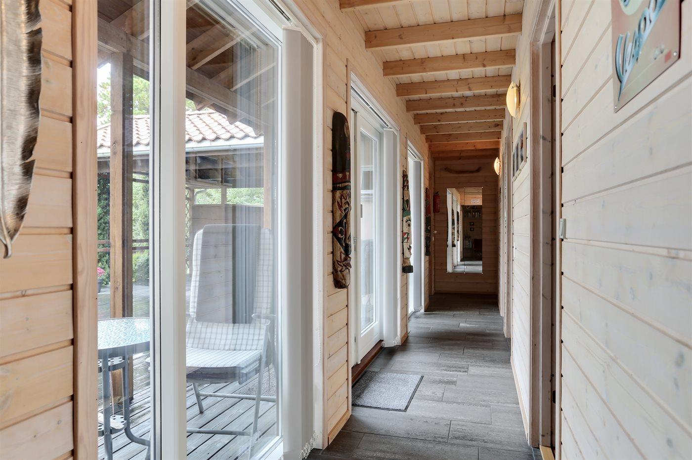 Skønt stort sommerhus i træ, beliggende på en stor dejlig naturgrund. Flot, delvist overdækket terrasse, hvor man kan sidde og grille og nyde naturen. Der er ca. 1200 m til den fine sandbadestrand mellem Hou og Hals, hvor man trygt kan lade børnene bade.