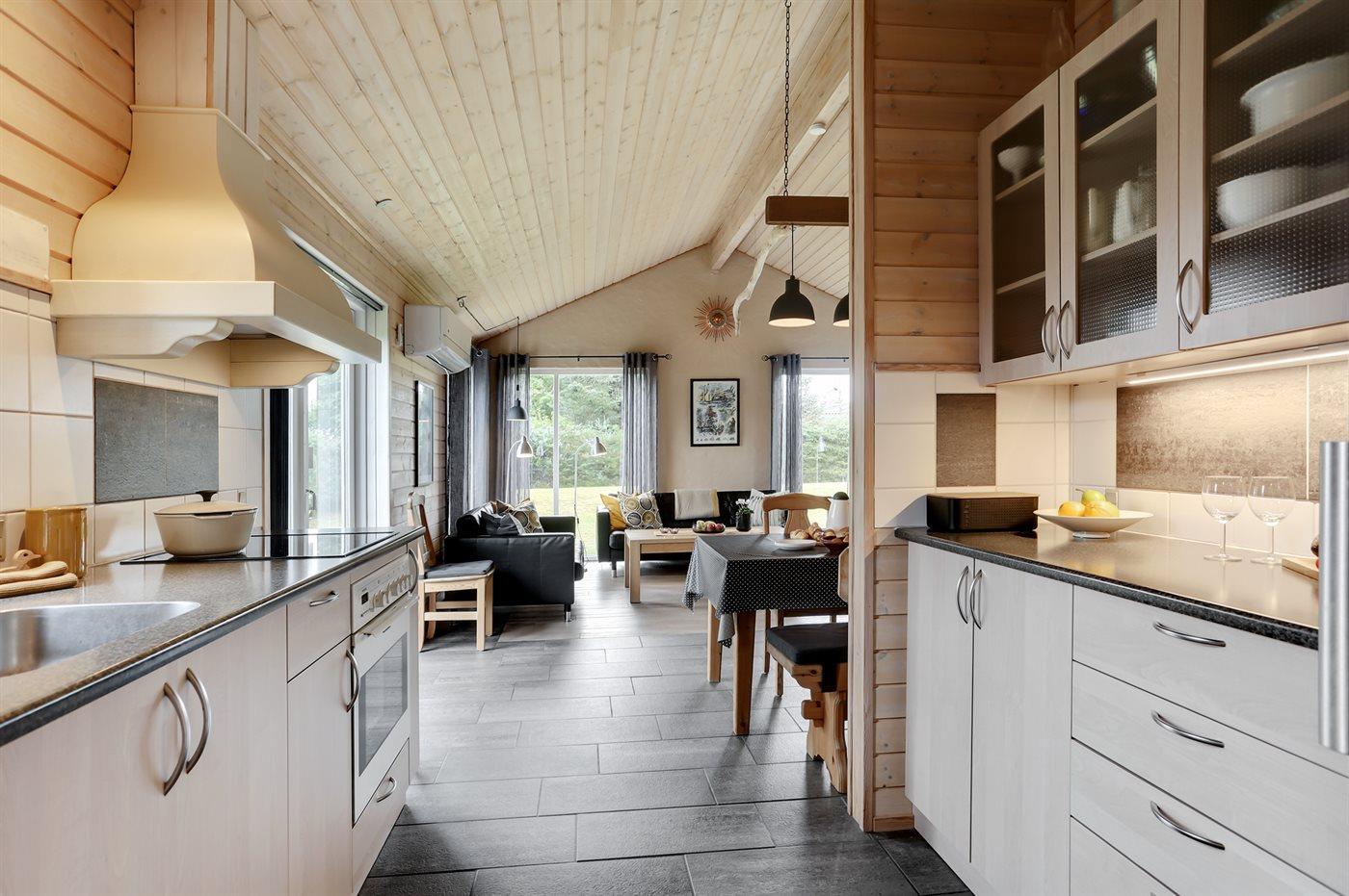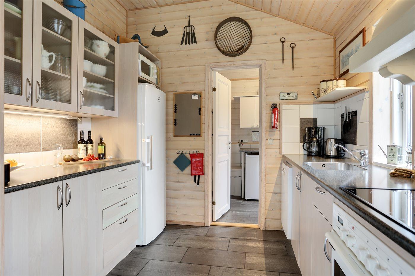 Køkkenet er udstyret med 1 køleskab. Der er 4 keramiske kogeplader, varmluftovn, mikrobølgeovn samt opvaskemaskine.