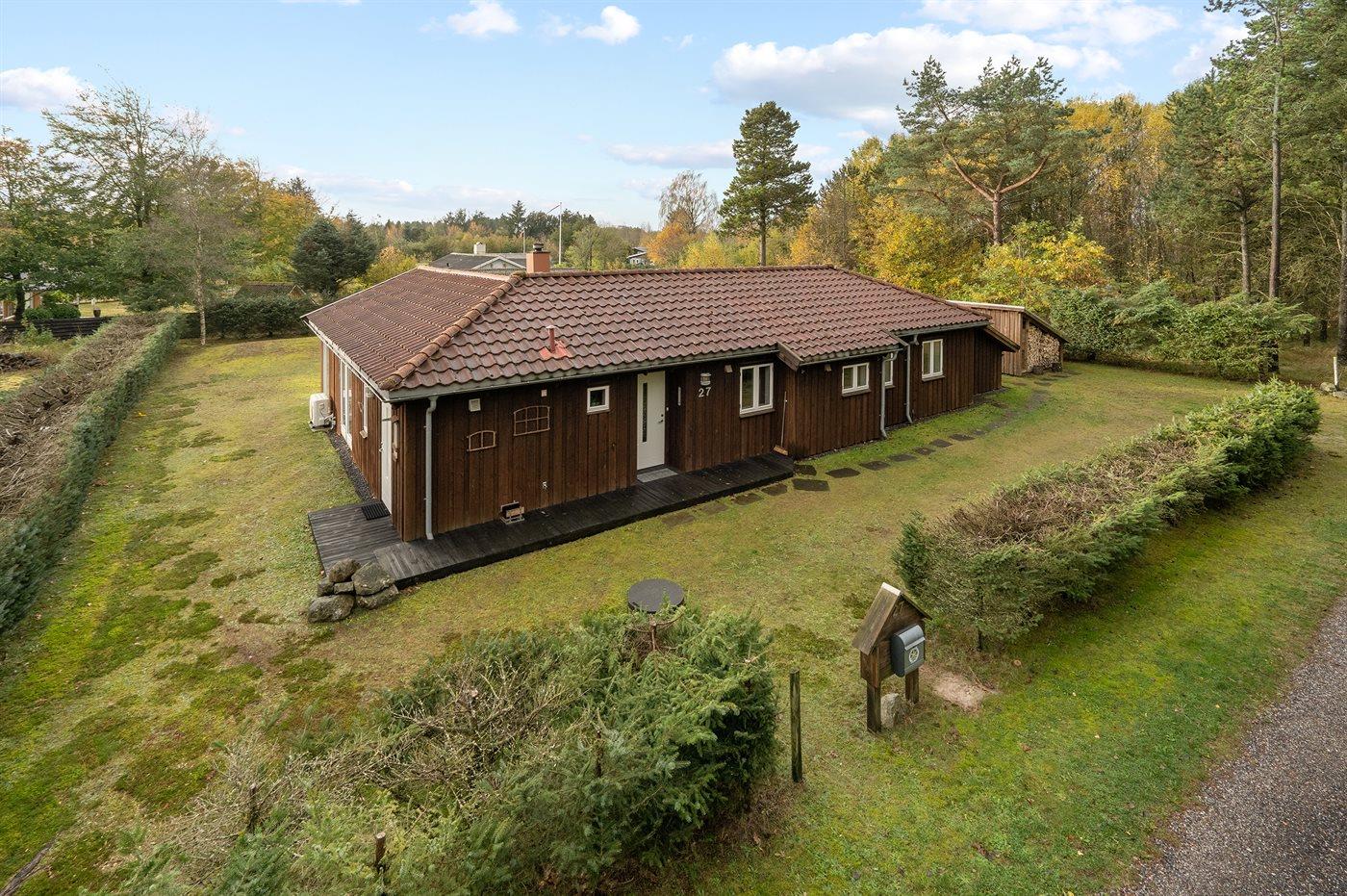 Stort træsommerhus med stor naturgrund nær Hou og Hals, perfekt til familieferie med terrasse og grill.