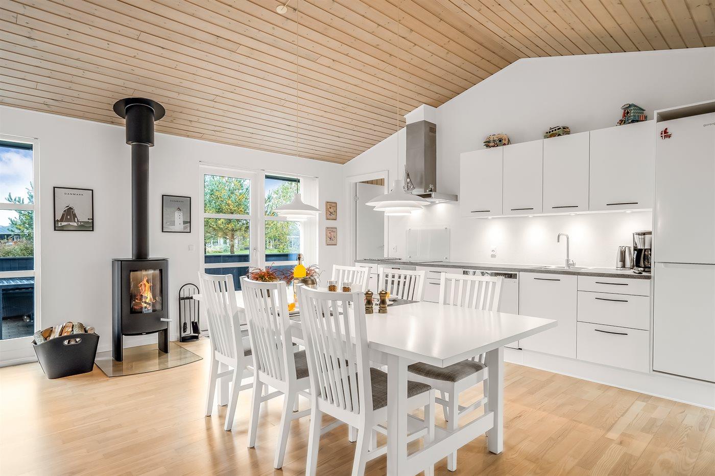 Køkkenet er udstyret med 1 køleskab. Der er 4 induktionskogeplader, varmluftovn, mikrobølgeovn samt opvaskemaskine.
