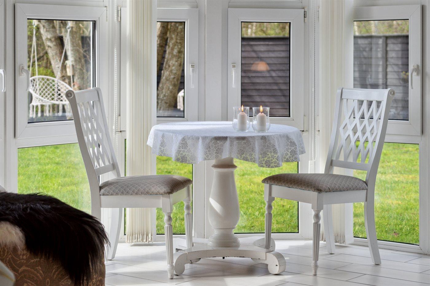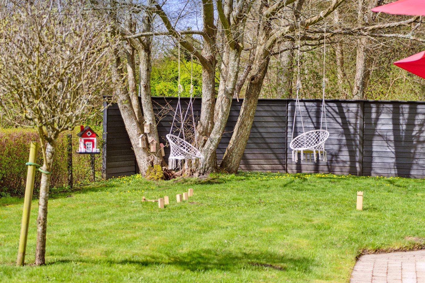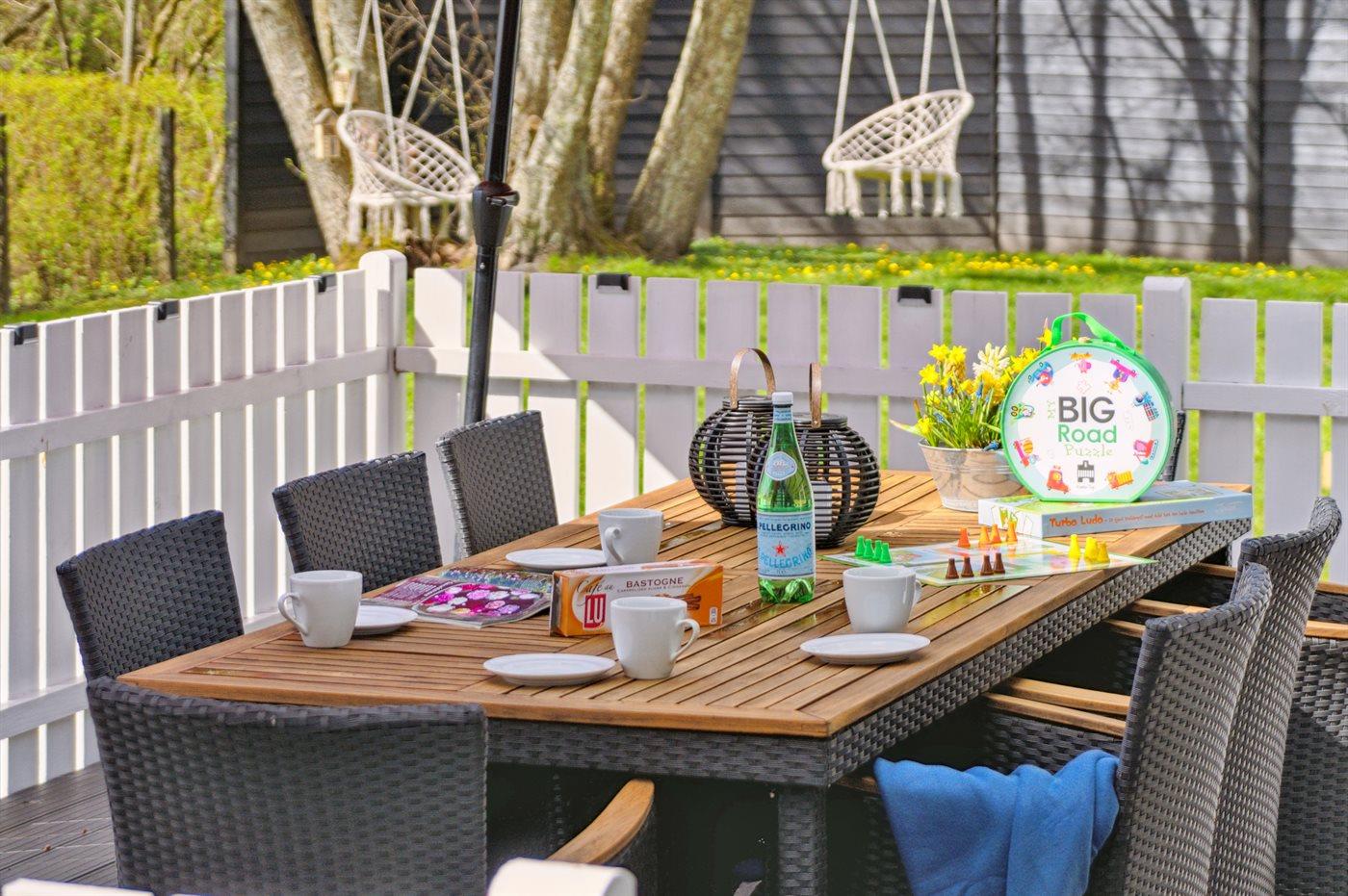 Dejlig terrasse med havemøbler, gynge og sandkasse til børnene. Stranden mellem Hou og Hals er skøn og børnevenlig.