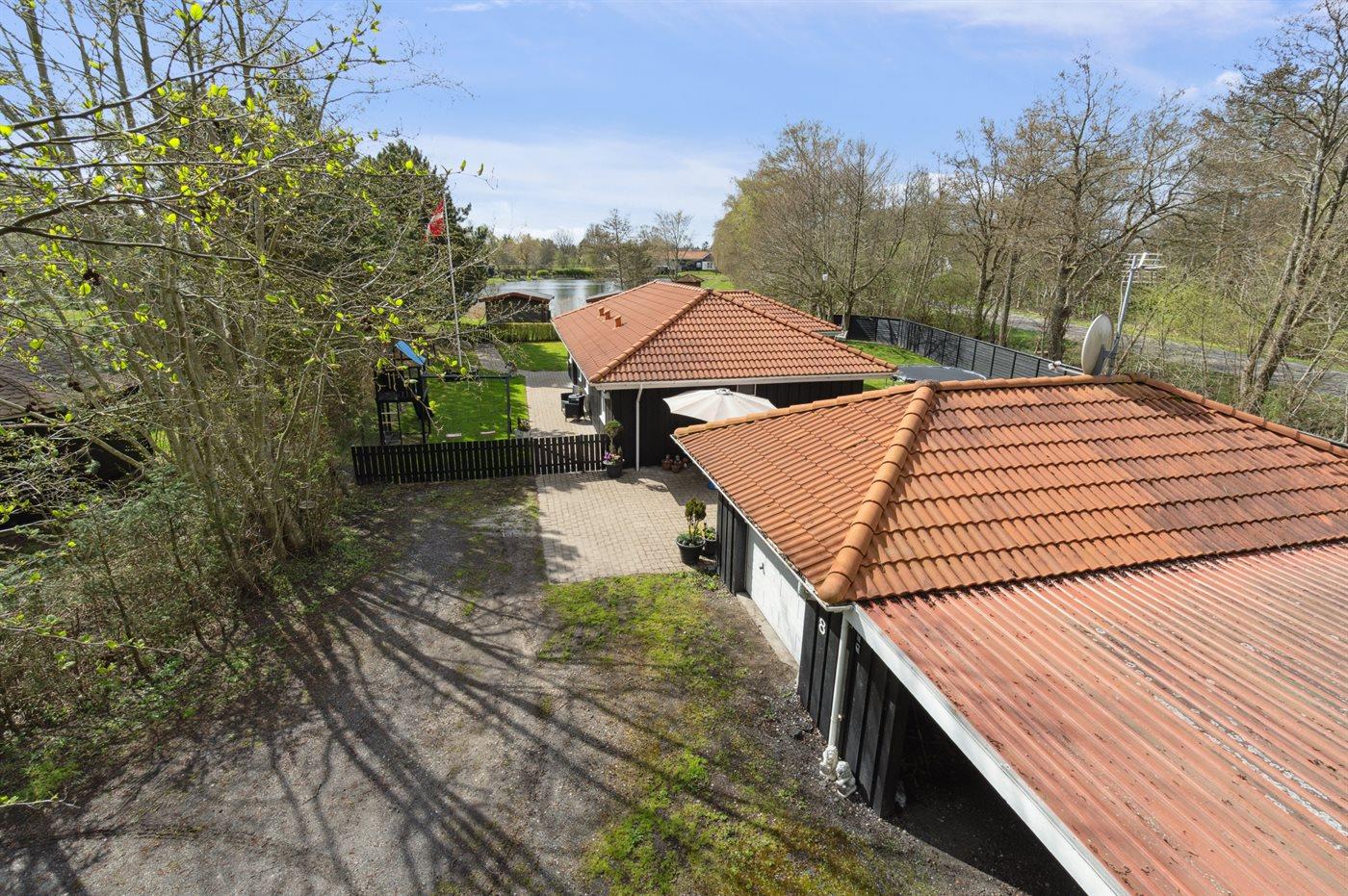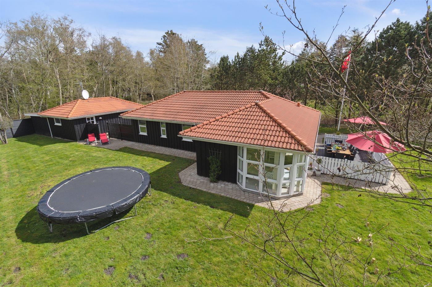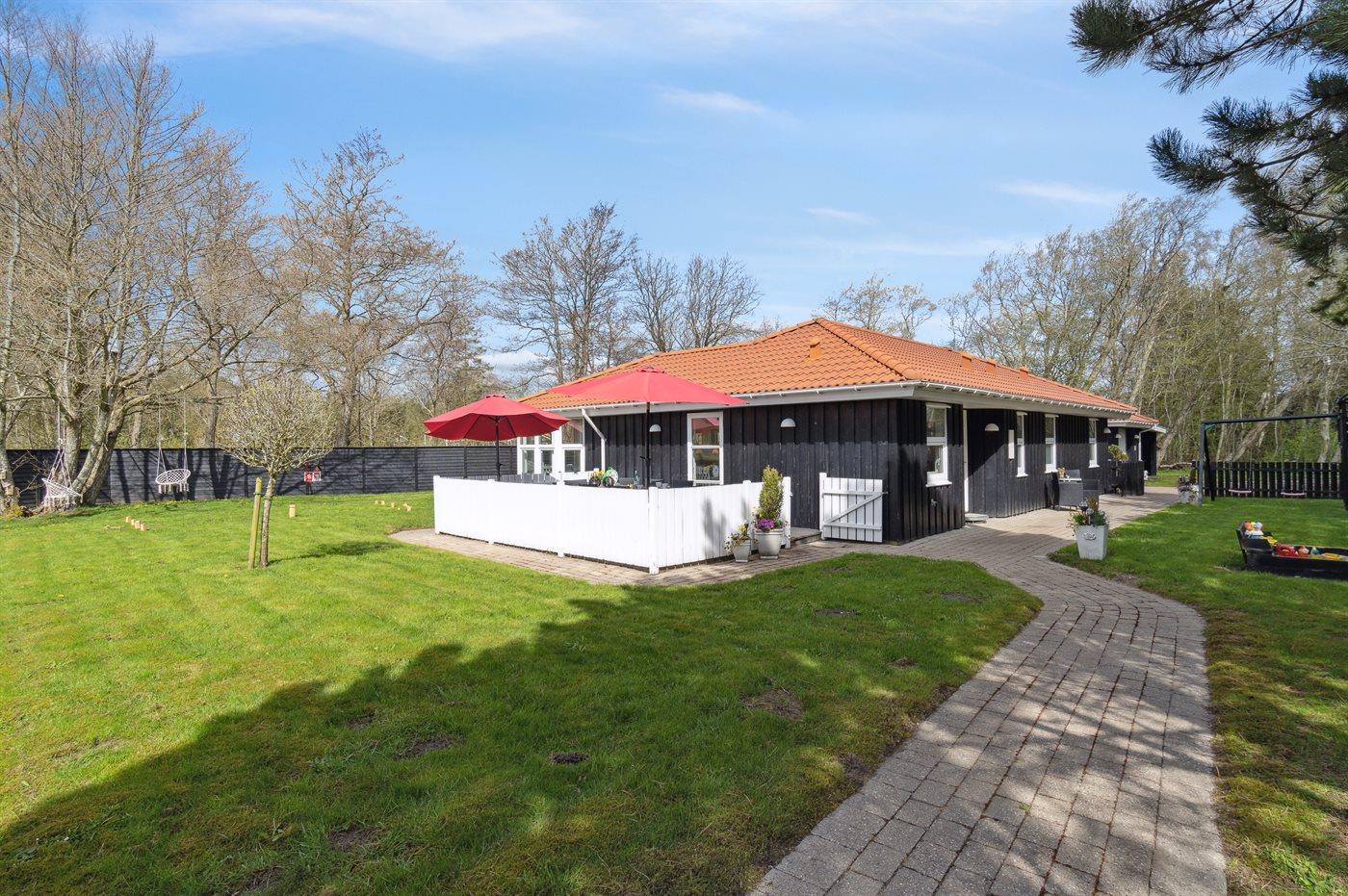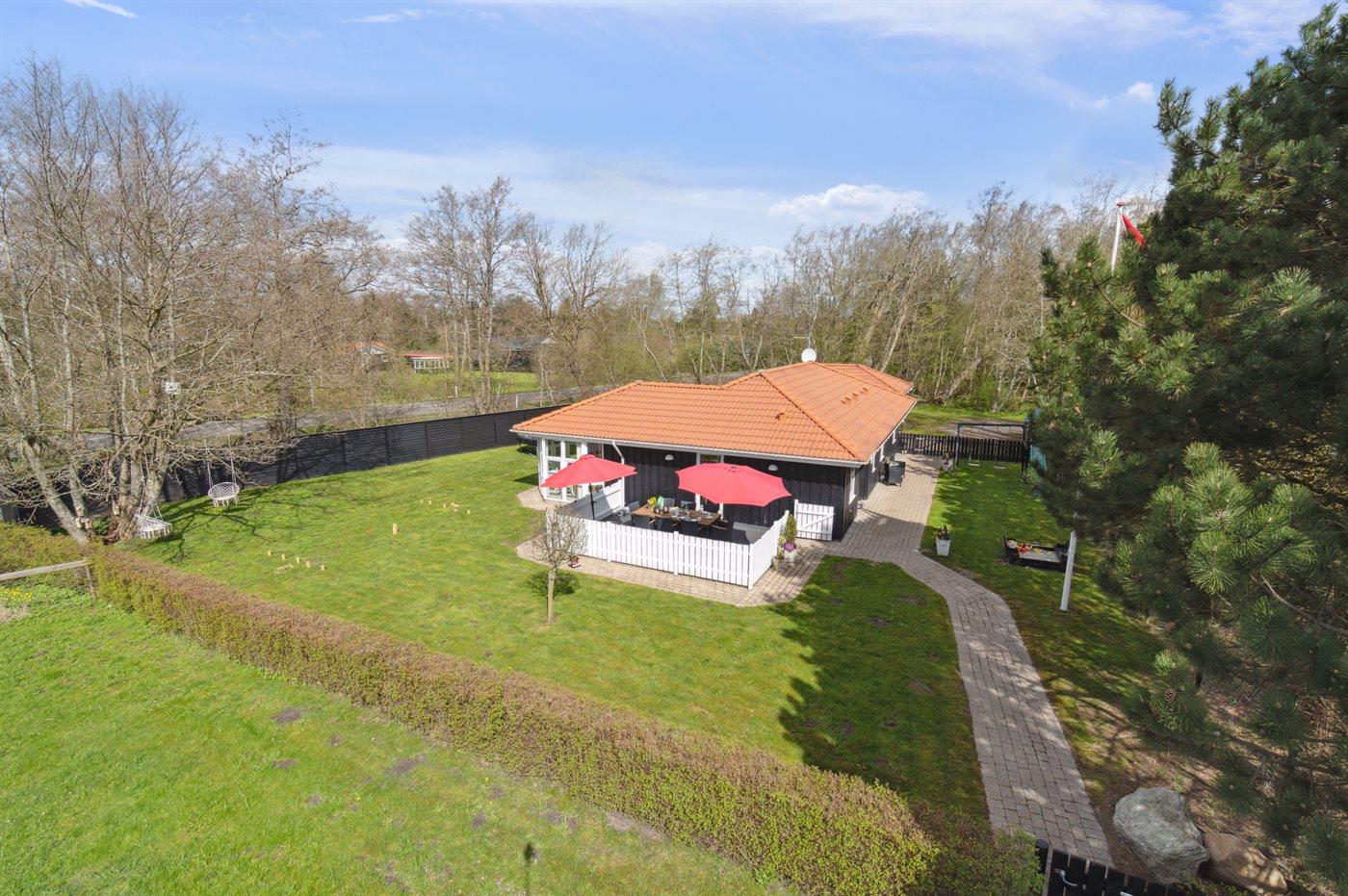 Ferieboligen er beliggende på en 1100 m² stor havegrund. Grunden er indhegnet. Der er 500 m til havet. Nærmeste forretning er beliggende i en afstand af 200 m. Til ferieboligen hører 70 m² terrasseareal. Heraf i alt 24 m² lukket terrasse. Gynge. Sandkasse. Legetårn. Rutchebane. Grill til rådighed. Der er installeret stik til opladning af elbil. Parkering ved ferieboligen.