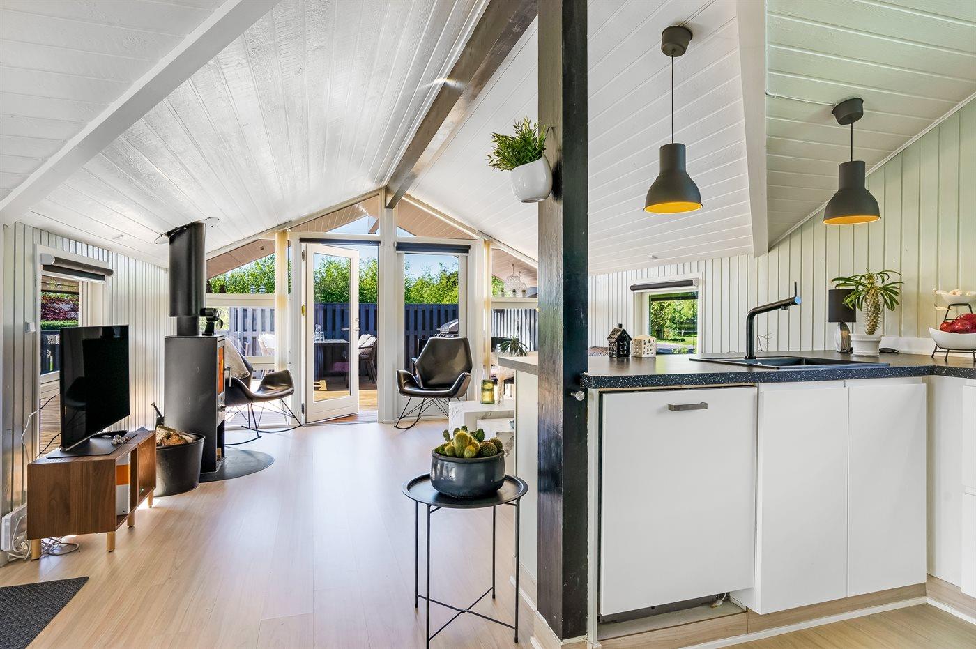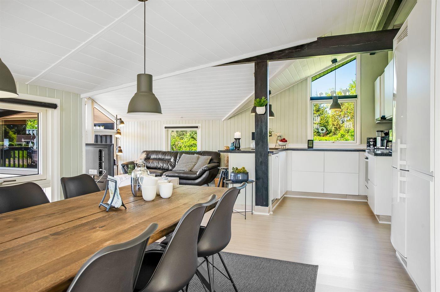 Dette dejlige og lyst indrettede sommerhus ligger i et populært ferieområde ikke langt fra vandet. Til huset hører et skønt, lukket terrasseareal med havemøbler og gode hyggekroge.