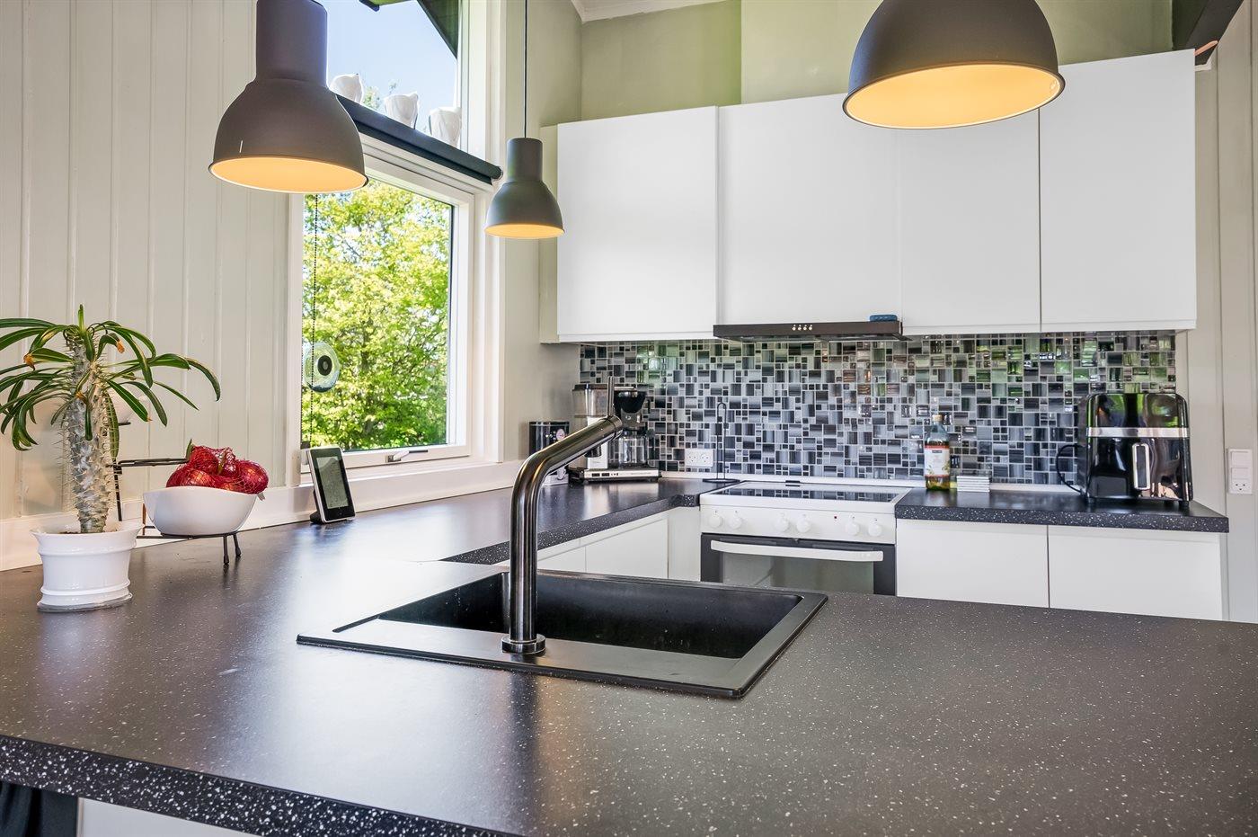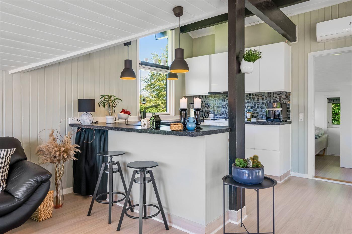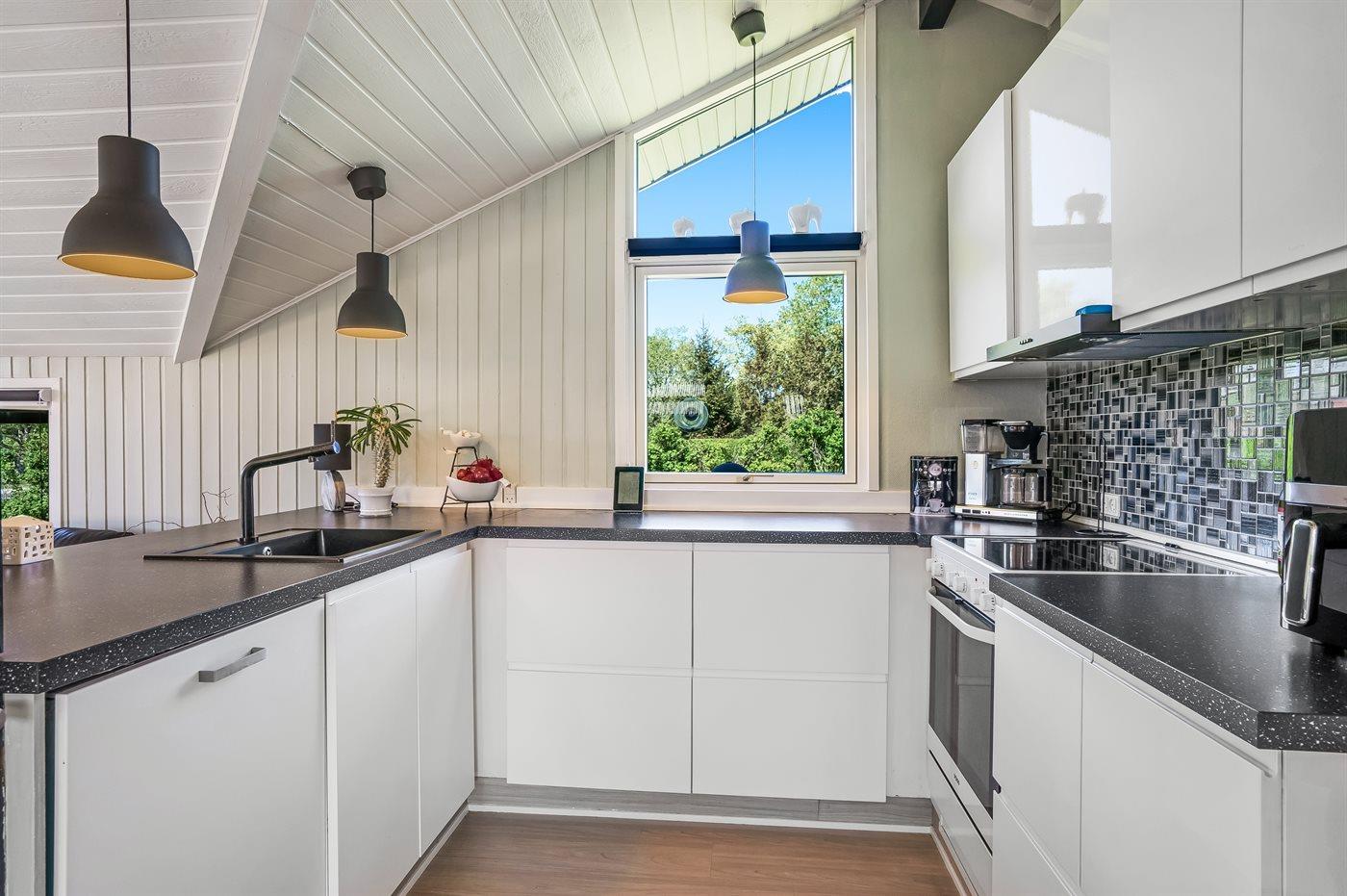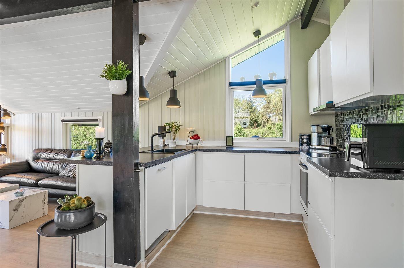 Køkkenet er udstyret med 1 køleskab. Der er 4 keramiske kogeplader, varmluftovn, mikrobølgeovn samt opvaskemaskine.