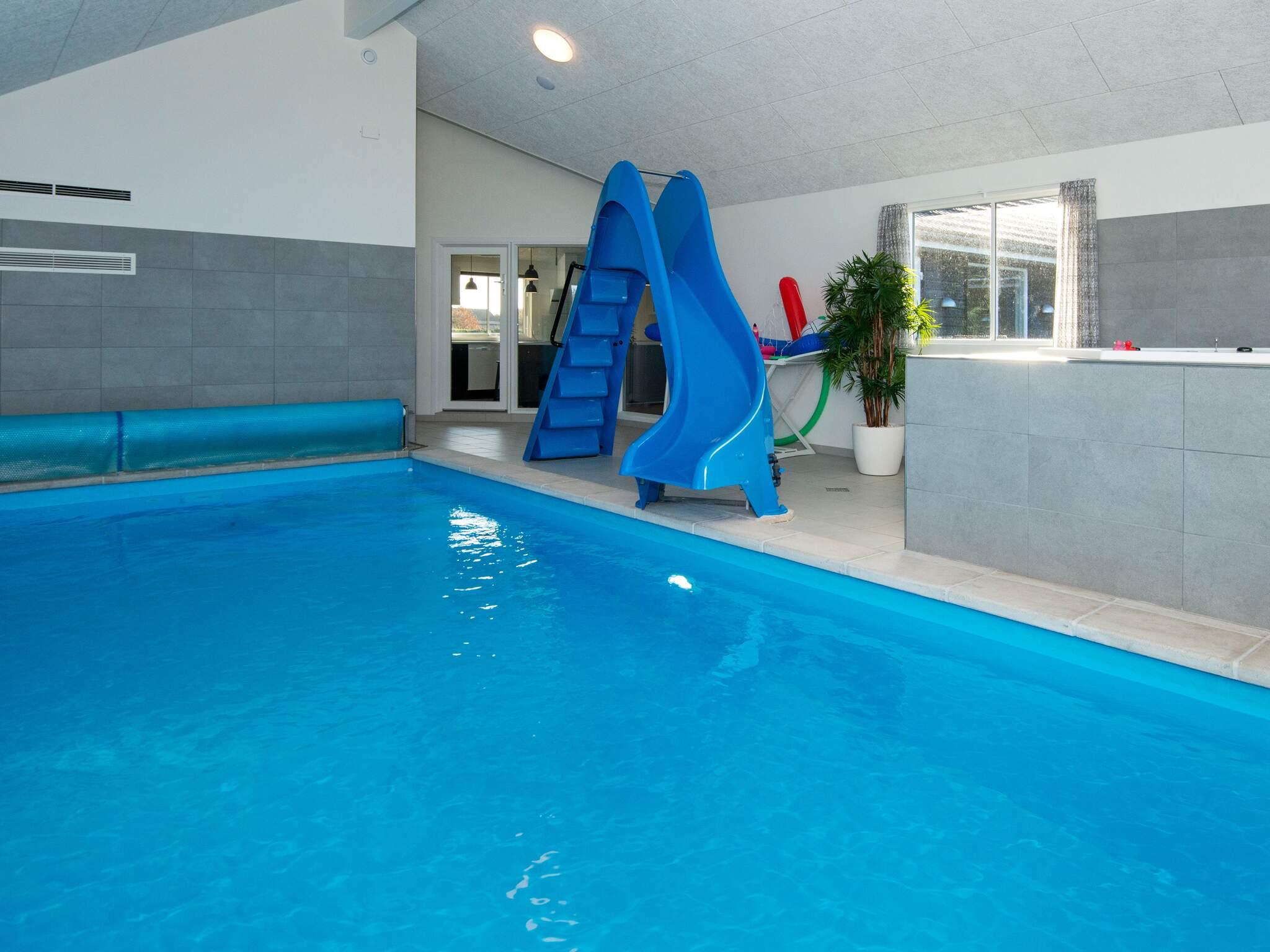 I husets ene fløj kan der både bades og svømmes i den 23 m2 store swimmingpool med vandrutsjebane, romersk trappe og modstrømsanlæg. Ønsker I at slappe helt af, kan I nyde det lækre 6-personers spabad eller saunaen, der også har plads til 6 personer.