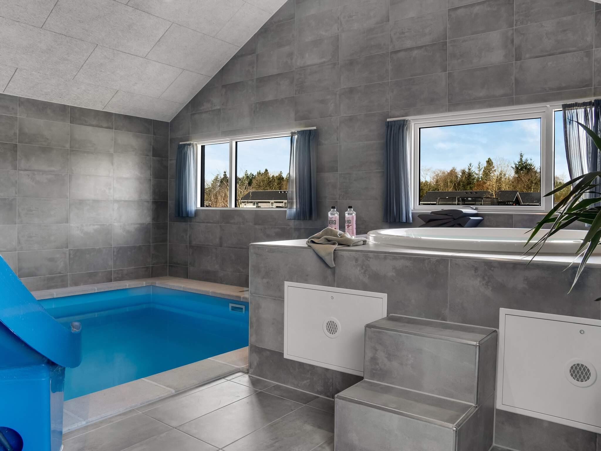 I sommerhusets indbydende poolafdeling kan I tage en dukkert i den 23 m² store swimmingpool, som har både vandrutsjebane, romersk trappe og modstrømsanlæg. For dem, der søger afslapning, er der adgang til både spabad og sauna, hvor I kan lade roen sænke sig.