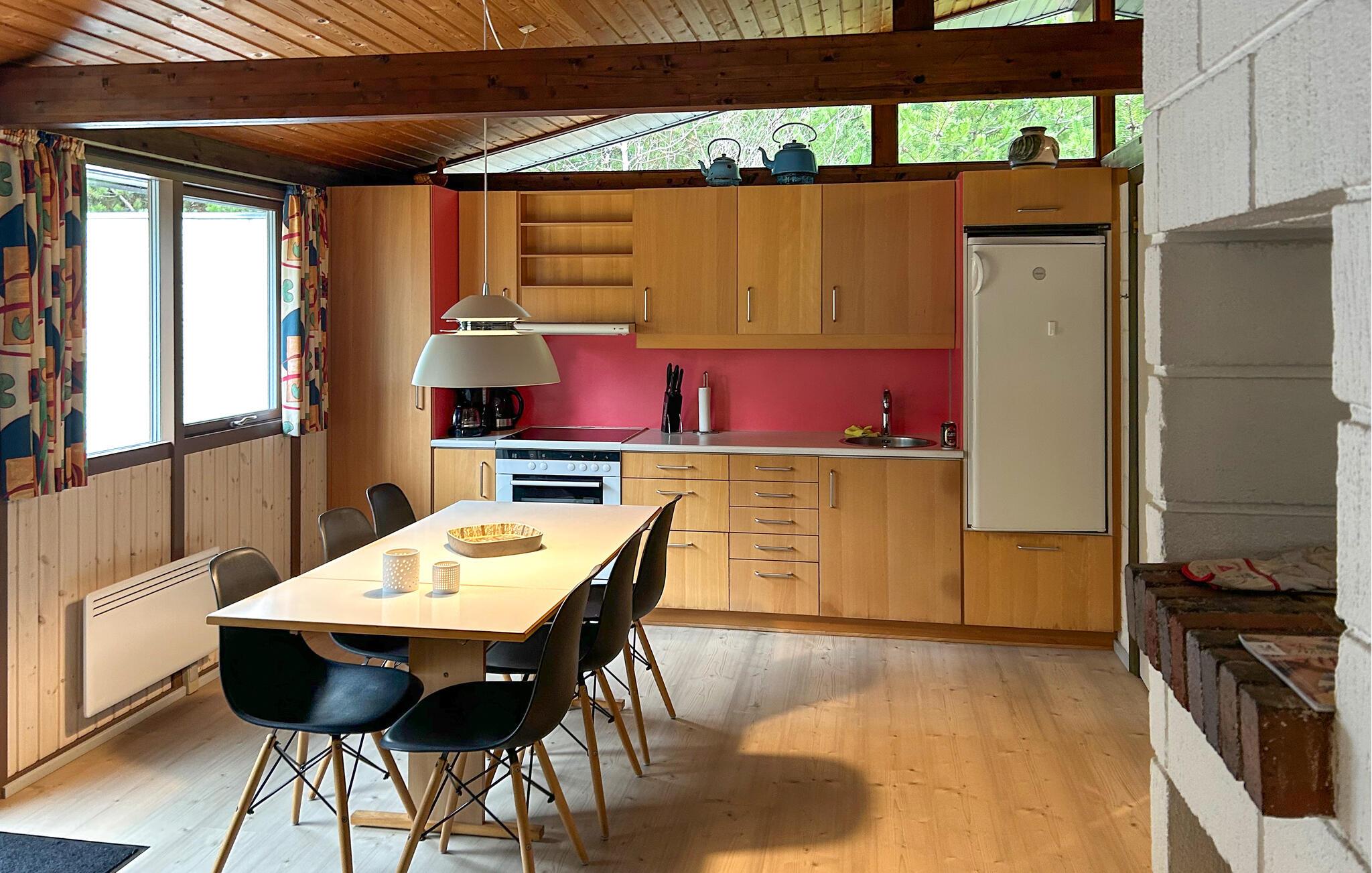 Lad ferien gå til Houstrup og dette fine sommerhus. Huset ligger på en grøn grund i et skovklædt område med flere sommerhuse. Det er indrettet med komfortable møbler og synlige loftsbjælker. Ved siden af sofagruppen er der en lukket pejs, der giver behagelig varme og hygge. Endvidere findes her 3 soveværelser med plads til i alt 6 personer samt et pænt badeværelse med gulvvarme.