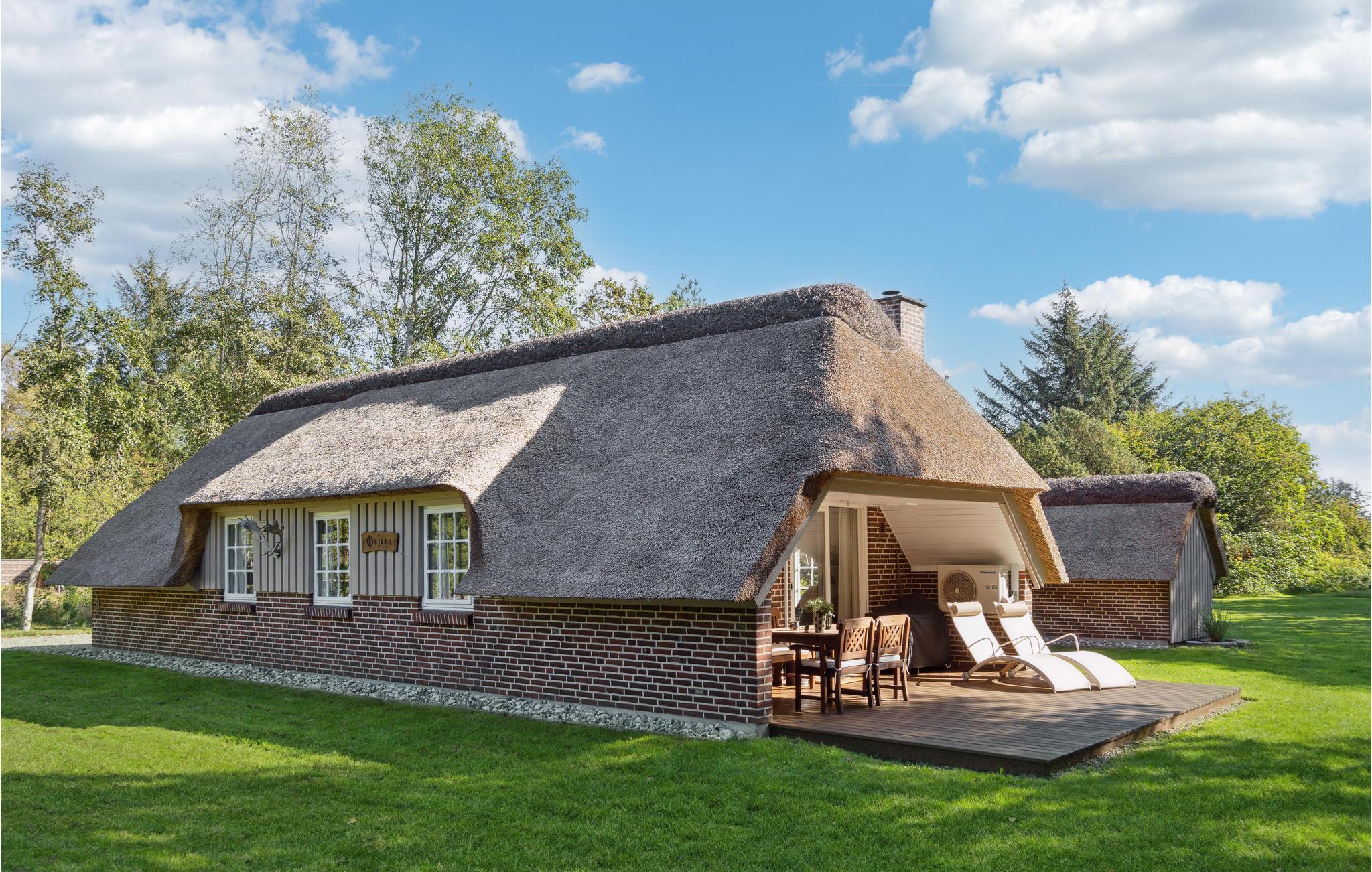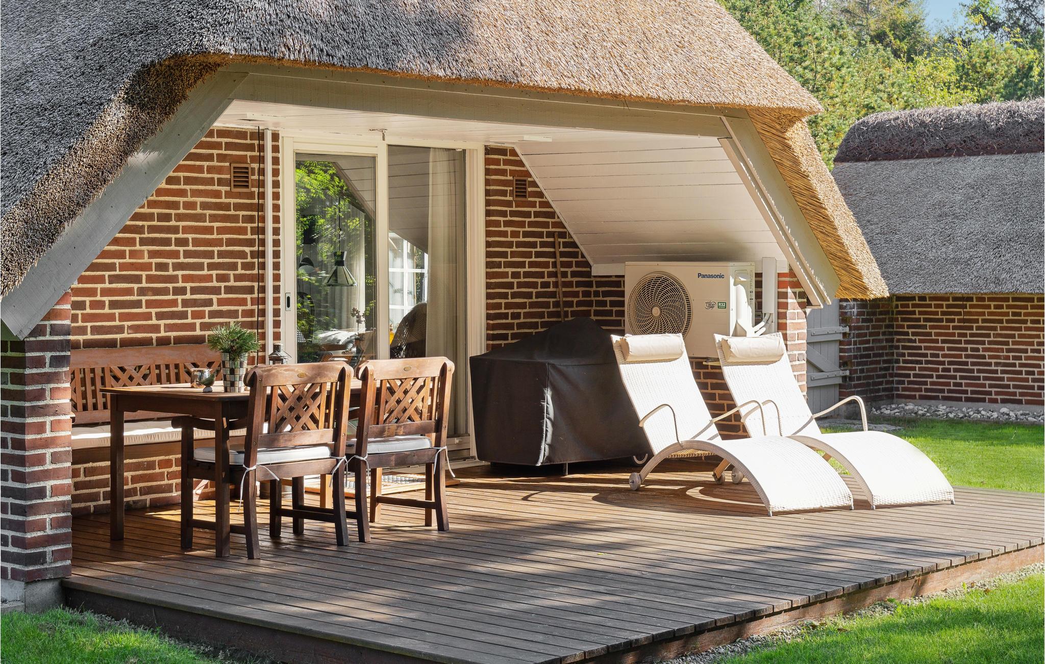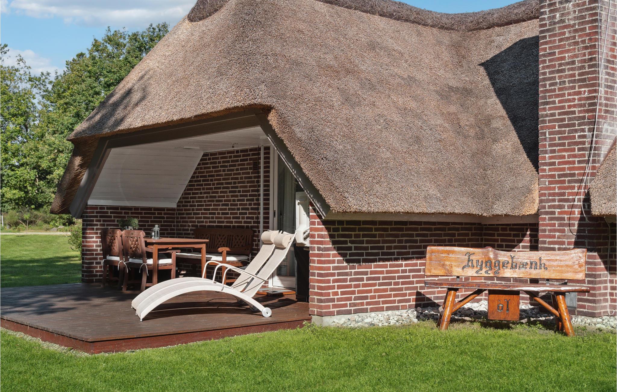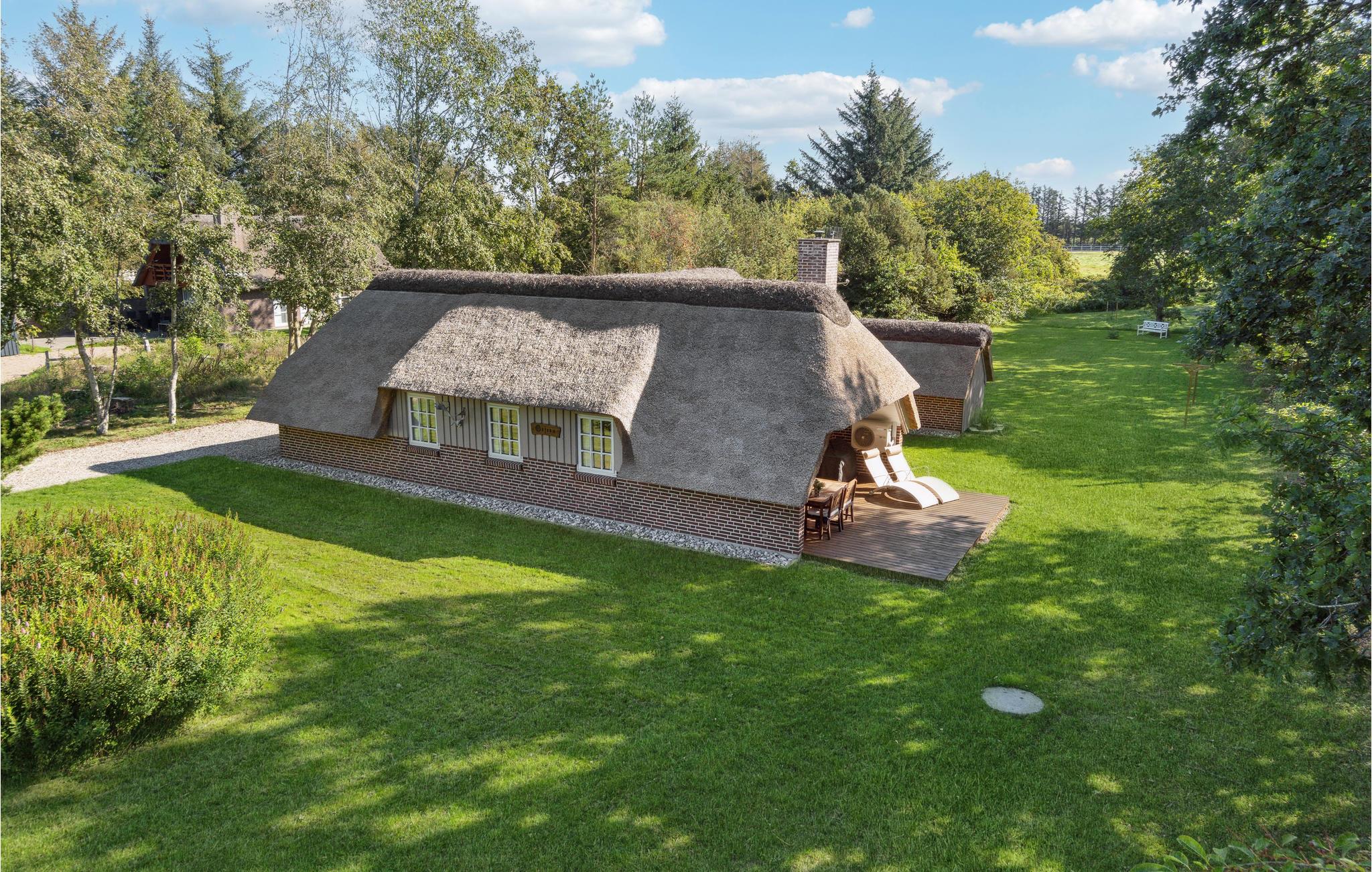 Hyggeligt stråtækt sommerhus nær Blåbjerg Klitplantage med to terrasser og stor naturgrund.