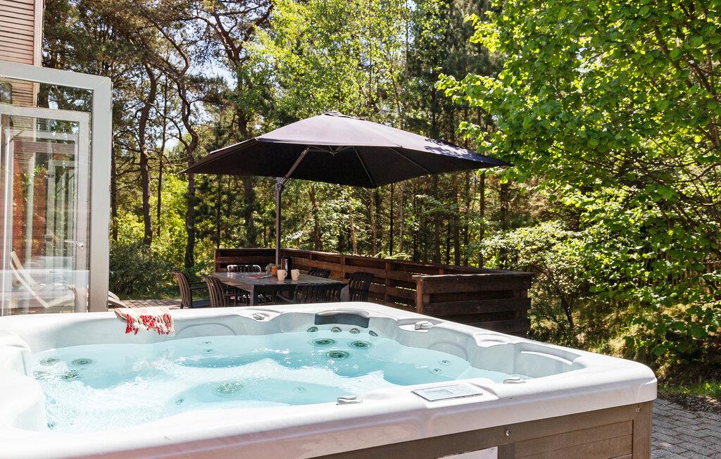 Dejligt swimmingpoolhus med sauna samt et udendørs spabad, beliggende på en stor, lukket og ugenert naturgrund ved Houstrup Strand.