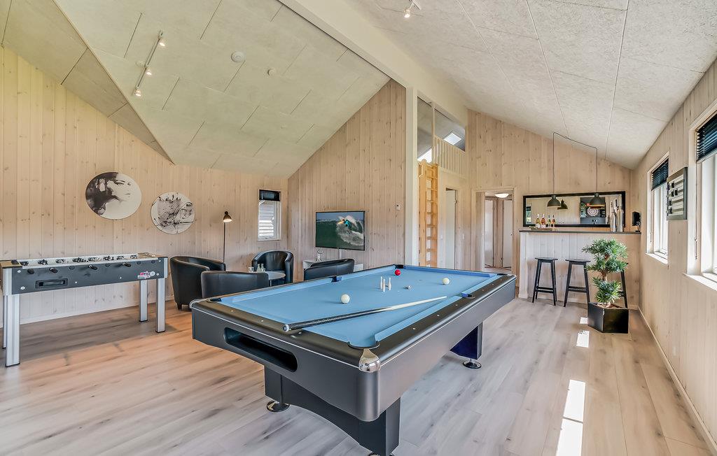 Dette luksuriøse feriehus er ideelt til en stor familie eller flere familier. Haven er indhegnet, så børn og hunde kan lege frit og trygt. Det komfortable køkken-alrum har en sofagruppe, TV og et langt spisebord med siddepladser til alle. På kølige aftener kan I nyde varmen fra brændeovnen og tilberede lækre måltider i det stilfulde køkken. Snup en dyst i et spil billard, bordtennis eller bordfodbold i aktivitetsrummet, mens tilskuerne får sig en kold forfriskning i baren. Huset har sit eget wellness-område med opvarmet swimmingpool, vandrutsjebane og modstrømssystem. I kan også slappe af i spabadet og nyde varmen fra saunaen.