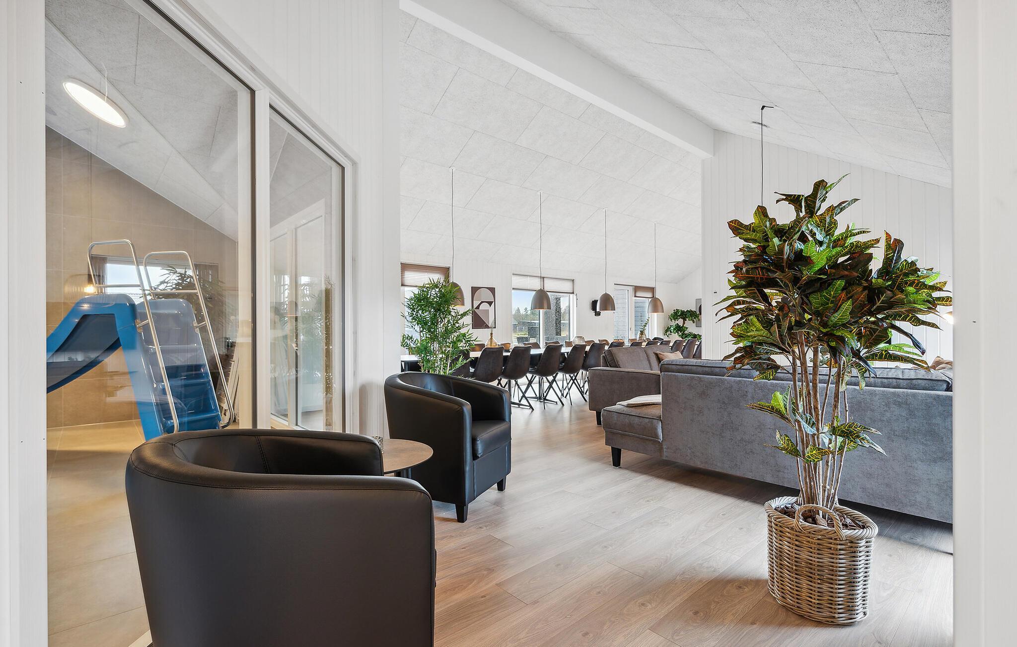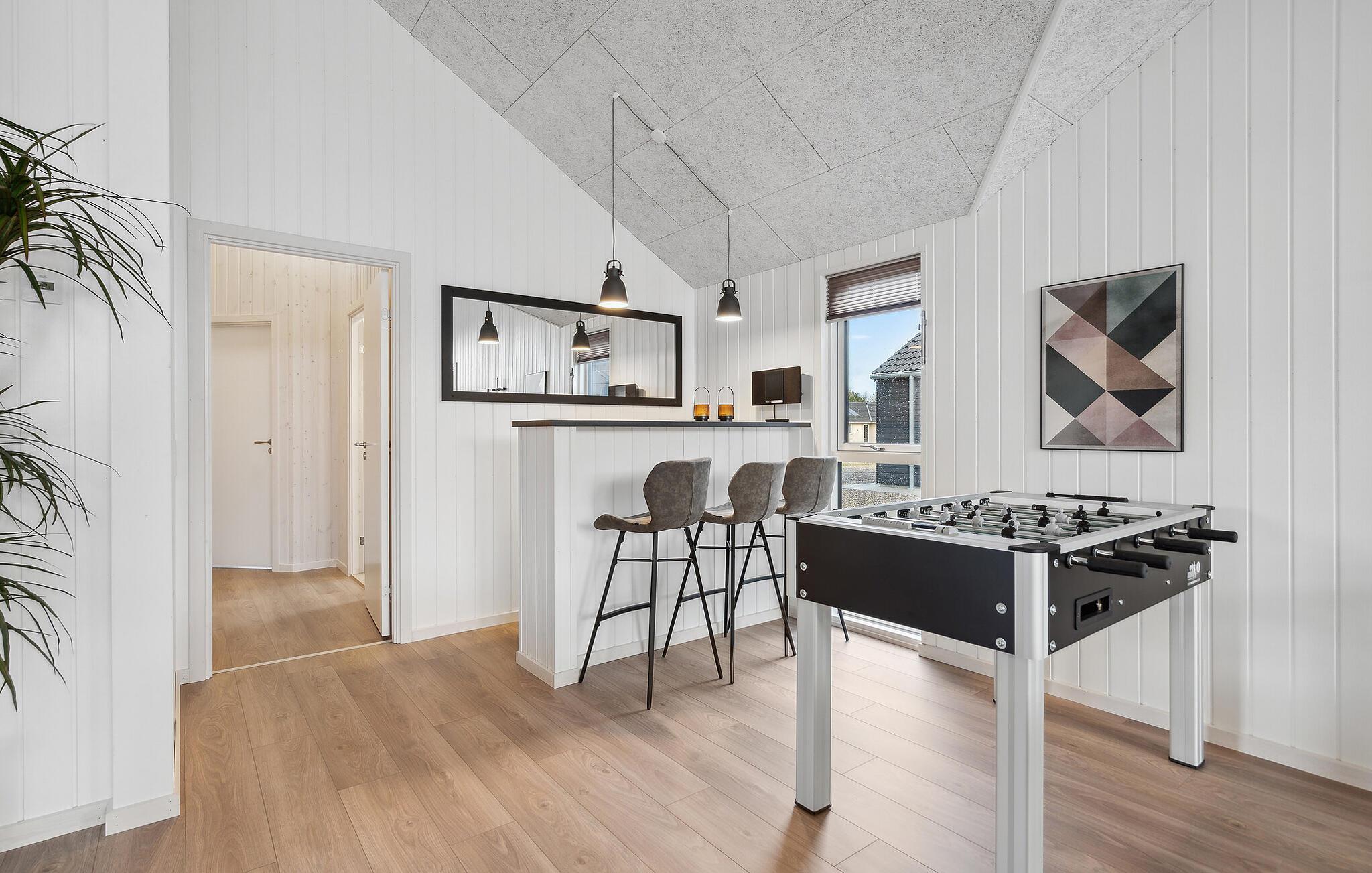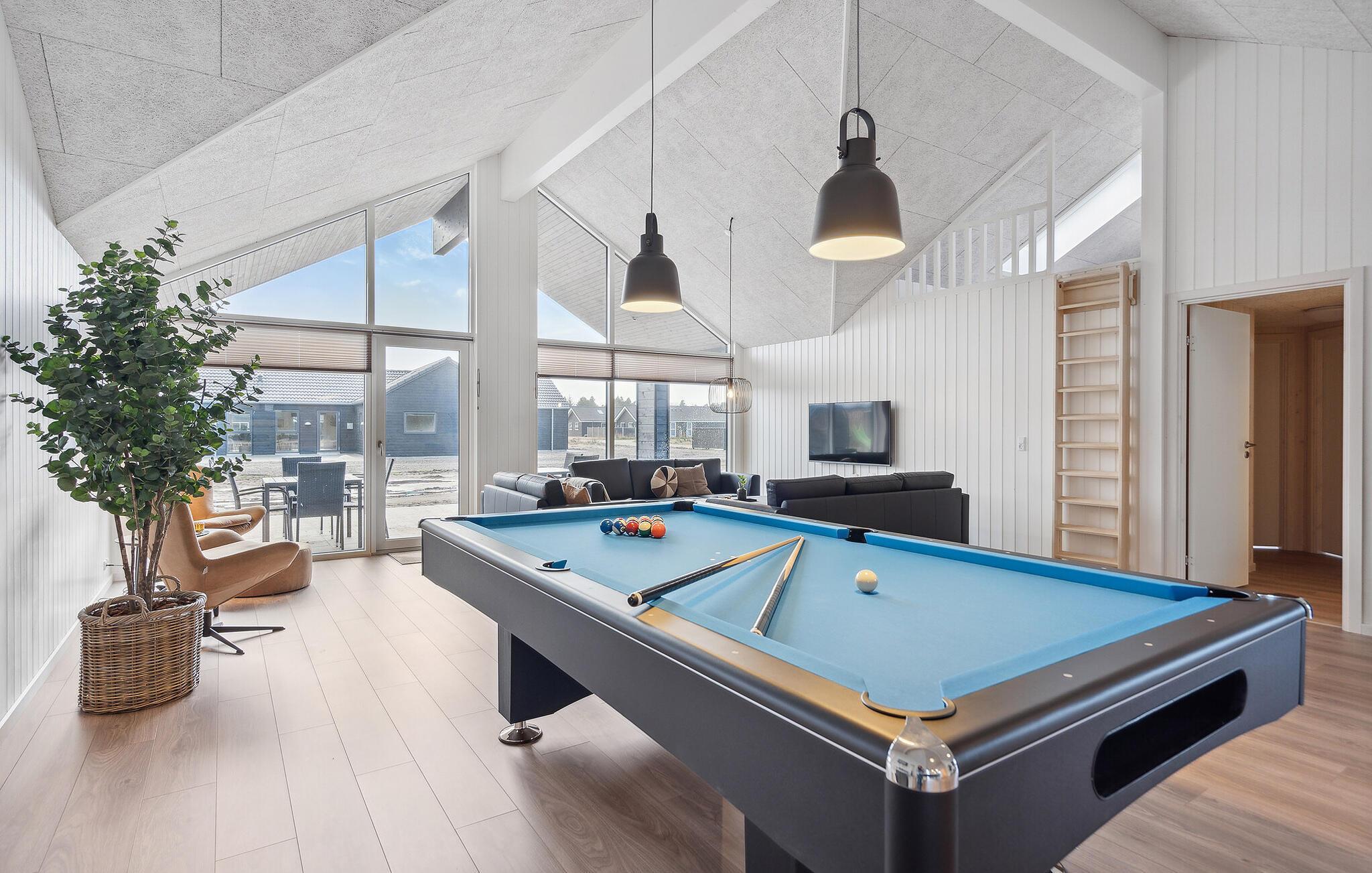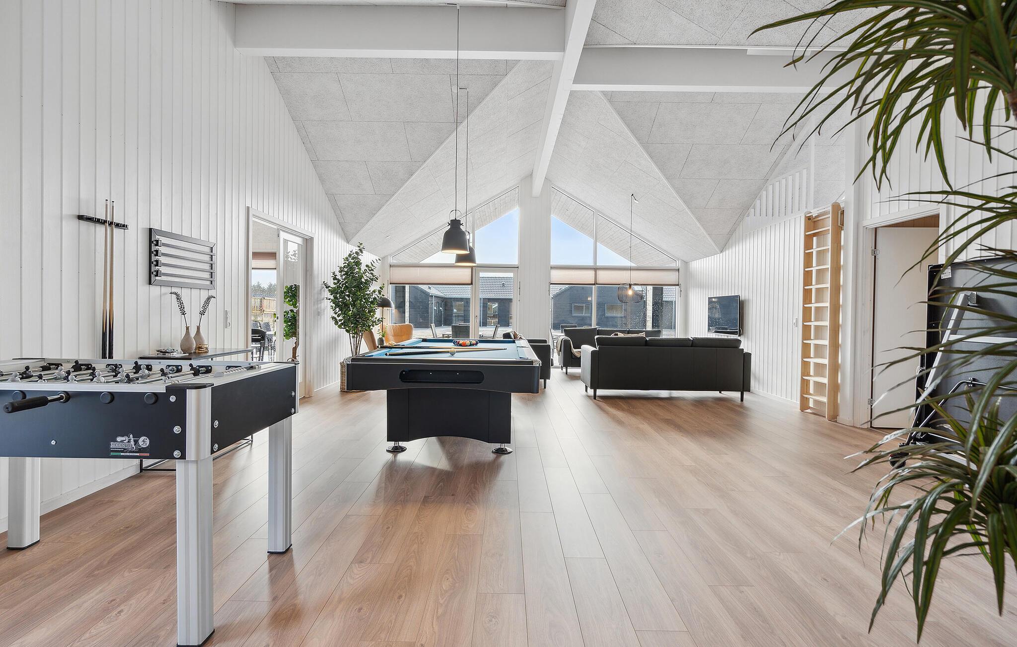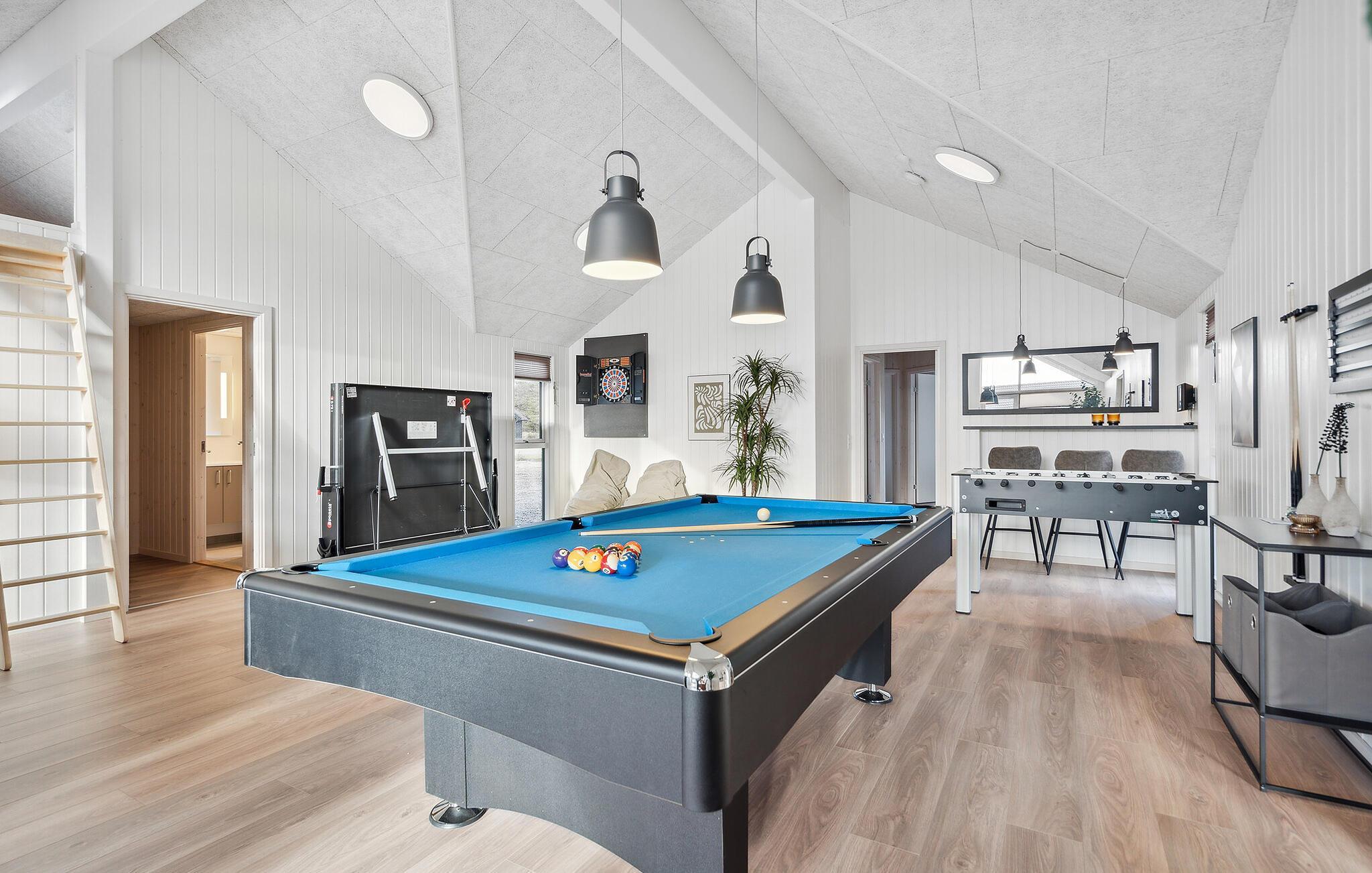 Det indre af dette sommerhus byder jer velkommen med et moderne design og rummelige, lyse værelser. Føl jer godt tilpas i den smagfuldt indrettede stue med en god film, spil billard eller Playstation5 og udfordr jer selv ved bordfodboldbordet. Forkæl jer selv med afslappende timer i jeres indendørs pool eller sauna. Tilbered kulinariske delikatesser sammen i køkkenet af høj kvalitet.