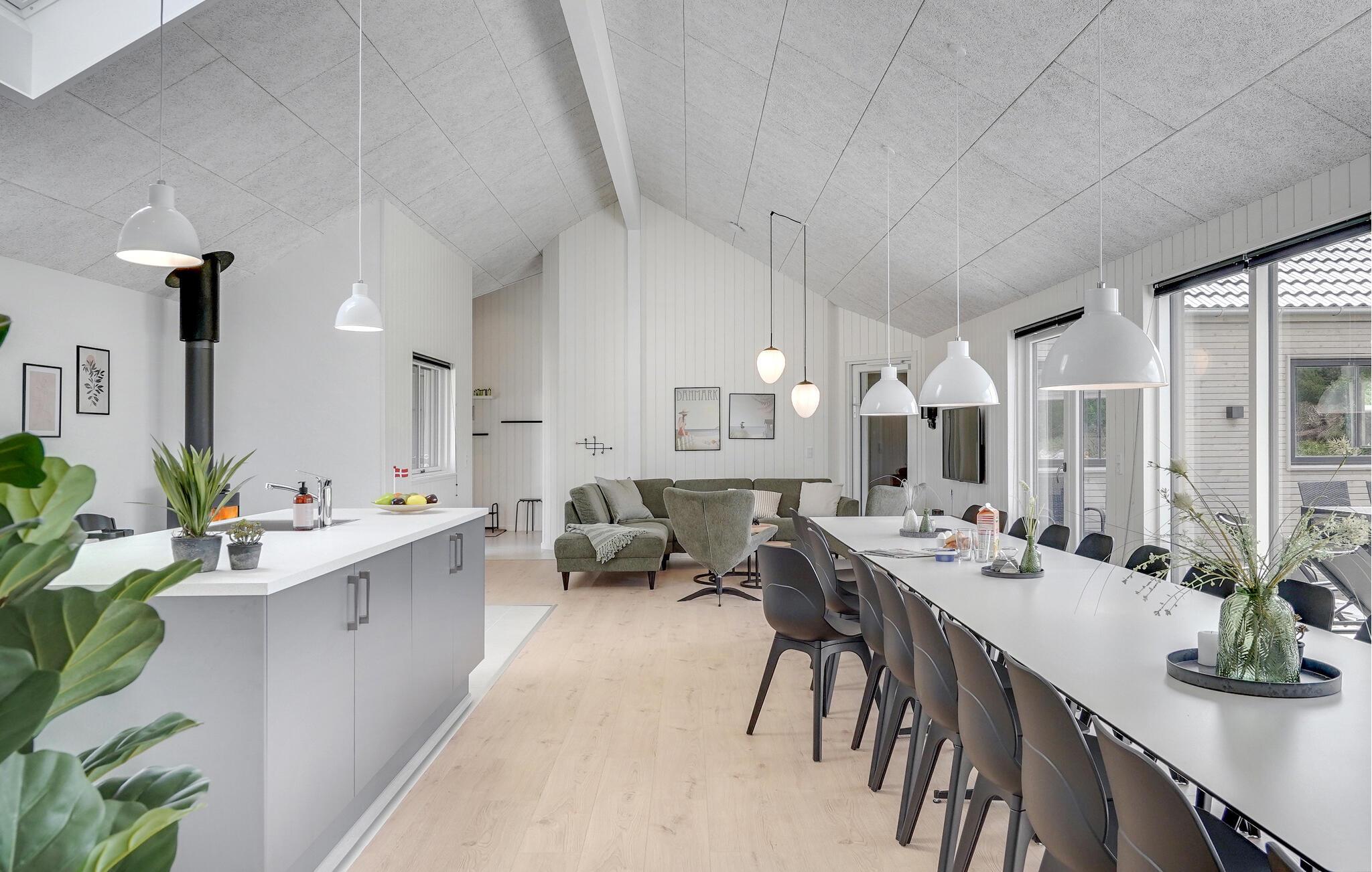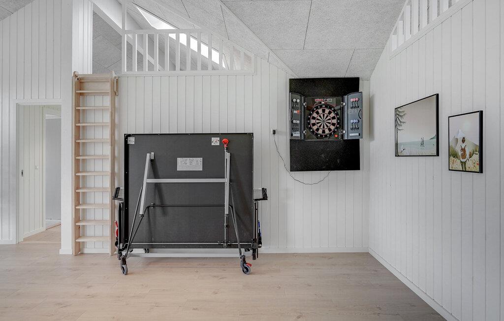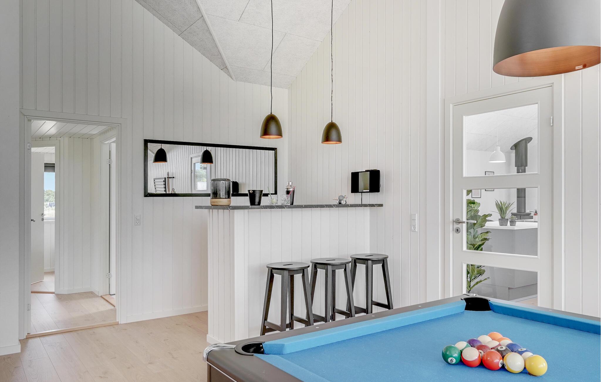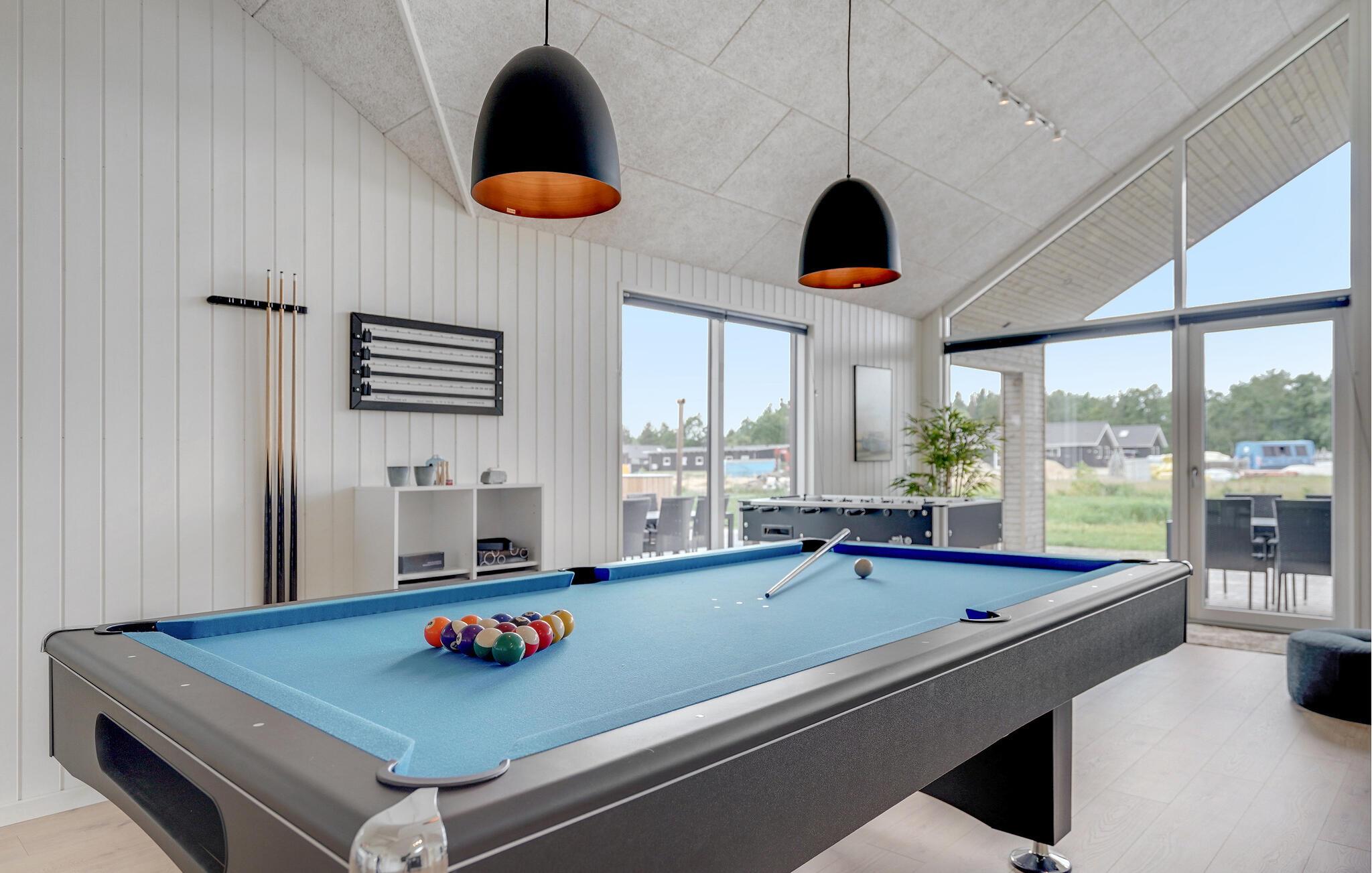 Det indre af dette sommerhus byder jer velkommen med et moderne design og rummelige, lyse værelser. Føl jer godt tilpas i den smagfuldt indrettede stue med en god film, spil billard, bordtennis eller Playstation4 og udfordr jer selv ved bordfodboldbordet. Forkæl jer selv med afslappende timer i jeres indendørs pool eller sauna. Tilbered kulinariske delikatesser sammen i køkkenet af høj kvalitet.