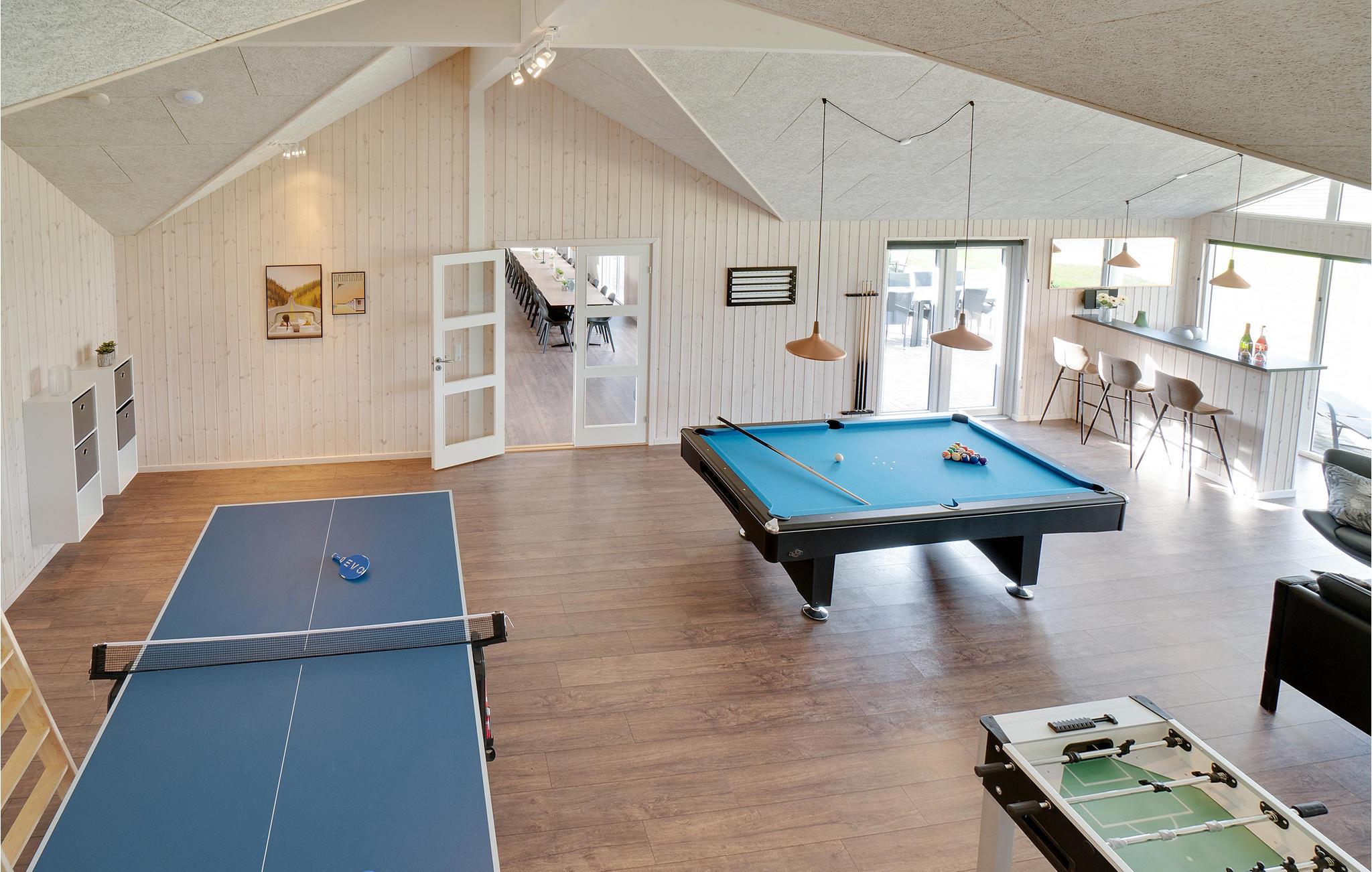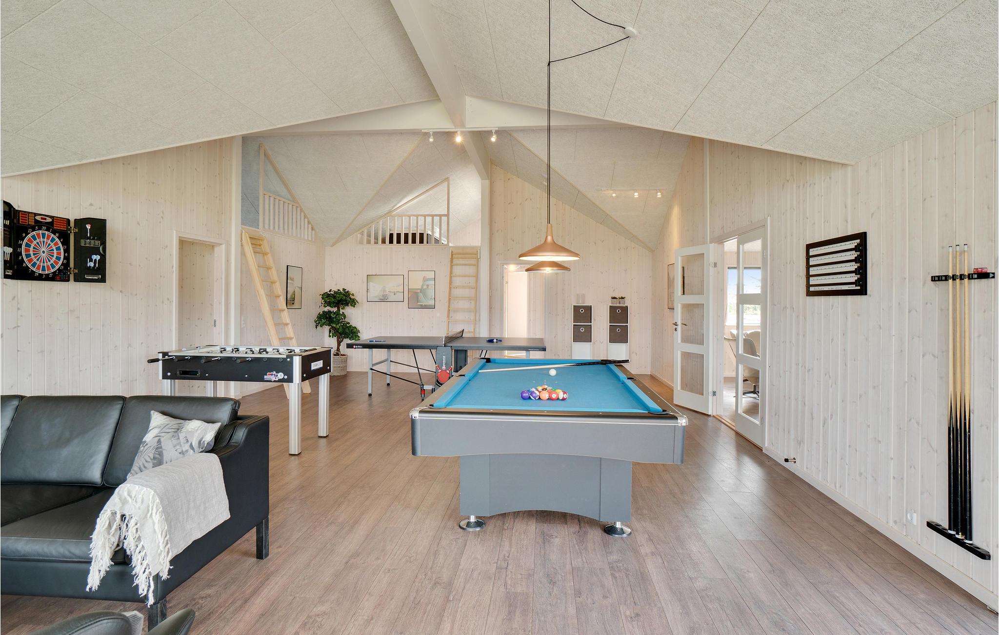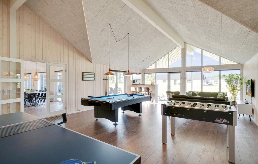 Leder I efter en komfortabel feriebolig, der tilbyder jer masser af plads og et varieret underholdningsprogram? Så har I fundet det helt rette sted. Det moderne feriehus er ideelt til jeres udvidede familie eller flere familier, der rejser sammen. Nyd jeres ophold i Houstrup, uanset årstid eller vejr, for her kommer I ikke til at kede jer. Inde i sommerhuset kan I spille bordfodbold, bordtennis eller afholde billardturneringer sammen, alt sammen i aktivitetsrummet nær den store stue, så alle kan være med. I kan også nyde swimmingpoolen uanset vejret. Slap af i spabadet, mens jeres børn morer sig med at rutsje og spille bold i poolen.