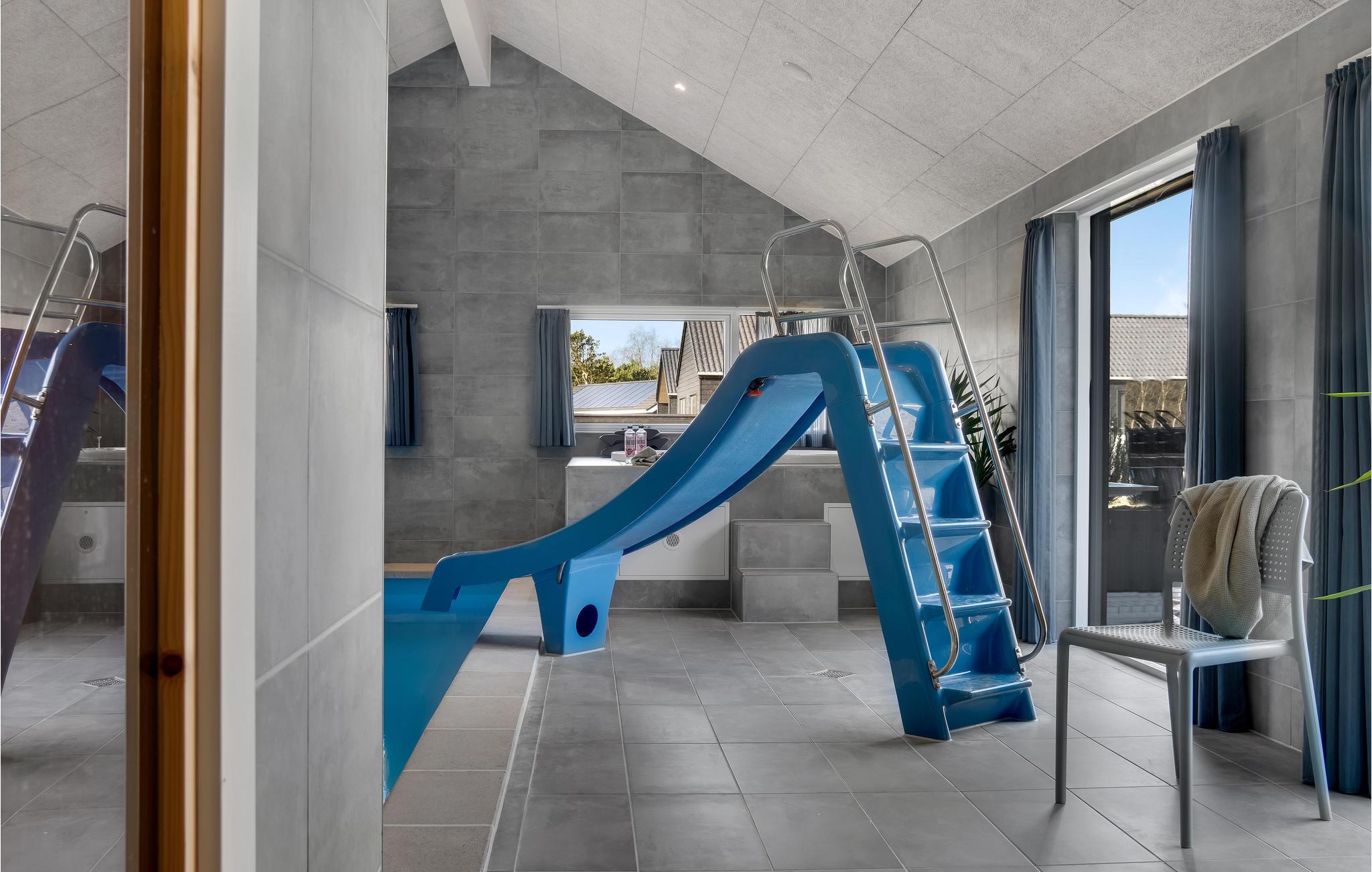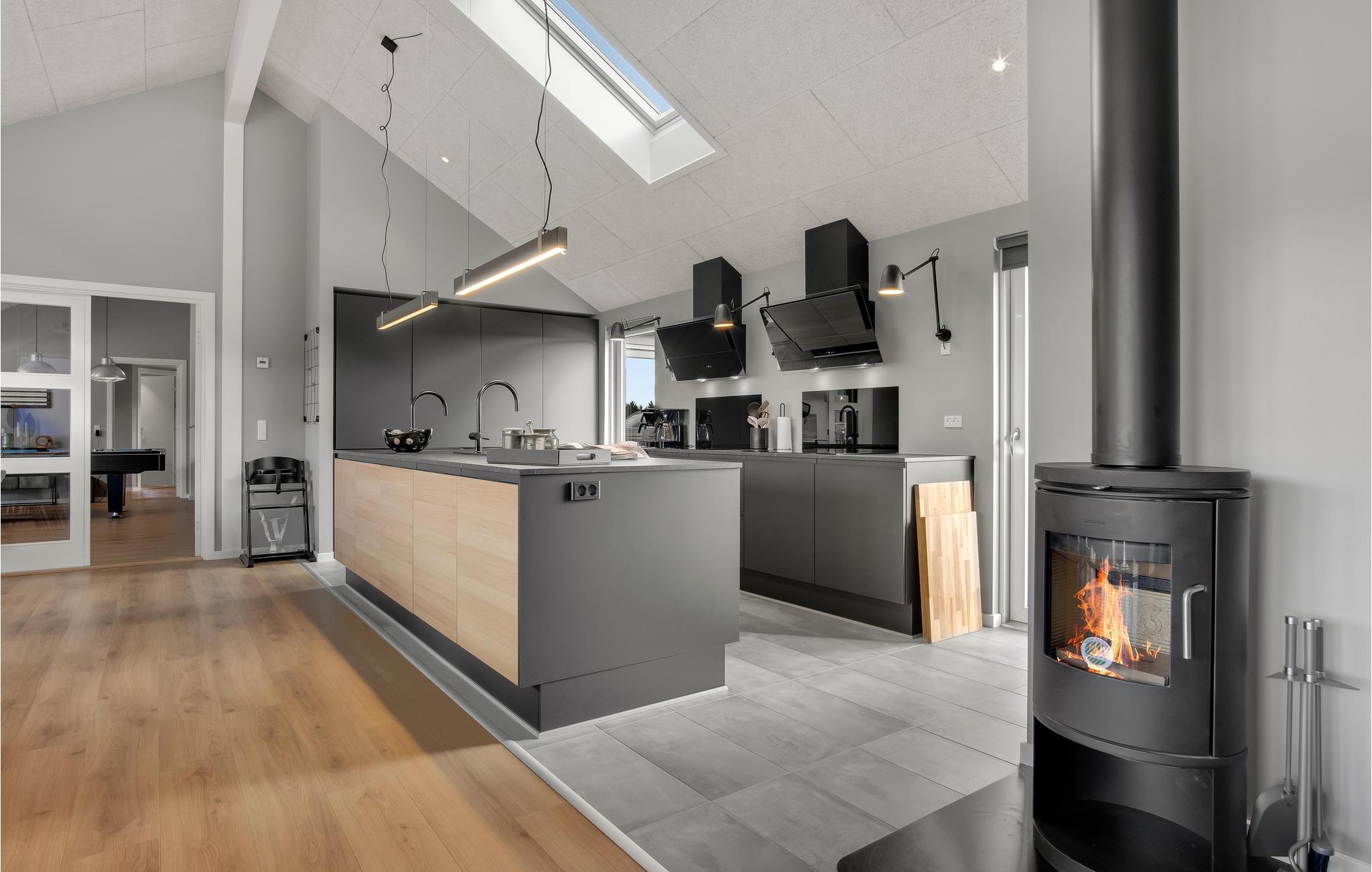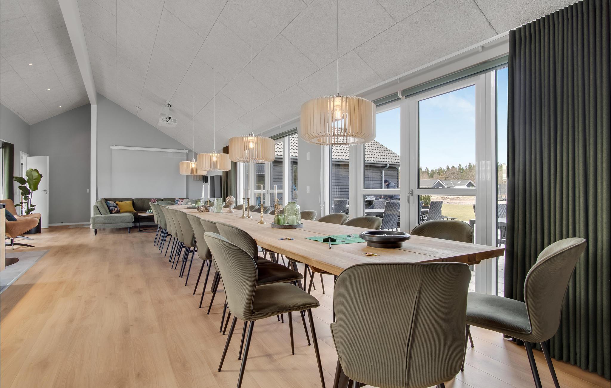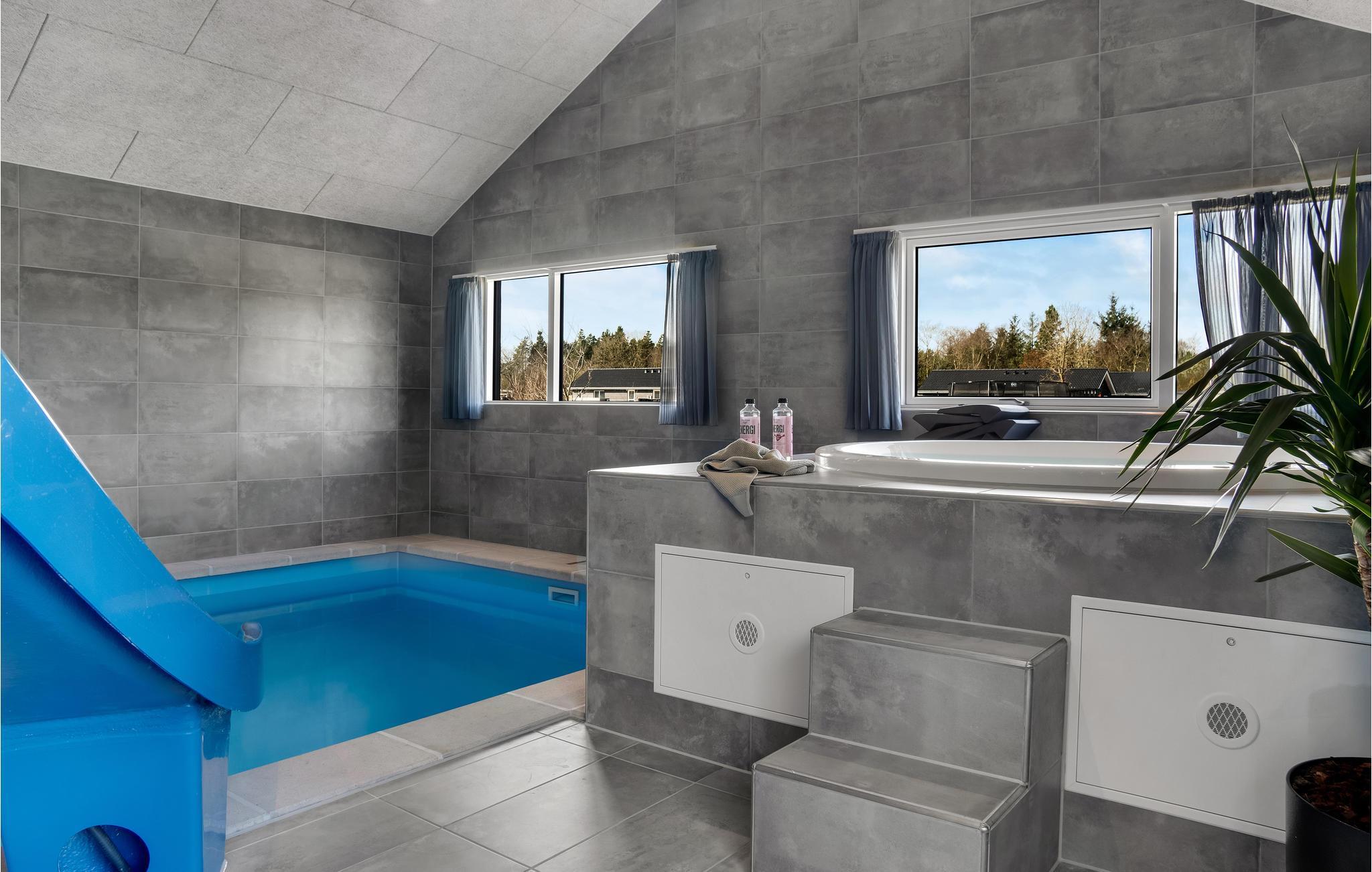Dette skønne feriehus med plads til flere familier ligger i Houstrup, ikke langt fra Vesterhavet. Her får I faciliteter af høj kvalitet og et stort udvalg af aktiviteter for store og små. I løbet af dagen kan I more jer med at spille billard eller bordtennis og af og til nyde en kold forfriskning i baren. Poolafdelingen inviterer til timevis af badesjov og byder også på muligheder for wellness i spabad og sauna. Om aftenen, efter en begivenhedsrig dag, kan I sammen tilberede lækre måltider i det rummelige, moderne køkken og nyde dem i godt selskab ved spisebordet. Den store terrasse byder på både solrige og skyggefulde hjørner, så I kan nyde sommervejret fuldt ud. Lad børnene hygge sig på trampolinen eller i legetårnet, mens I forbereder en lækker grillmiddag til hele selskabet.