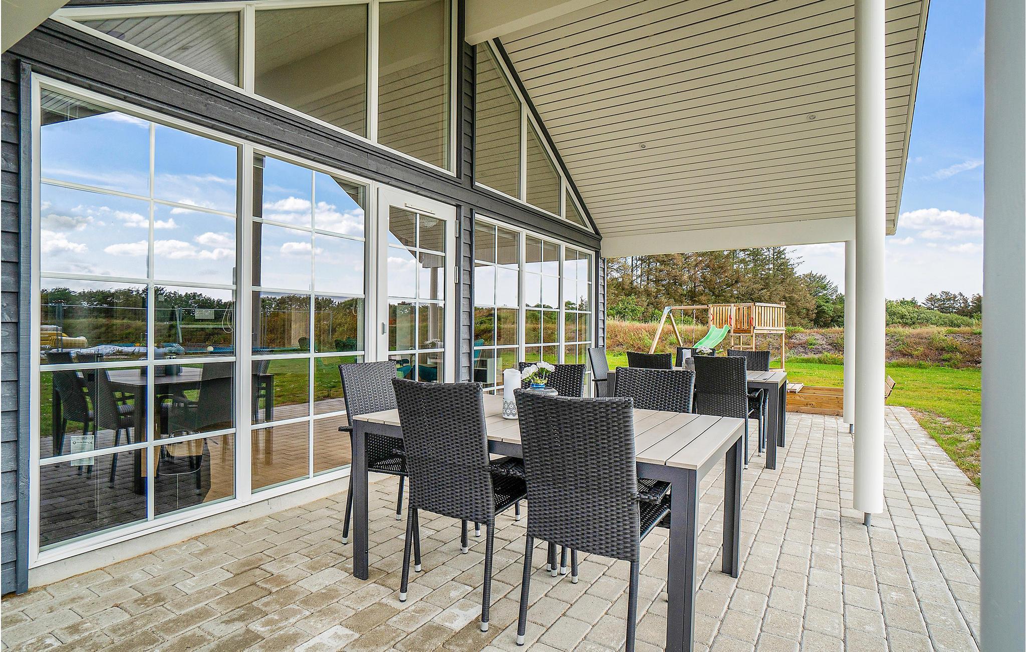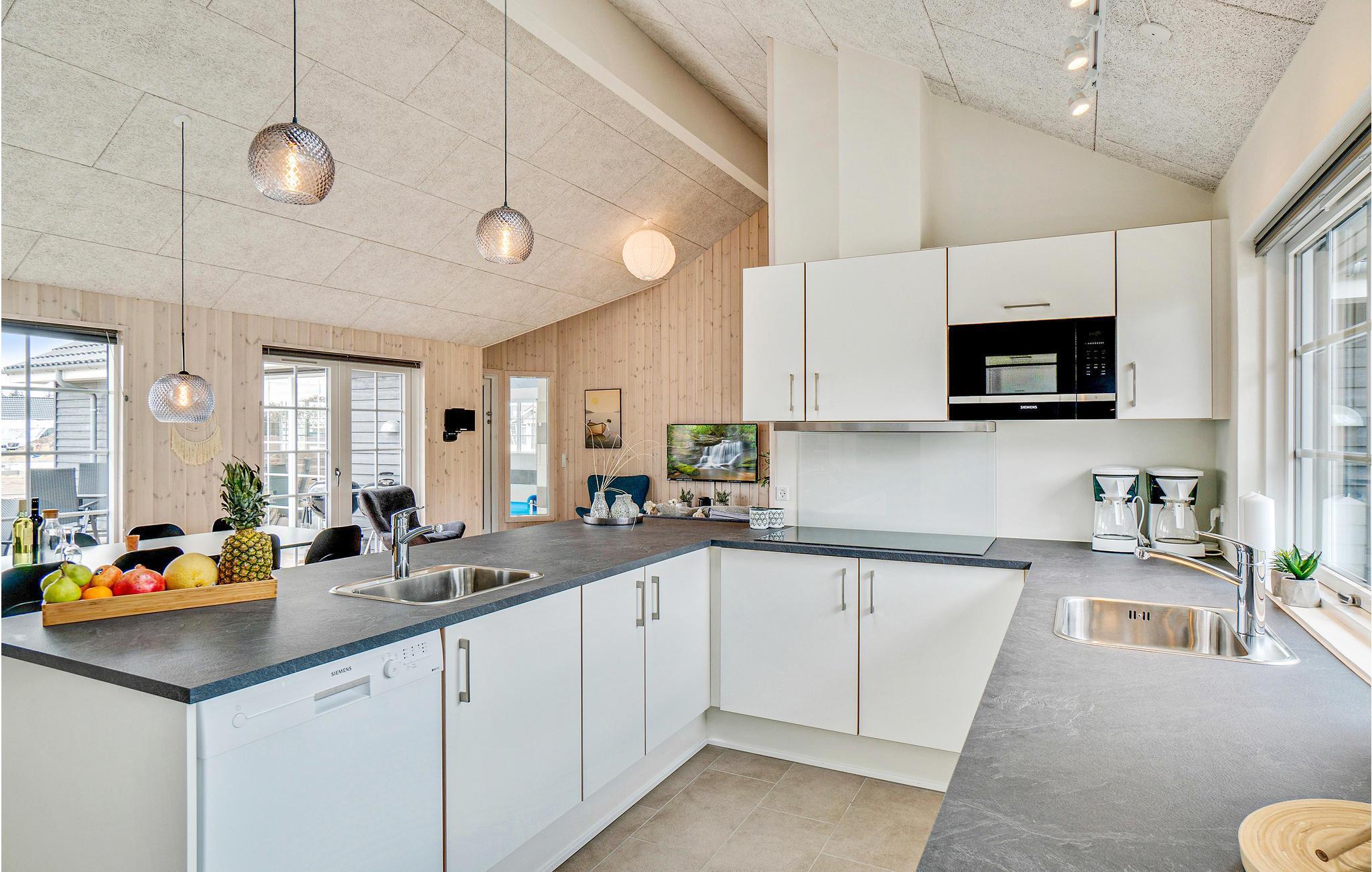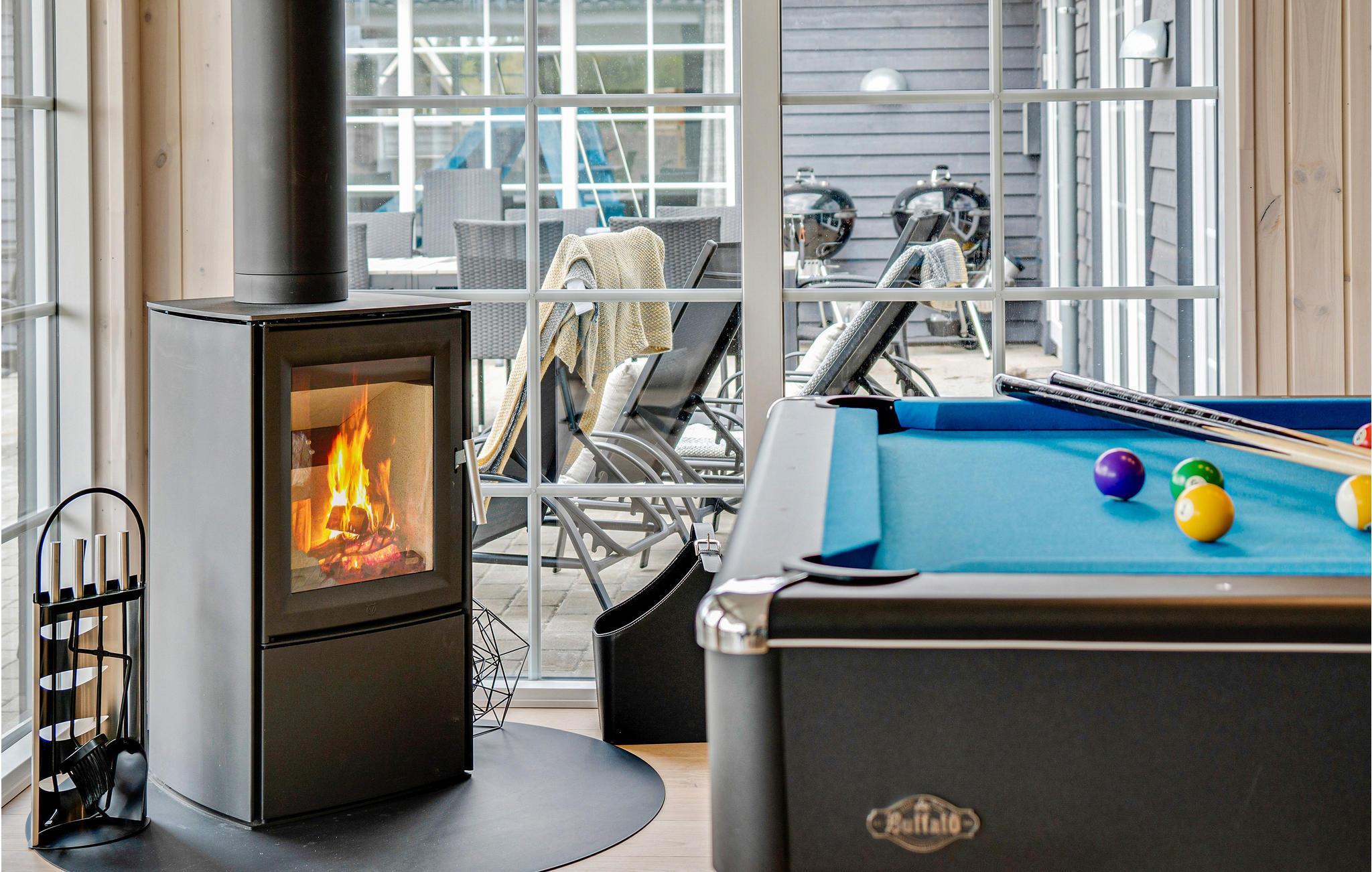 Her har I mulighed for en gennemført ferieoplevelse, uanset om I er til afslapning eller til aktiviteter. Er I til aktiv ferie, så har sommerhuset rigeligt at byde på, hvad angår indendørs aktiviteter. Aktivitetsrummet indeholder både billard, bordtennis og bordfodbold og fra baren i hjørnet kan tilskuerne nyde en kølig drink. I husets eget badeland kan I nyde godt af poolen med vandrutsjebane, modstrømsanlæg, stort spabad med plads til 4-6 personer og sauna. Det flotte, moderne køkken er stilfuldt indrettet og udstyret, og har direkte forbindelse til stuen hvor I finder spiseområdet med plads til alle husets gæster. Udendørs kan I hygge jer på den sydvendte terrasse som er delvist overdækket. Mens I nyder solen kan børnene lege på trampolin, gynge eller legetårnet med rutsjebanen. Senere kan I tilberede familiens livretter i den udendørs pizzaovn og nyde et lækkert måltid under aftensolen.