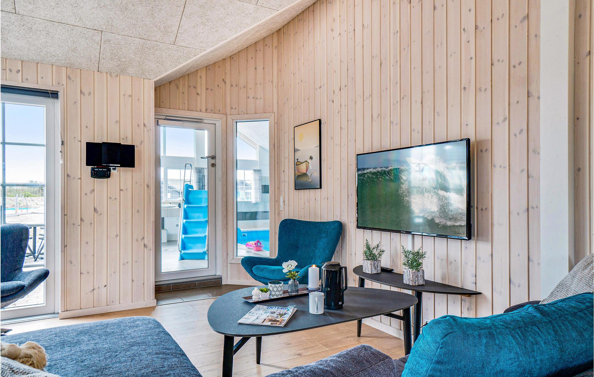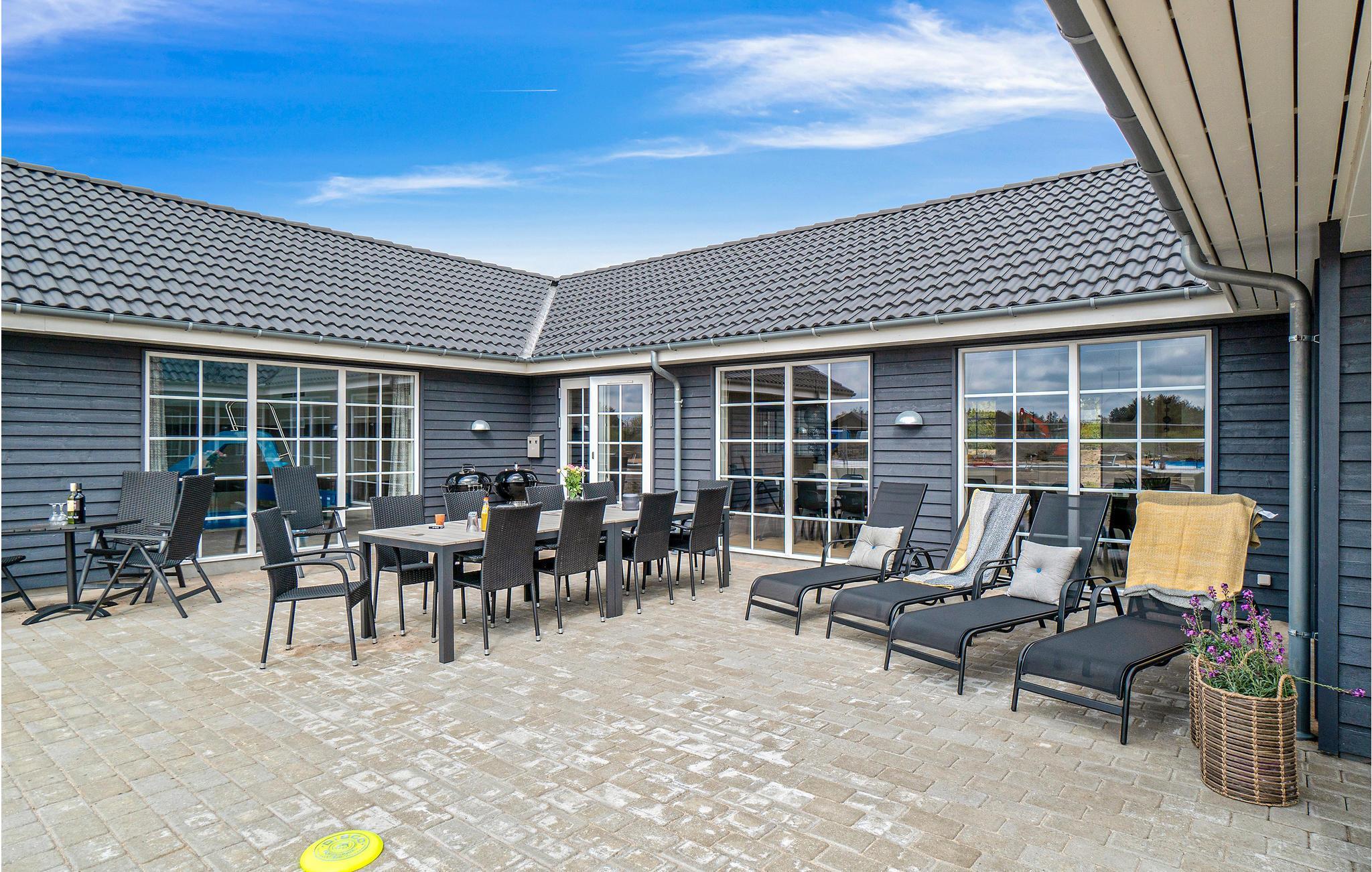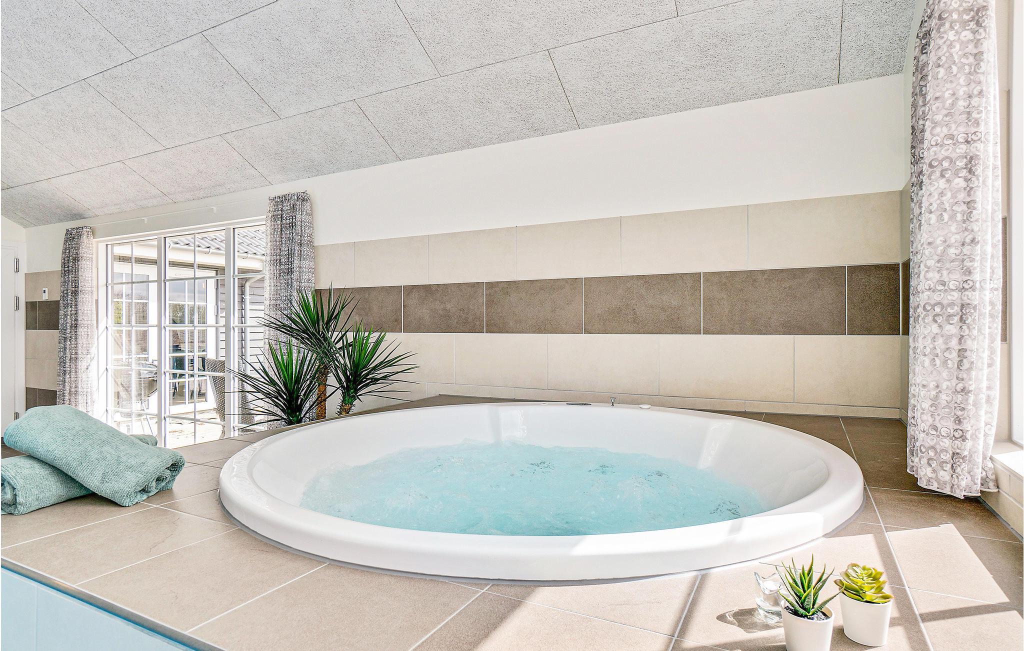 Her har I mulighed for en gennemført ferieoplevelse, uanset om I er til afslapning eller til aktiviteter. Er I til aktiv ferie, så har sommerhuset rigeligt at byde på, hvad angår indendørs aktiviteter. Aktivitetsrummet indeholder både billard, bordtennis og bordfodbold og fra baren i hjørnet kan tilskuerne nyde en kølig drink. I husets eget badeland kan I nyde godt af poolen med vandrutsjebane, modstrømsanlæg, stort spabad med plads til 4-6 personer og sauna. Det flotte, moderne køkken er stilfuldt indrettet og udstyret, og har direkte forbindelse til stuen hvor I finder spiseområdet med plads til alle husets gæster. Udendørs kan I hygge jer på den sydvendte terrasse som er delvist overdækket. Mens I nyder solen kan børnene lege på trampolin, gynge eller legetårnet med rutsjebanen. Senere kan I tilberede familiens livretter i den udendørs pizzaovn og nyde et lækkert måltid under aftensolen.
