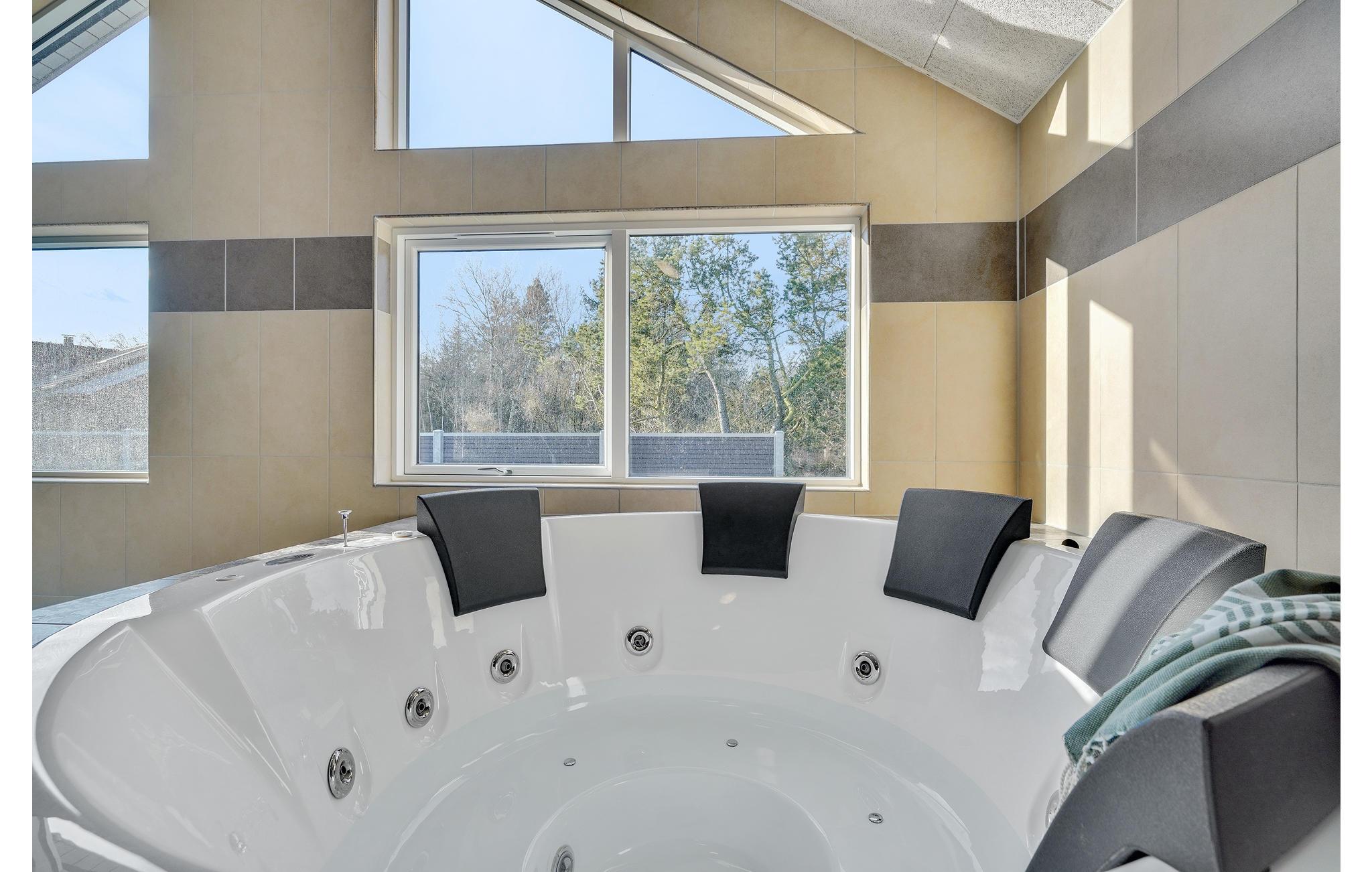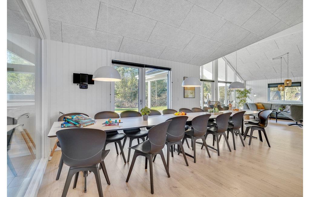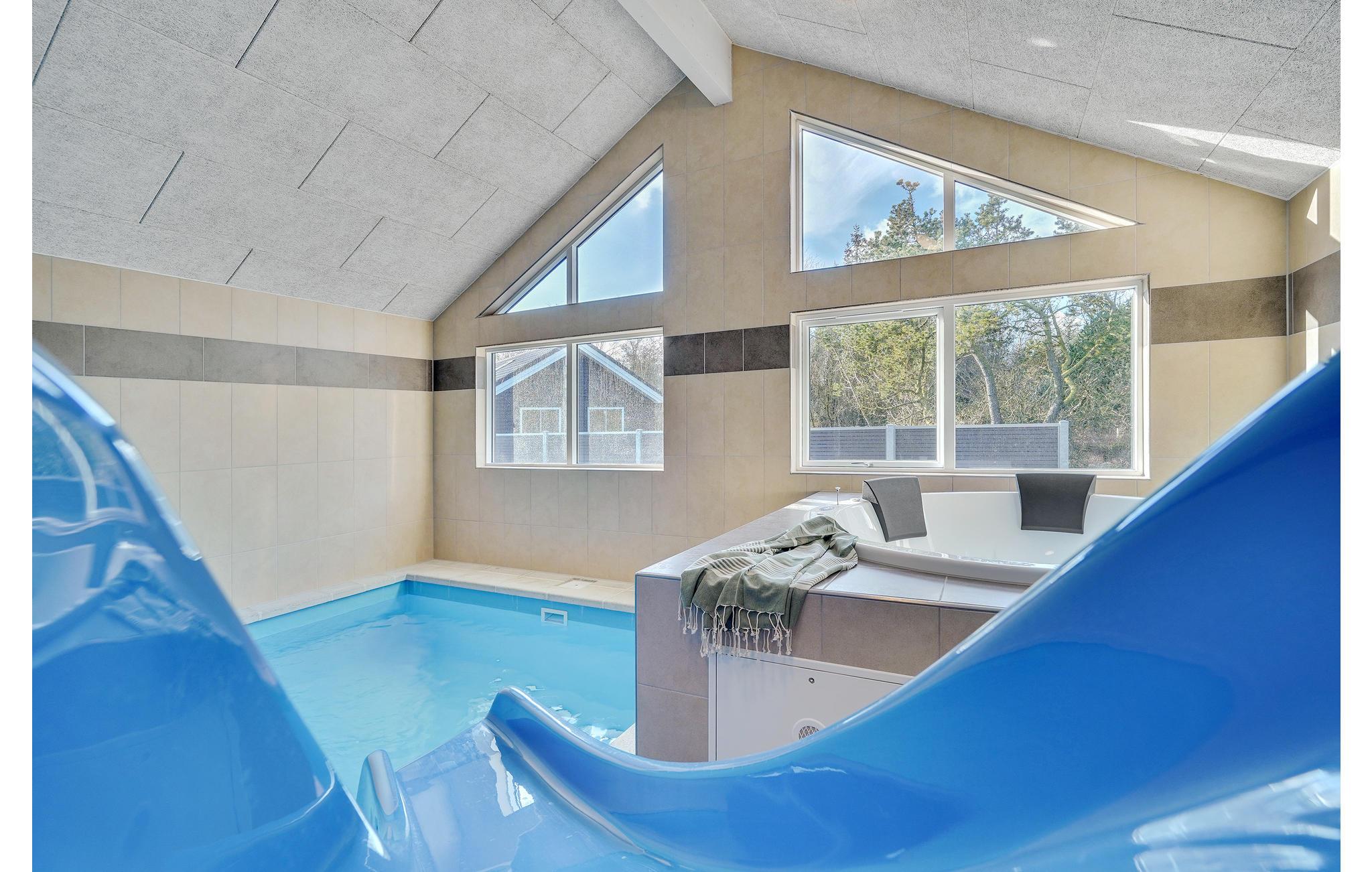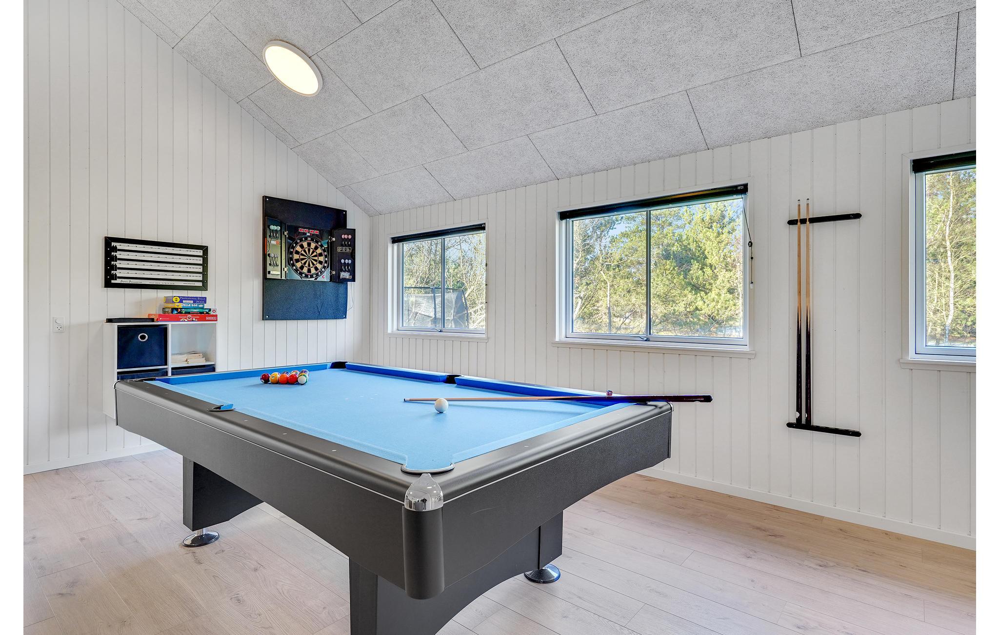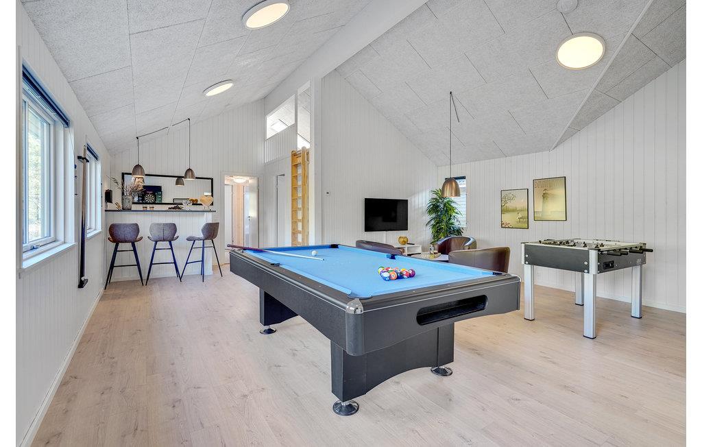 Velkommen til et stort og moderne feriehus, hvor der er god plads til at fejre en begivenhed i familien eller tage af sted med jeres gode venner. Måske vil I begynde dagene med at svømme et par baner i poolen eller lade børnene få en rutsjetur fra morgenstunden, inden dagen går i gang med planlægning og udflugter. Senere kan I få varmen i saunaen eller spabadet efter en lang gåtur ved stranden. Huset er lavet til alle vejrforhold og årstider, for aktivitetsrummet byder på mange timers underholdning. Snup et spil billard, dart og bordfodbold eller måske et brætspil. I kan også tilbringe hyggelige aftener på den overdækkede terrasse. Her kan I sætte jer mageligt til rette, mens de små leger i sandkassen og de store børn spiller fodbold på græsplænen.