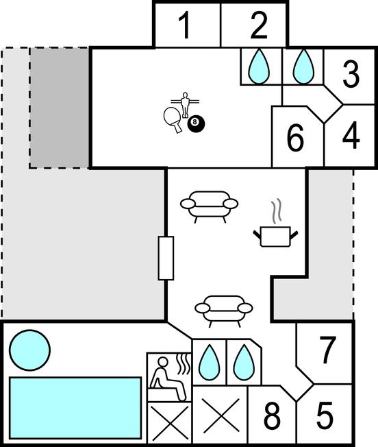 I sommerhusets aktivitetsrum er der en række forskellige faciliteter. Her kan I spille bordtennis, bordfodbold, billard eller dart. Aktivitetslokalet har også en bar med køleskab, hvor man kan sørge for kolde drikkevarer til spillerne. Efter vilde dueller kan I slappe af i rummets sofagruppe, hvor I kan se en film eller et spil på PS4 på tv'et.