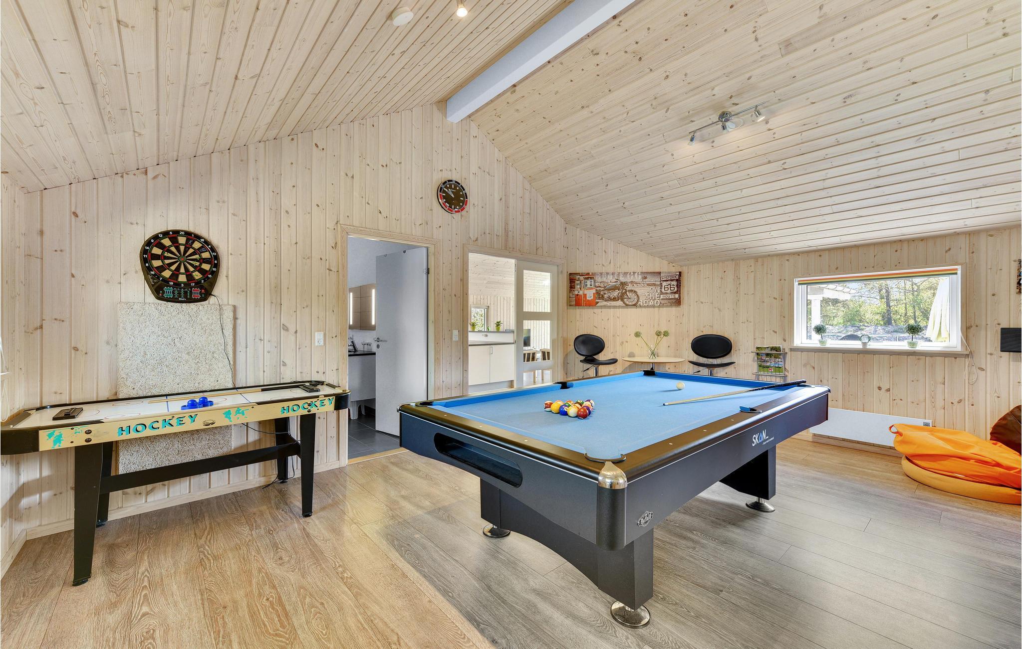 Huset er indrettet med en skøn lys stue med et godt lysindfald, et meget velfungerende køkken som ligger i forbindelse med stuen og herfra er der adgang til husets aktivitetsrum med forskellige spillemuligheder. To flotte badeværelser, hvor der i det store badeværelse er spabad med adgang til sauna. De fire soveværelser samt hemsen giver god plads til 12 personer.