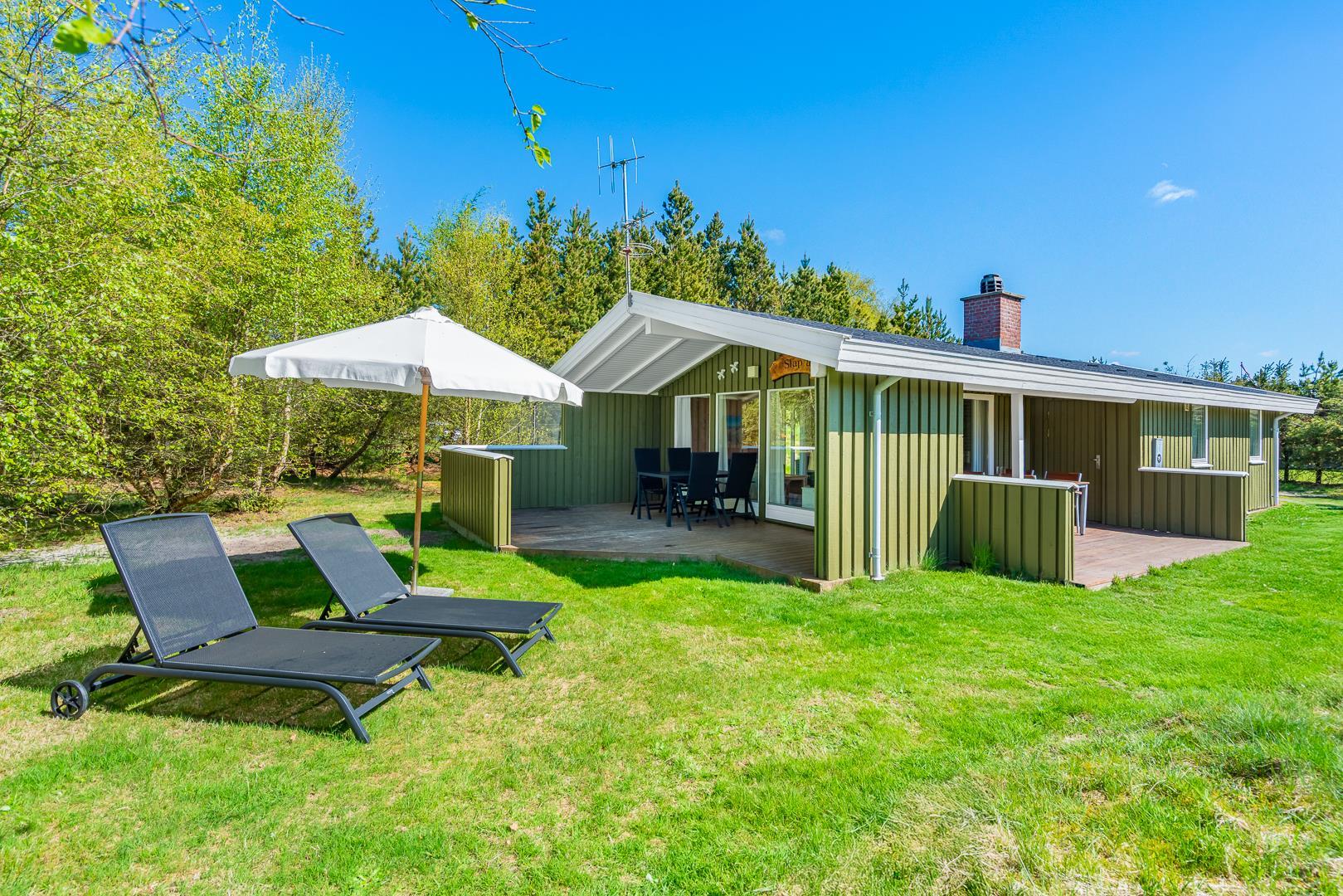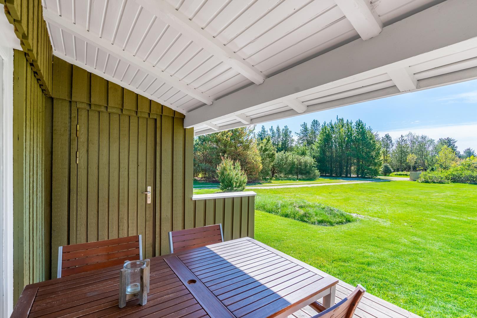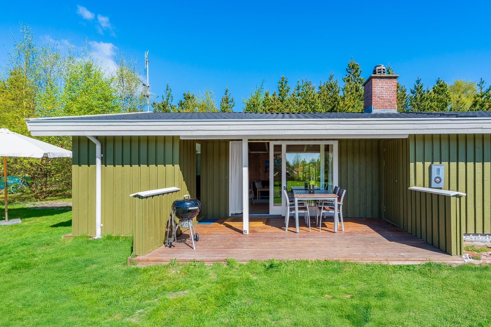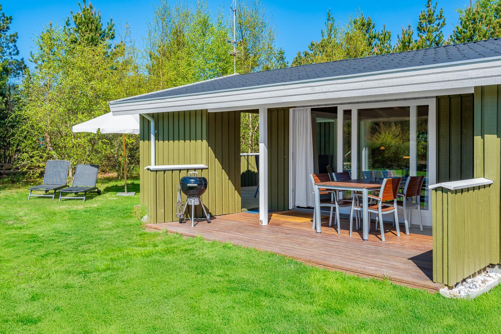 Udendørs finder I to dejlige terrasser med havemøbler og liggestole, hvor solen og de rolige omgivelser kan nydes dagen lang.